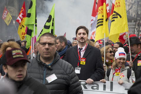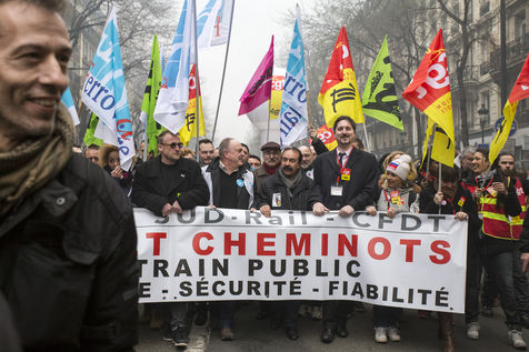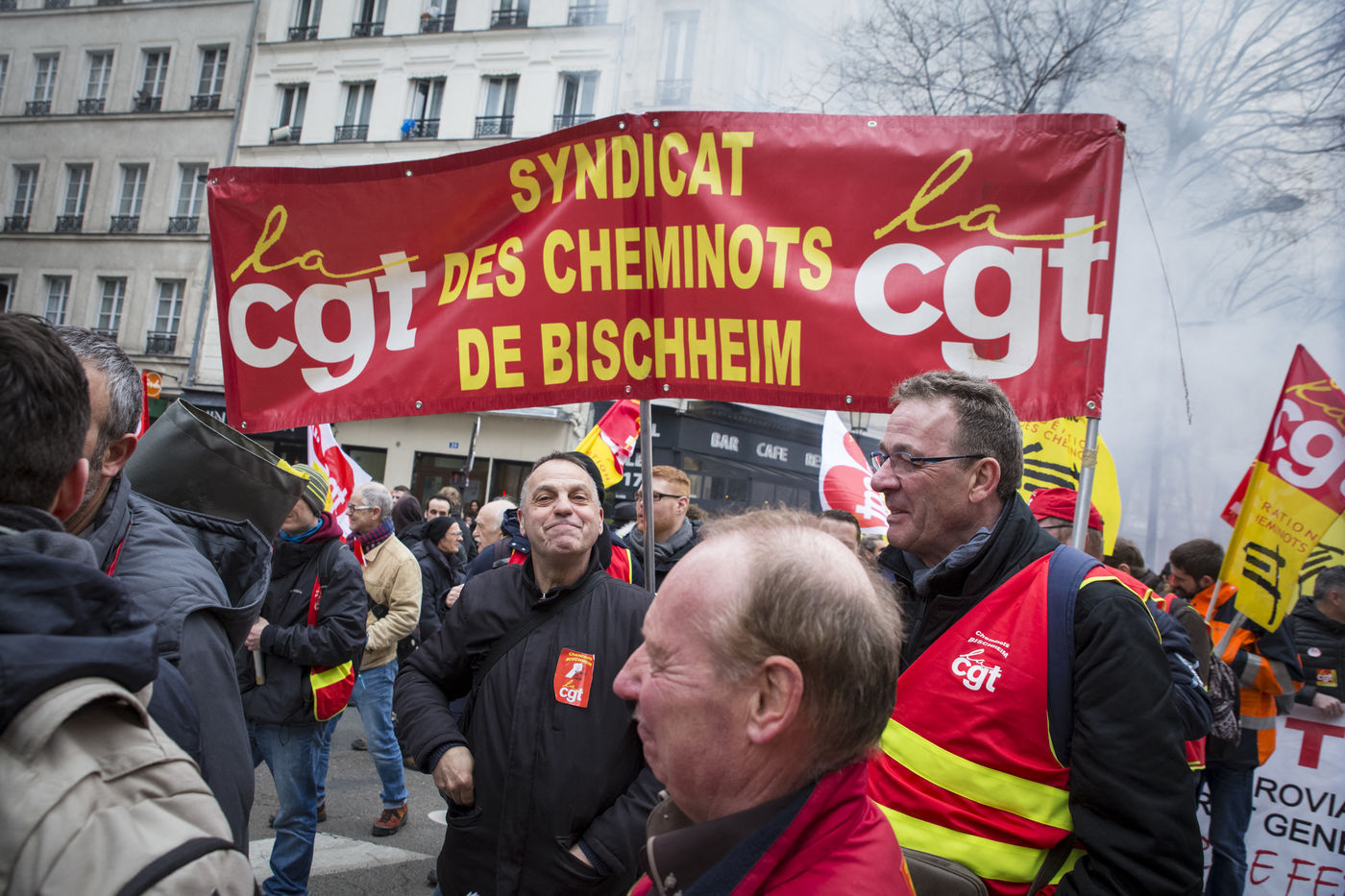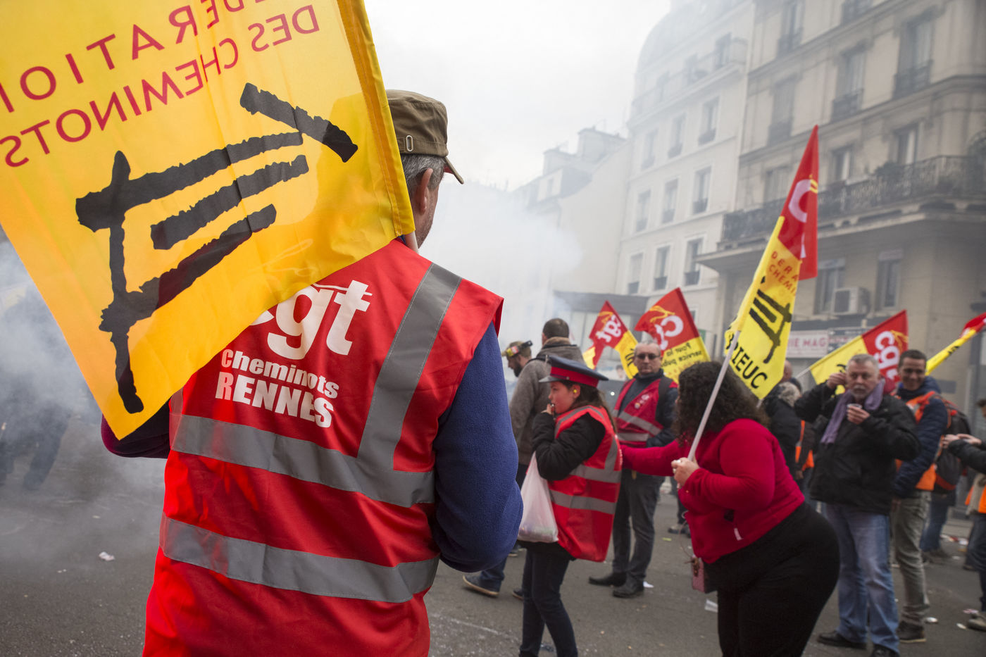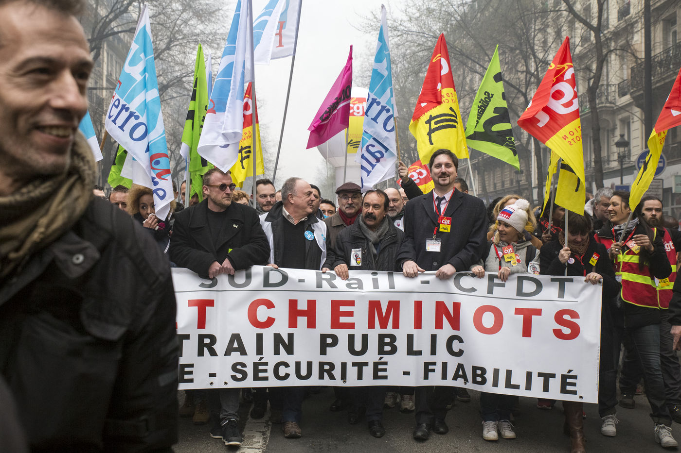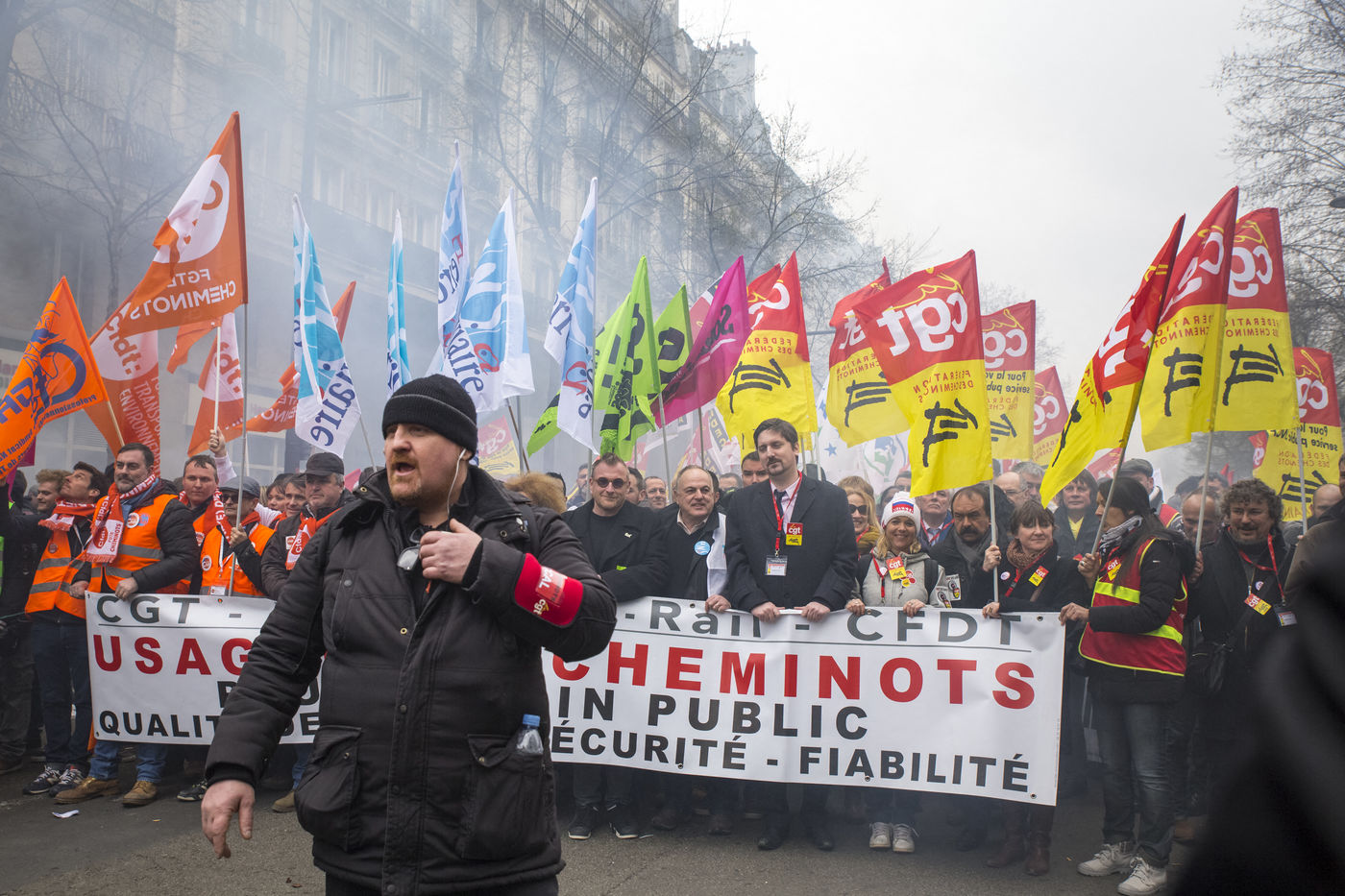 France, Paris March 22, 2018: National demonstration of railway workers to defend their status, and fight against the SNCF reform project.