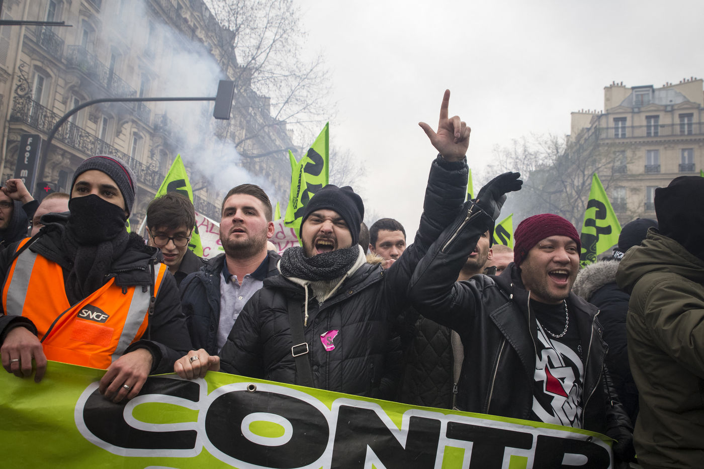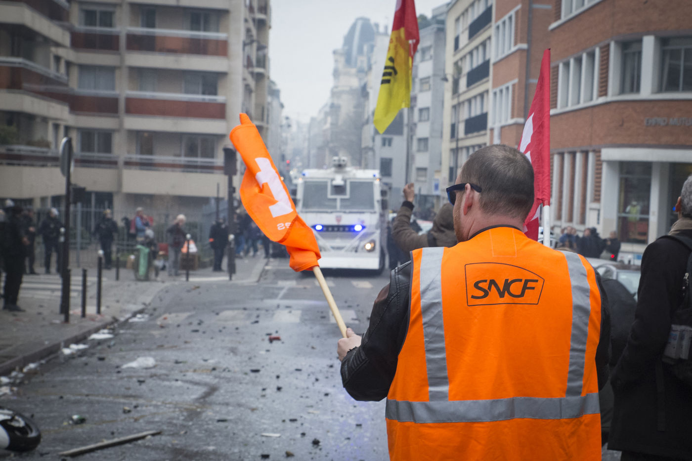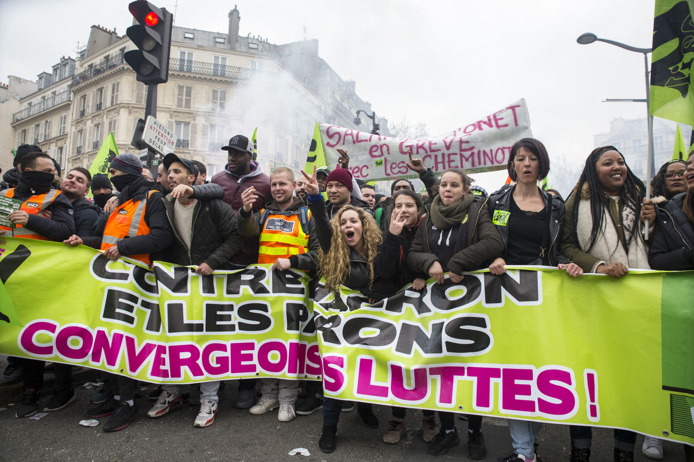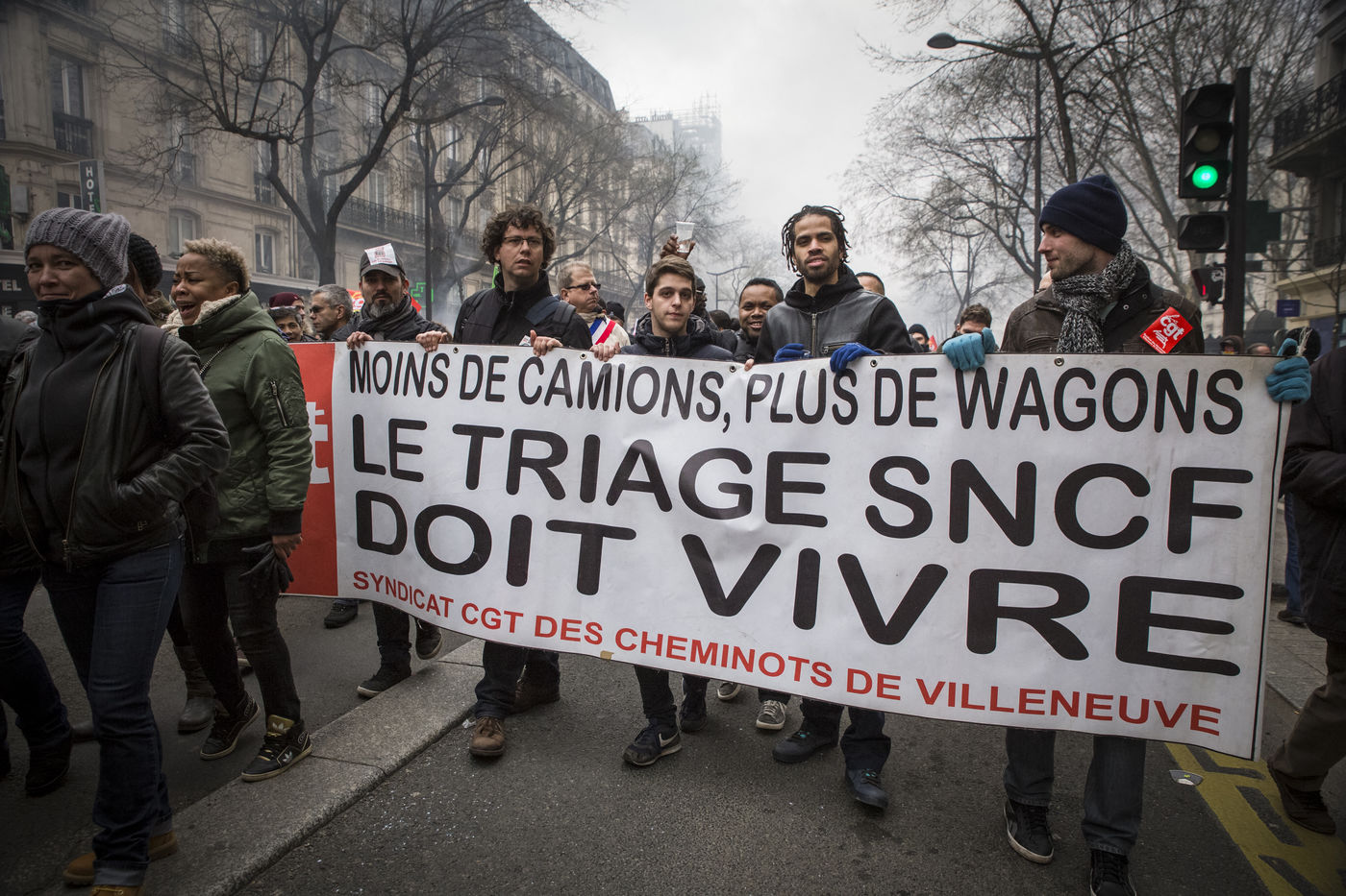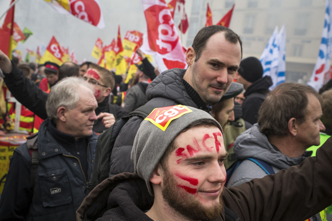 France, Paris March 22, 2018: National demonstration of railway workers to defend their status, and fight against the SNCF reform project.