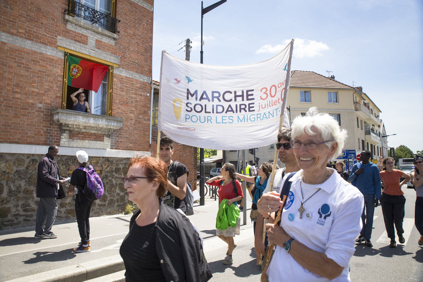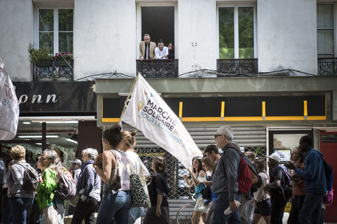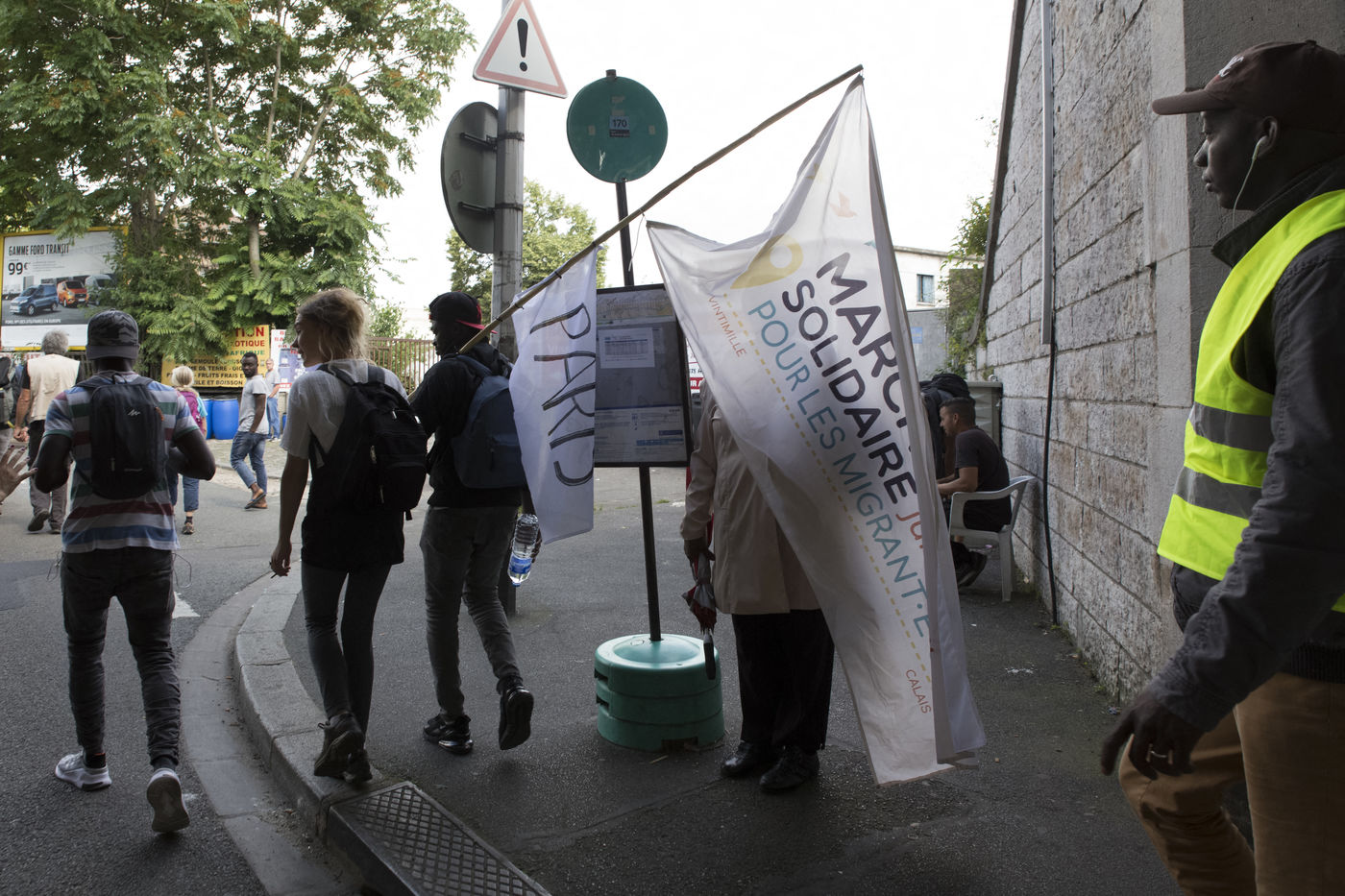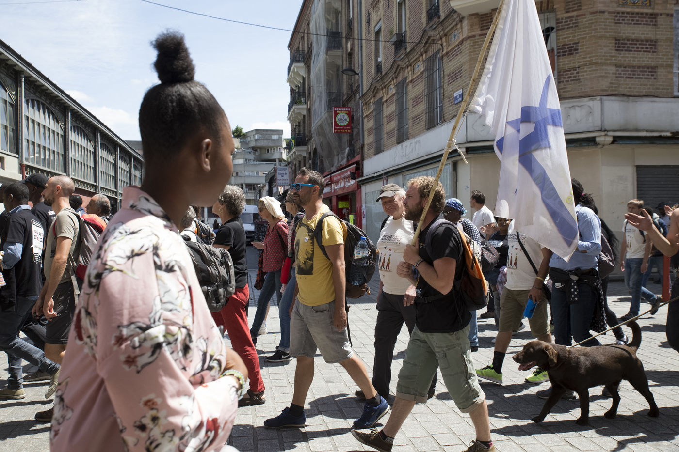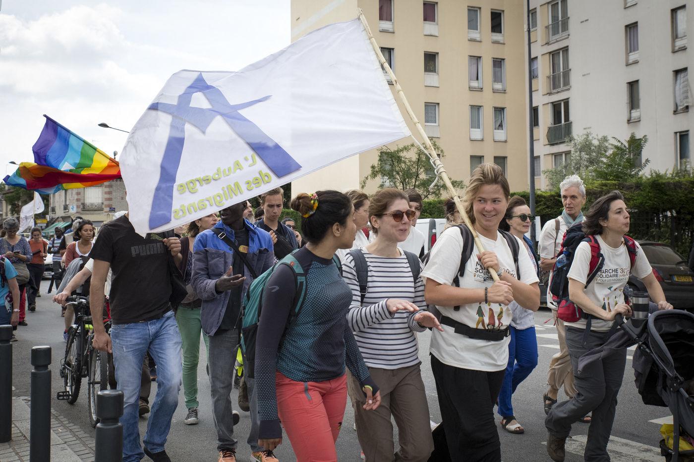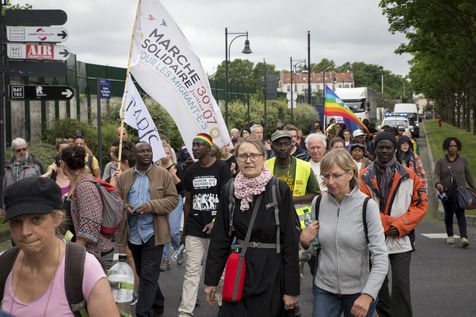 June 21, 2018. Step 45 from Paris to Sarcelles / Parisian steps of solidarity citizen's march for migrants. Organized by the Auberge des Migrants, it runs 1400 km between Ventimiglia and Calais, a final stop in London is scheduled for July 8. Its aim is to promote the work of citizens, associations and migrant collectives in the 60 cities-stages, to create dialogue with citizens and to raise awareness of the issue of the reception of migrants.