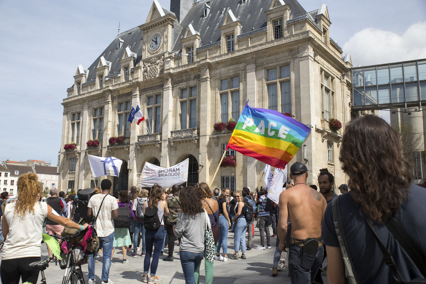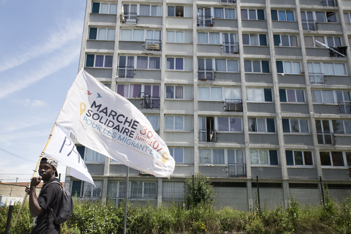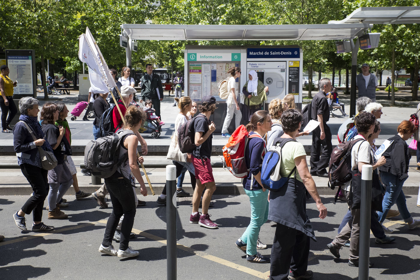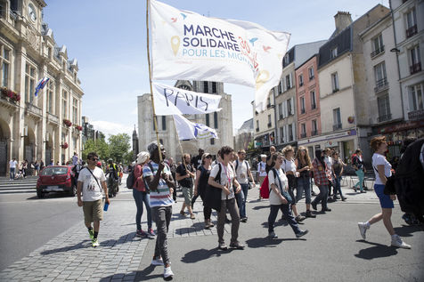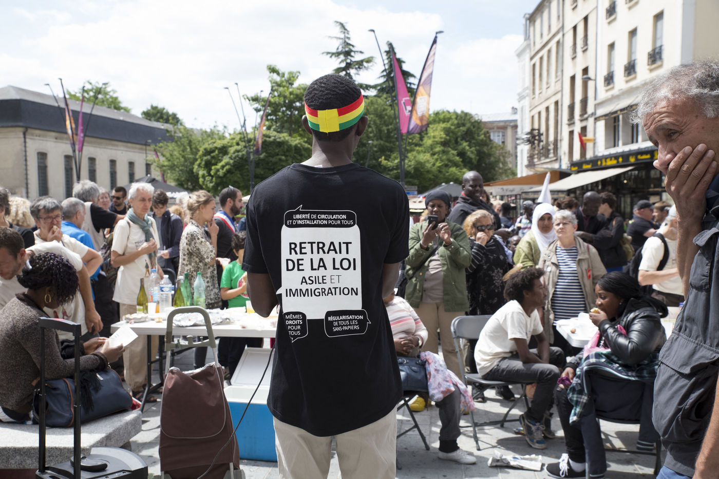 June 21, 2018. Step 45 from Paris to Sarcelles / Parisian steps of solidarity citizen's march for migrants. Organized by the Auberge des Migrants, it runs 1400 km between Ventimiglia and Calais, a final stop in London is scheduled for July 8. Its aim is to promote the work of citizens, associations and migrant collectives in the 60 cities-stages, to create dialogue with citizens and to raise awareness of the issue of the reception of migrants.