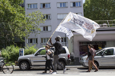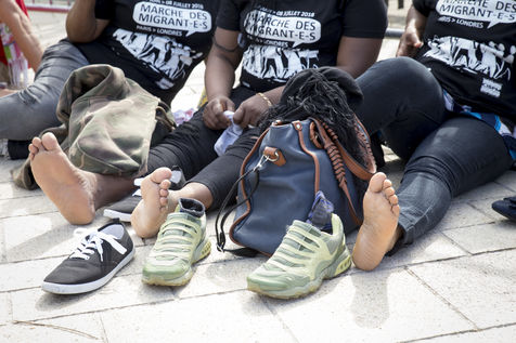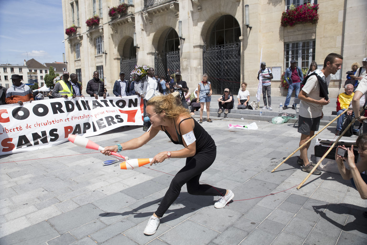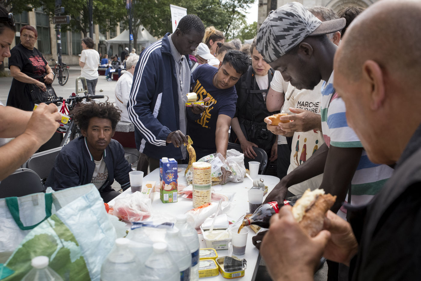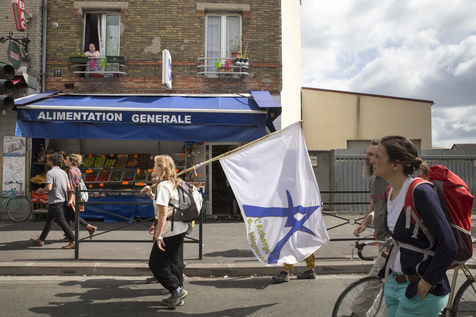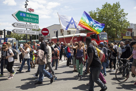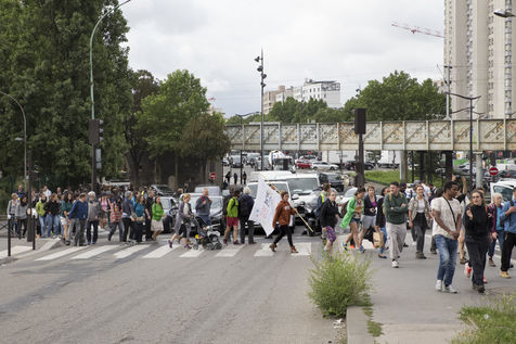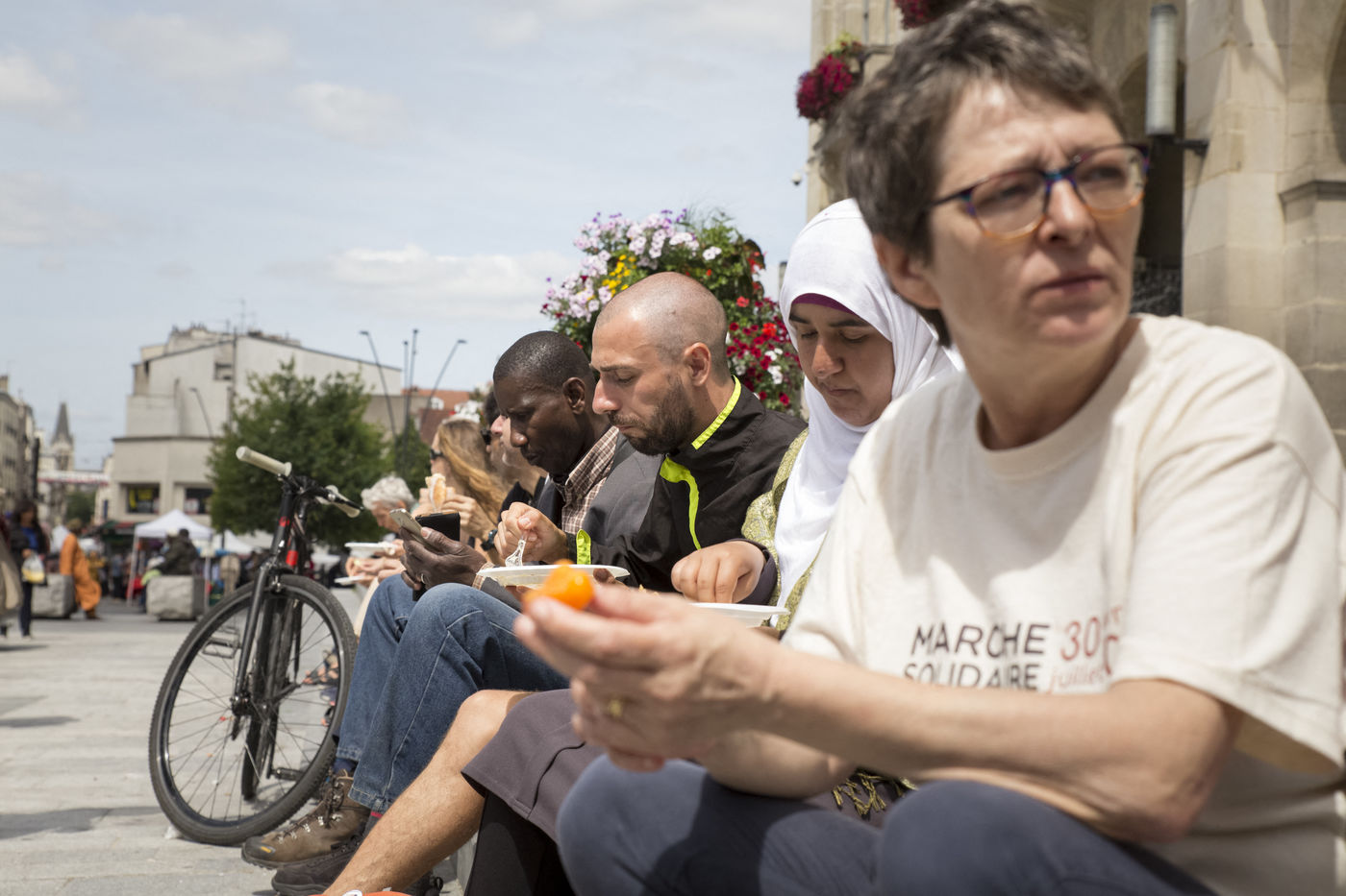 June 21, 2018. Step 45 from Paris to Sarcelles / Parisian steps of solidarity citizen's march for migrants. Organized by the Auberge des Migrants, it runs 1400 km between Ventimiglia and Calais, a final stop in London is scheduled for July 8. Its aim is to promote the work of citizens, associations and migrant collectives in the 60 cities-stages, to create dialogue with citizens and to raise awareness of the issue of the reception of migrants.