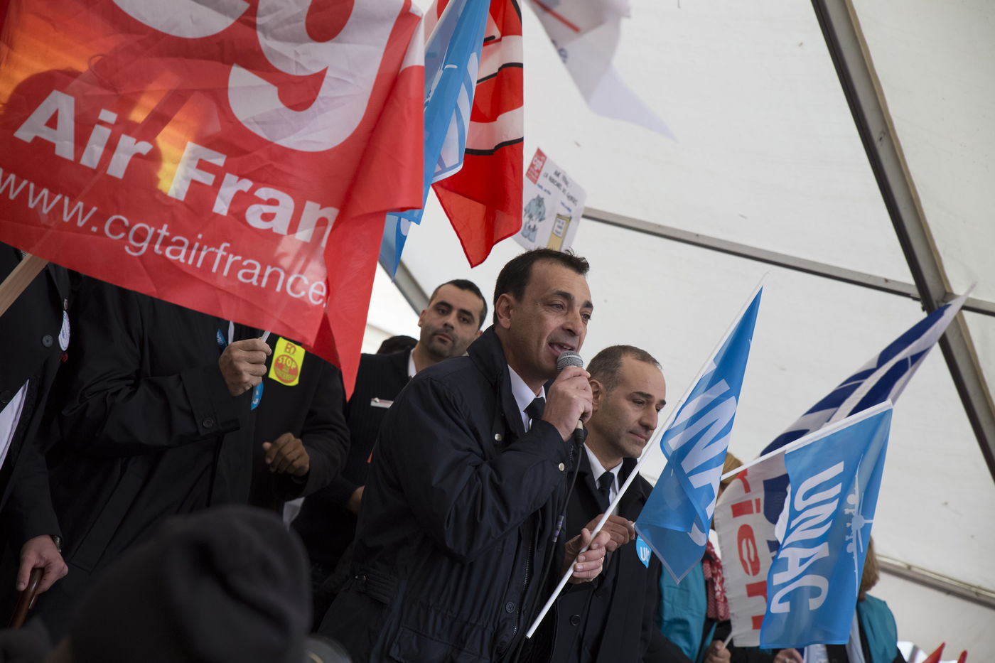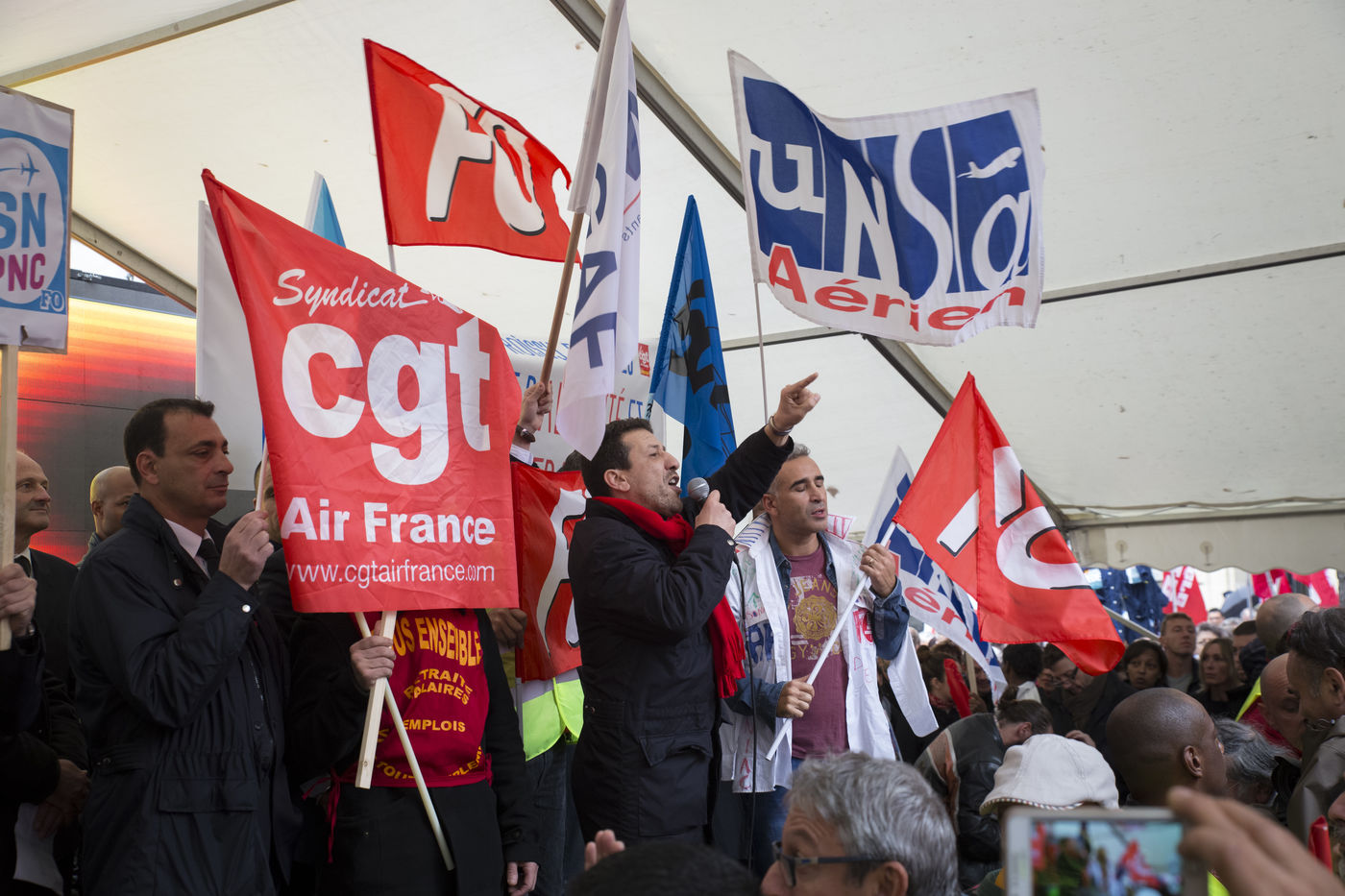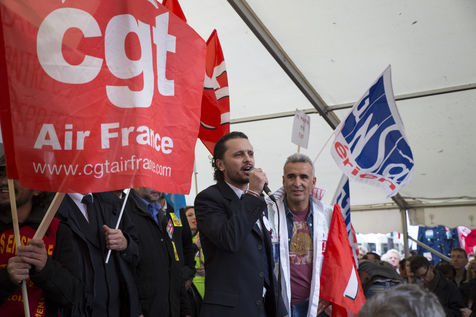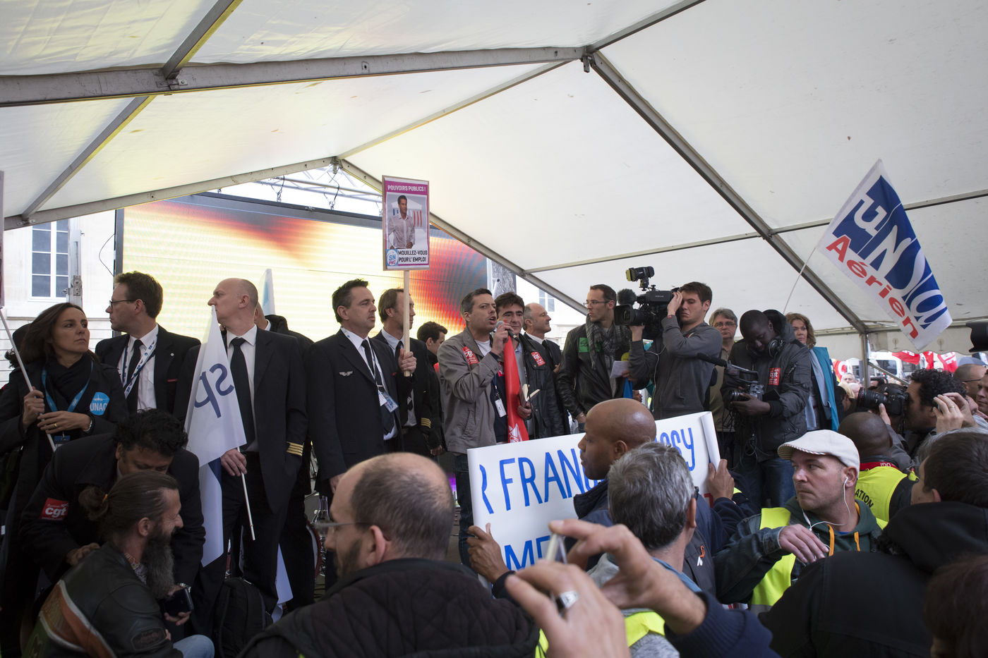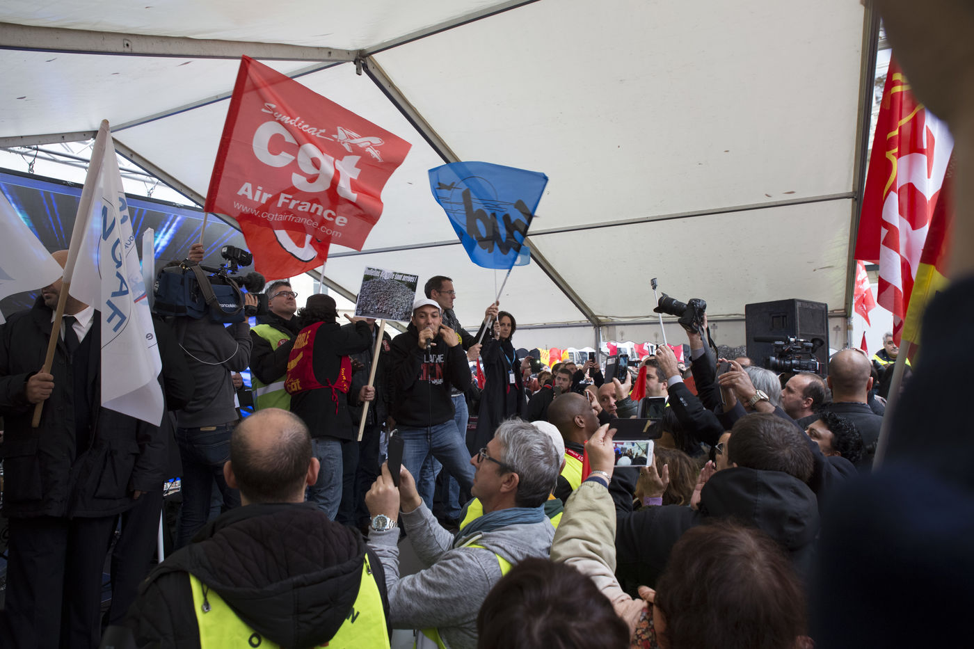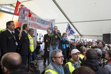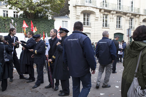 At the call of twelve unions (CGT, SNPAF, FO, CFTC, ALTER, SNPL, SNPNAC, SNPNC, SPAF, SUD-AERIEN, UNSA-PNC, UNAC), Air-France employees, both ground and aircrew, came to demonstrate their opposition to management's layoff plans and their support for their colleagues who were questioned following the events that took place during the CCE on October 5, 2015.