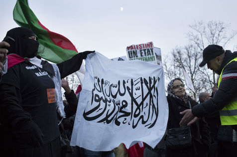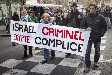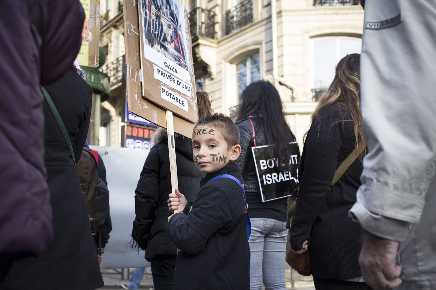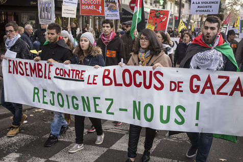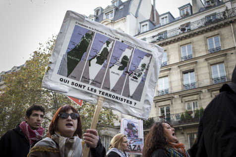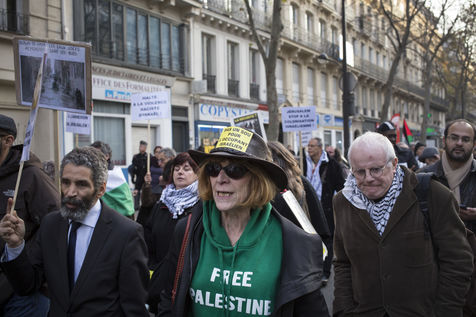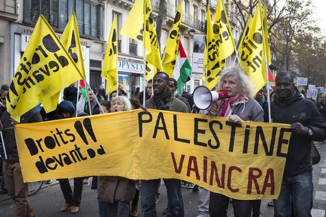 Manifestation à l'occasion de la journée internationale de solidarité avec la Palestine. Le cortège parti de la place du Chatelet a rejoint en fin de manifestation les dizaines de personnes rassemblées place de la Republique pour cette journée.