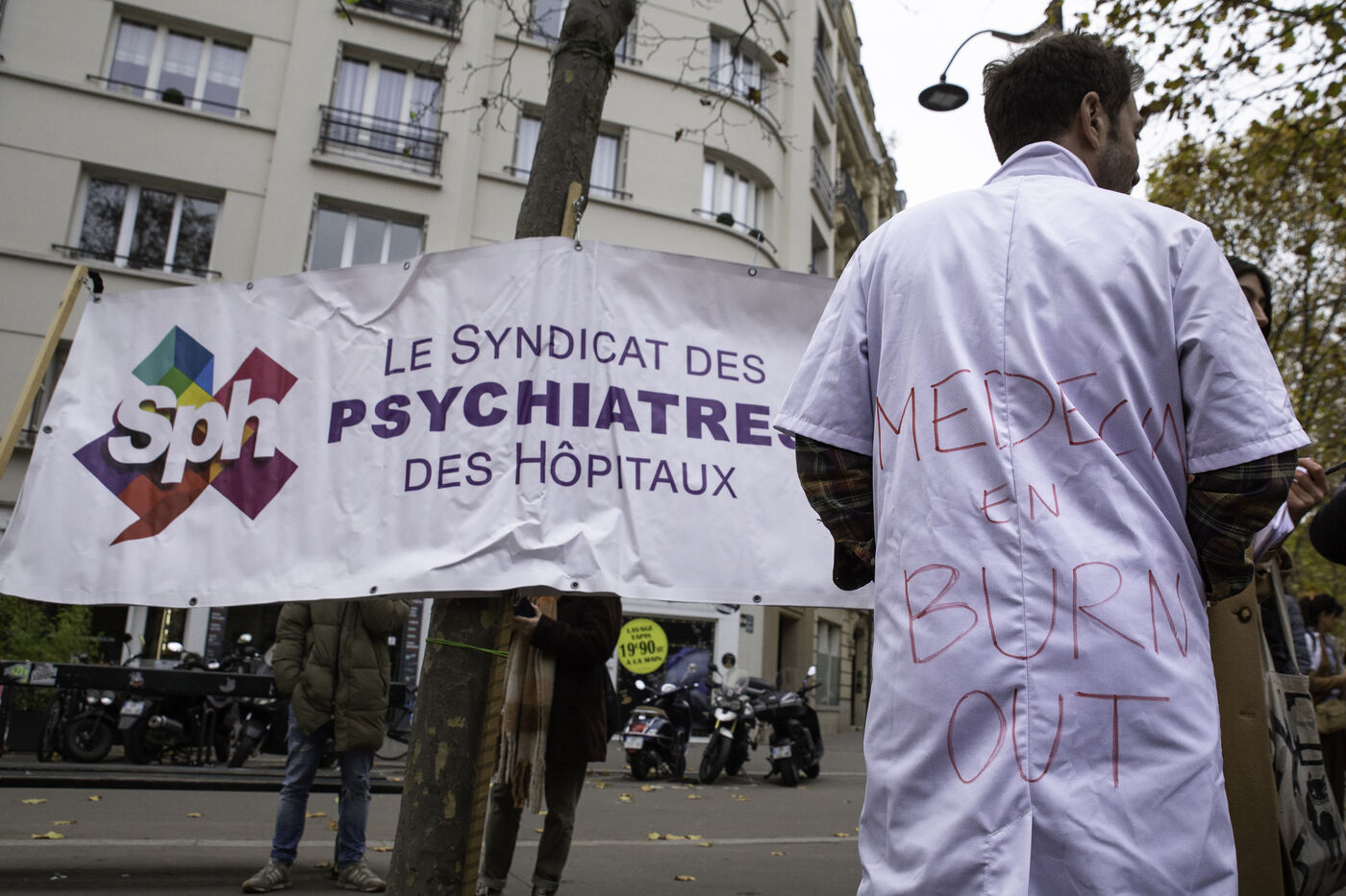 FRANCE, PARIS, November 29, 2022. Four unions (Idepp, Spep, SPH, USP) of hospital psychiatrists call for a day of action and strike to denounce the alarming state of public psychiatry. Faced with a lack of resources, a shortage of caregivers, and a growing demand, they warn of the risk of a public health catastrophe.