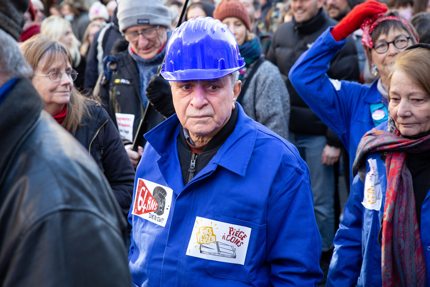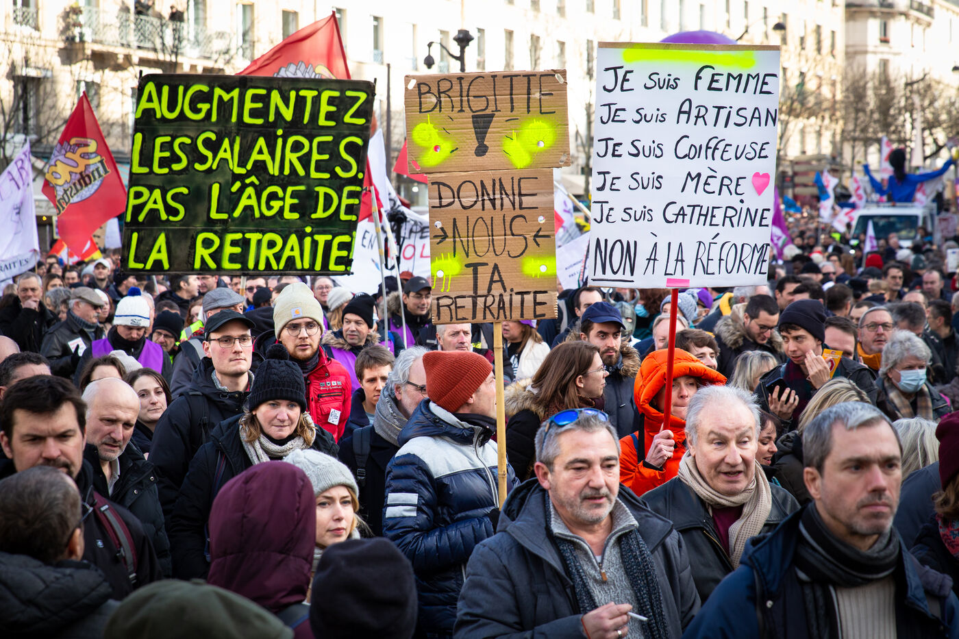 France, Paris, le 31 janvier 2023. Manifestation parisienne contre la reforme des retraites. Deuxieme journee de mobilisation intersyndicale contre la reforme portee par Elizabeth Borne et son gouvernement. Les manifestants protestent contre le report de l age legal de la retraite a 64 ans et l acceleration de l augmentation de la duree de cotisation.