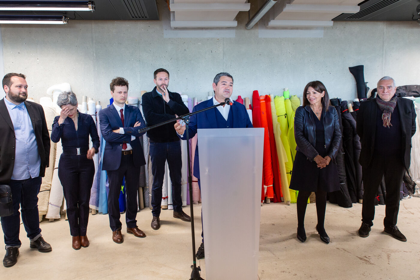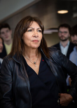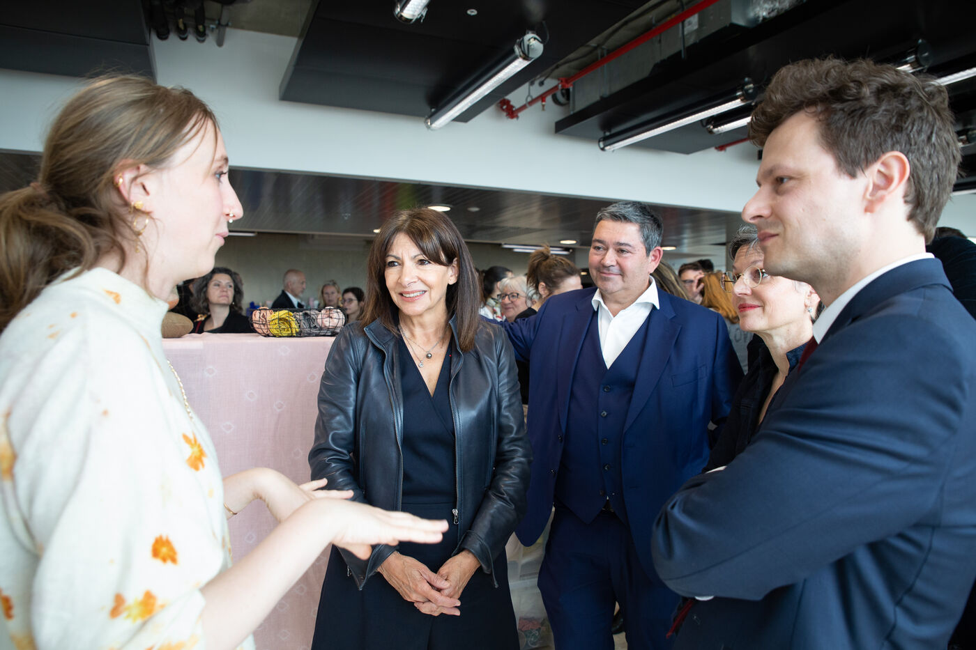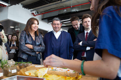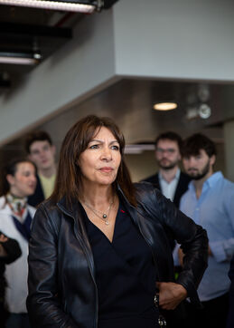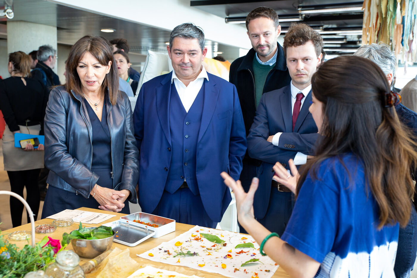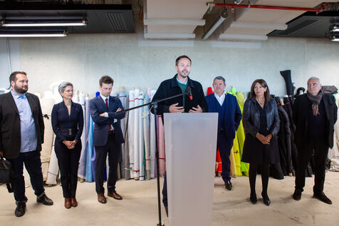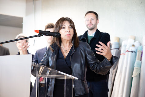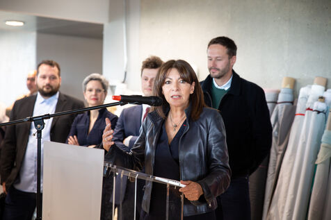 France, Paris, May 23, 2023 Inauguration of the Manufacture Berlier, in the 13th arrondissement of Paris. The RIVP's Berlier building houses a social, solidarity-based, circular textile factory. In the presence of the mayor of Paris, deputy mayors of the city of Paris, the mayor of the 13th arrondissement, and the president of the RIVP. Jerome COUMET (Mayor of 13?), David Belliard (deputy mayor), Anne Hidalgo (mayor of Paris) and Sandrine Rousseau (deputee ecologiste Nupes) visit the stands.