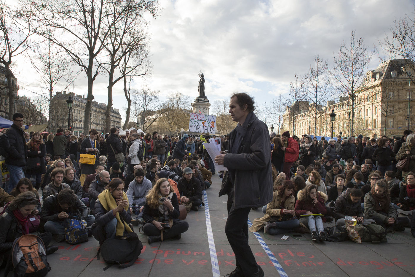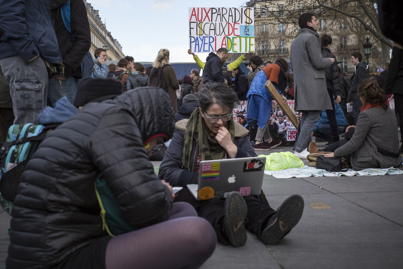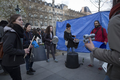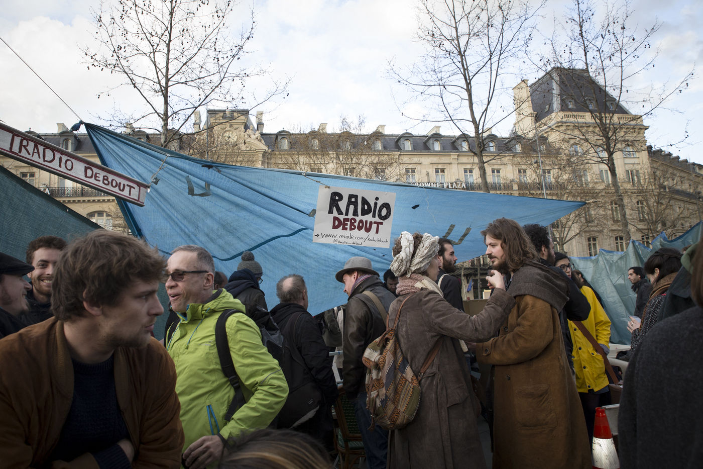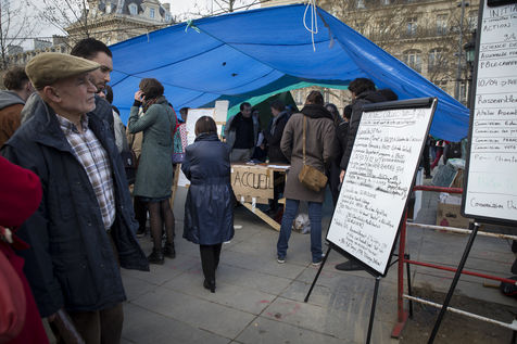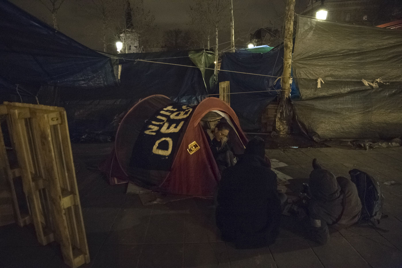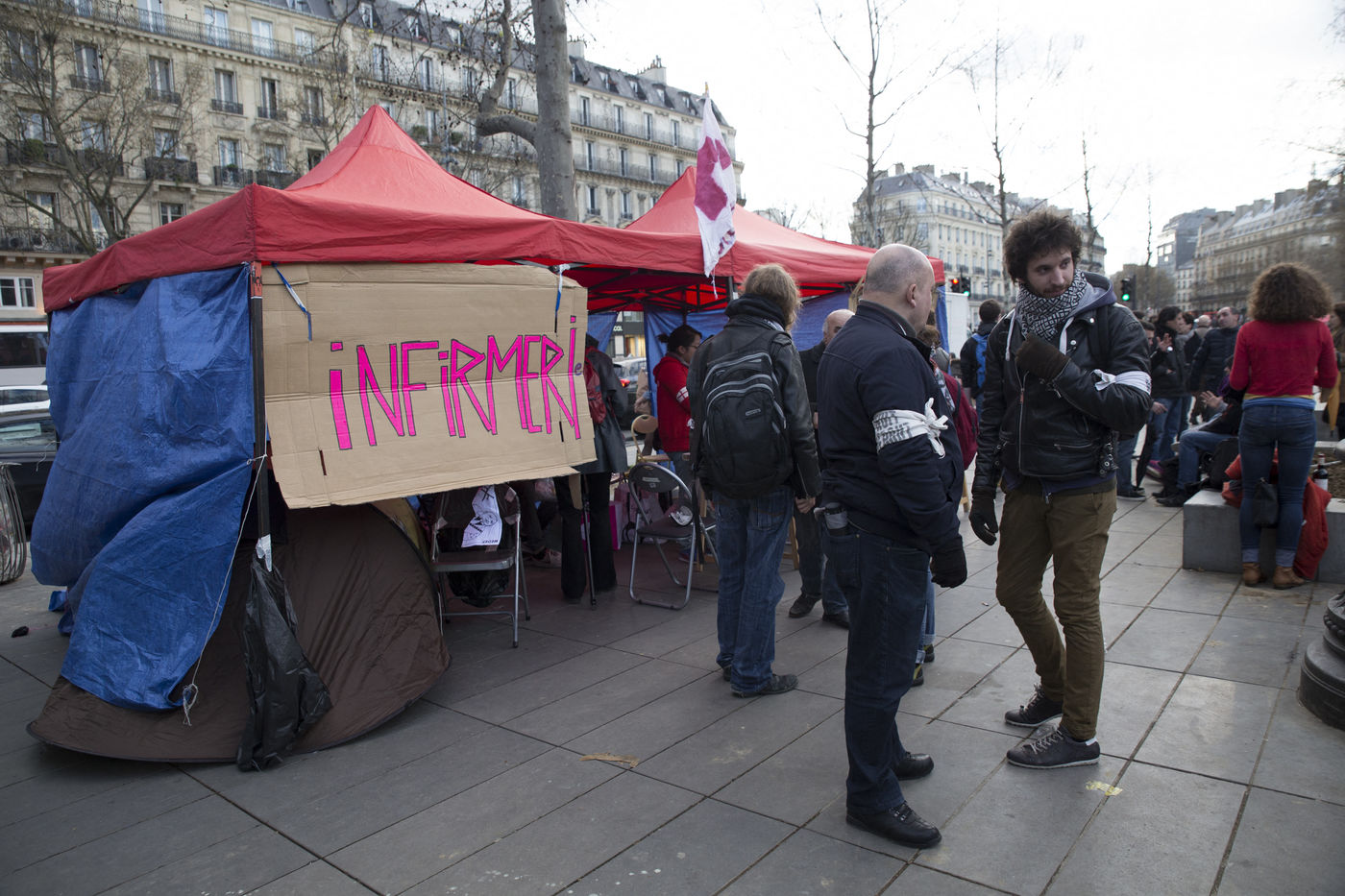 France, Paris, Place de la République. Thursday April 7 or March 38 - 2016. Eighth Nuit Debout, the movement born from the occupation of the Place de la République after the March 31 demonstration against the labor code reform project. Very largely inspired by the Spanish Indignés, this decentralized and heterogeneous agora which, well beyond the El Khomri law, gave itself for mission "to invent the society of tomorrow". The "infrimerie" point