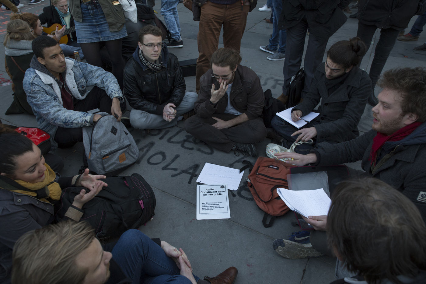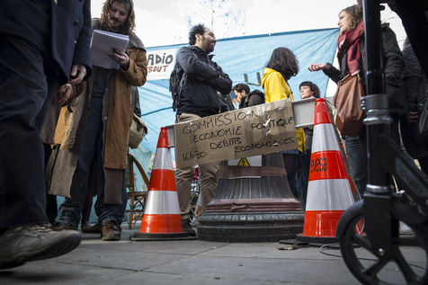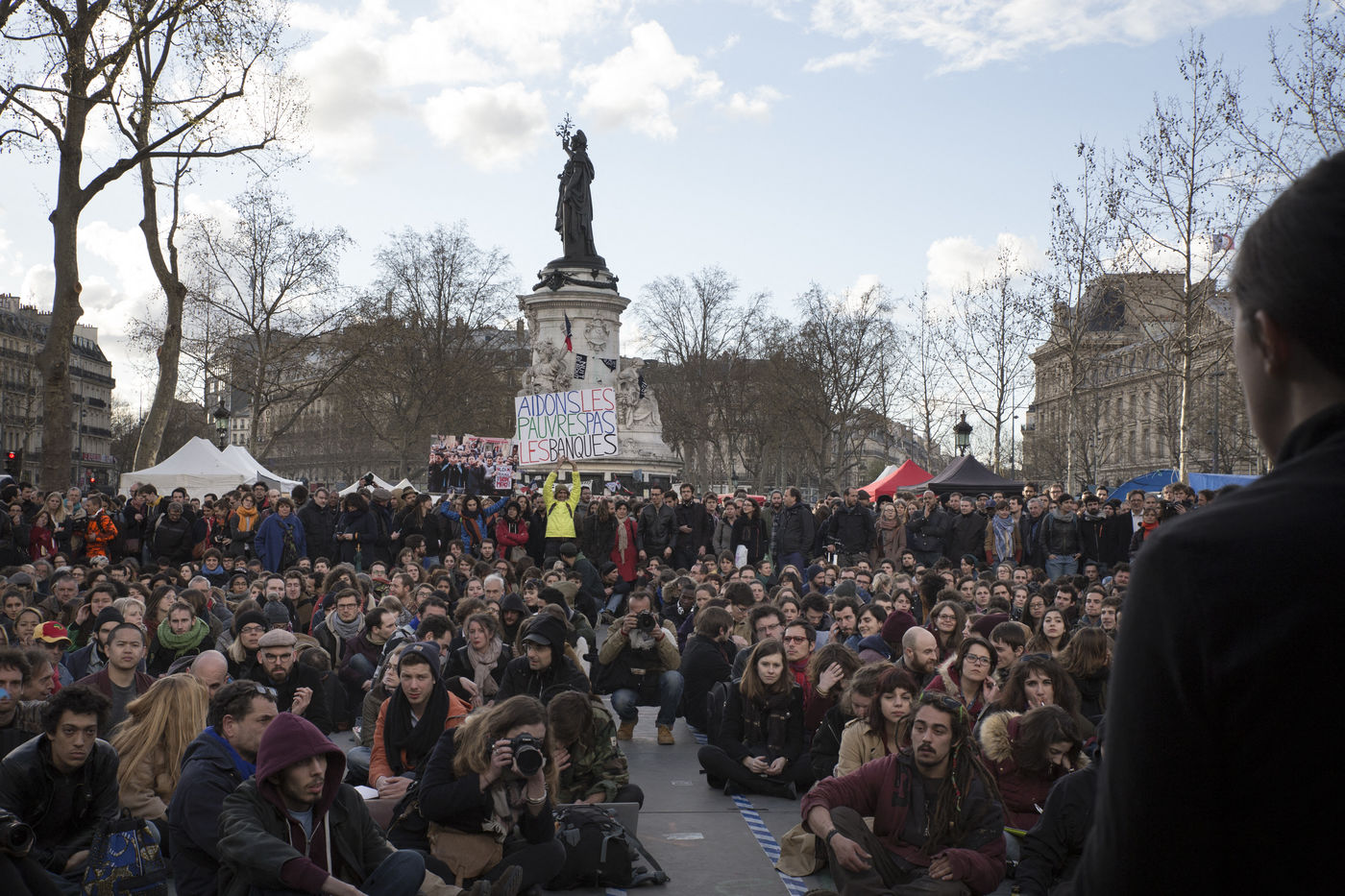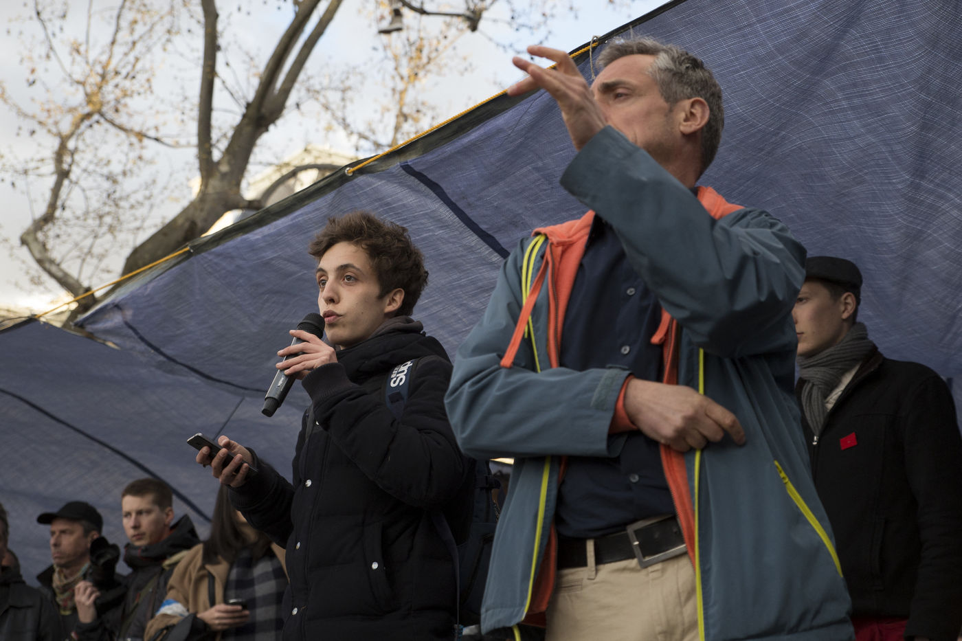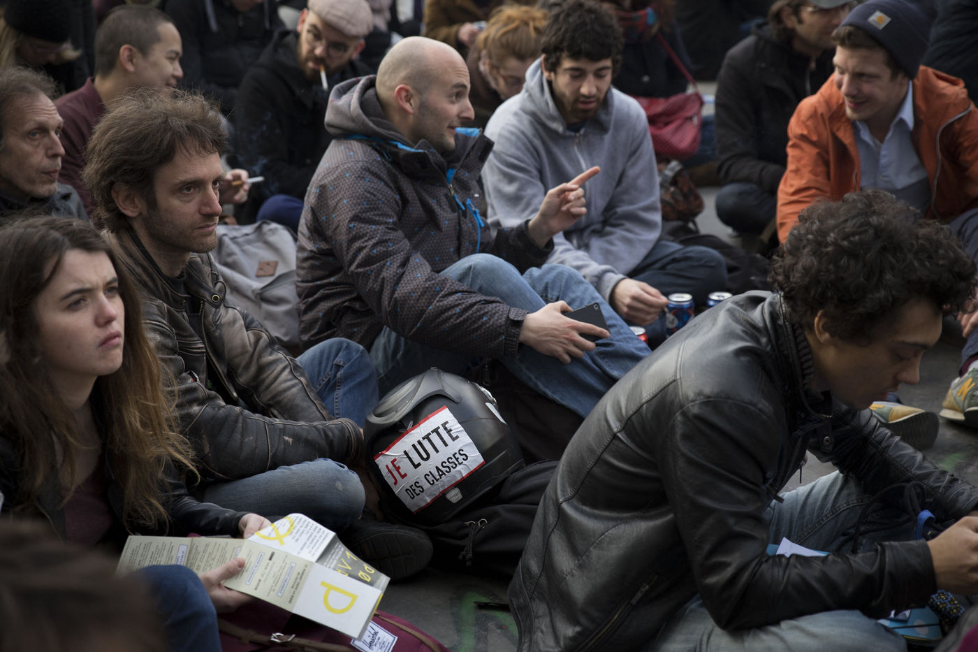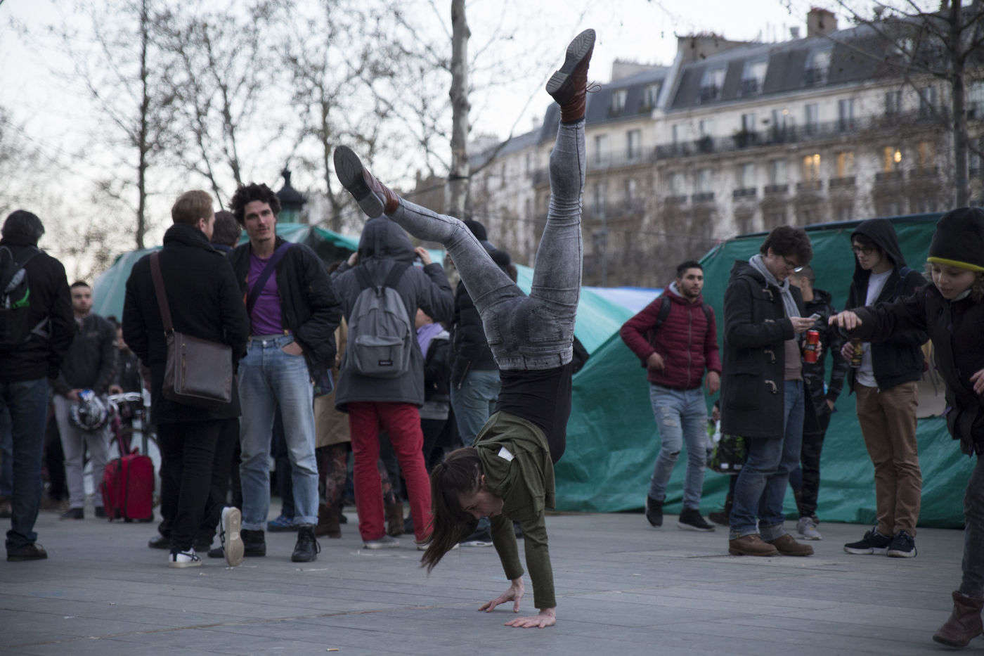 France, Paris, Place de la République. Thursday April 7 or March 38 - 2016. Eighth Nuit Debout, the movement born from the occupation of the Place de la République after the March 31 demonstration against the labor code reform project. Very largely inspired by the Spanish Indignés, this decentralized and heterogeneous agora which, well beyond the El Khomri law, gave itself for mission "to invent the society of tomorrow". The "infrimerie" point