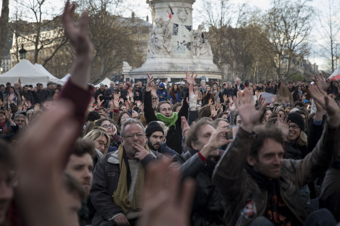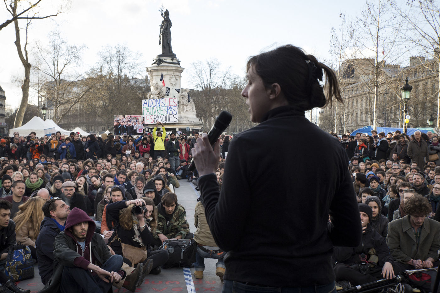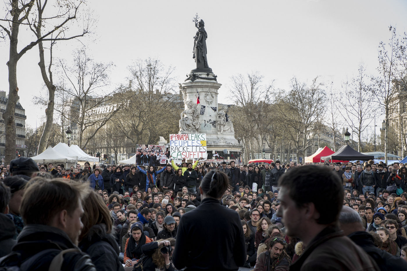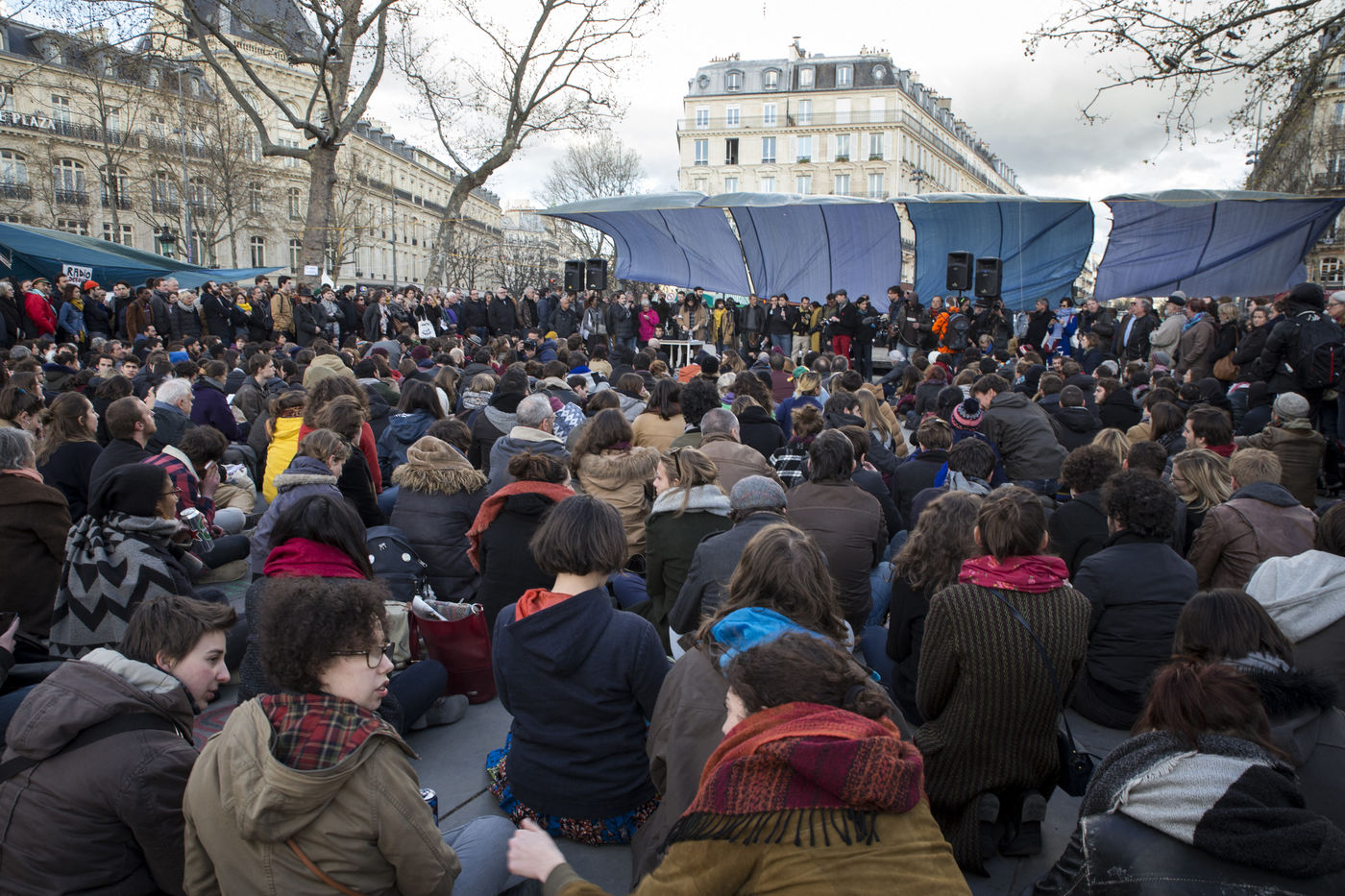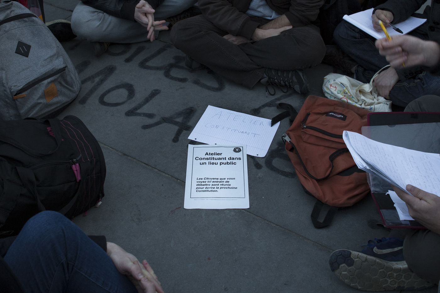 France, Paris, Place de la République. Thursday April 7 or March 38 - 2016. Eighth Nuit Debout, the movement born from the occupation of the Place de la République after the March 31 demonstration against the labor code reform project. Very largely inspired by the Spanish Indignés, this decentralized and heterogeneous agora which, well beyond the El Khomri law, gave itself for mission "to invent the society of tomorrow". The "infrimerie" point