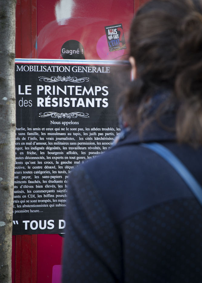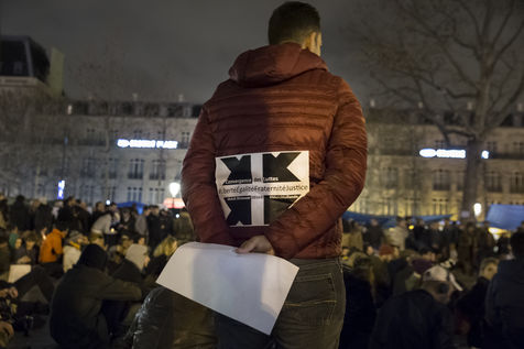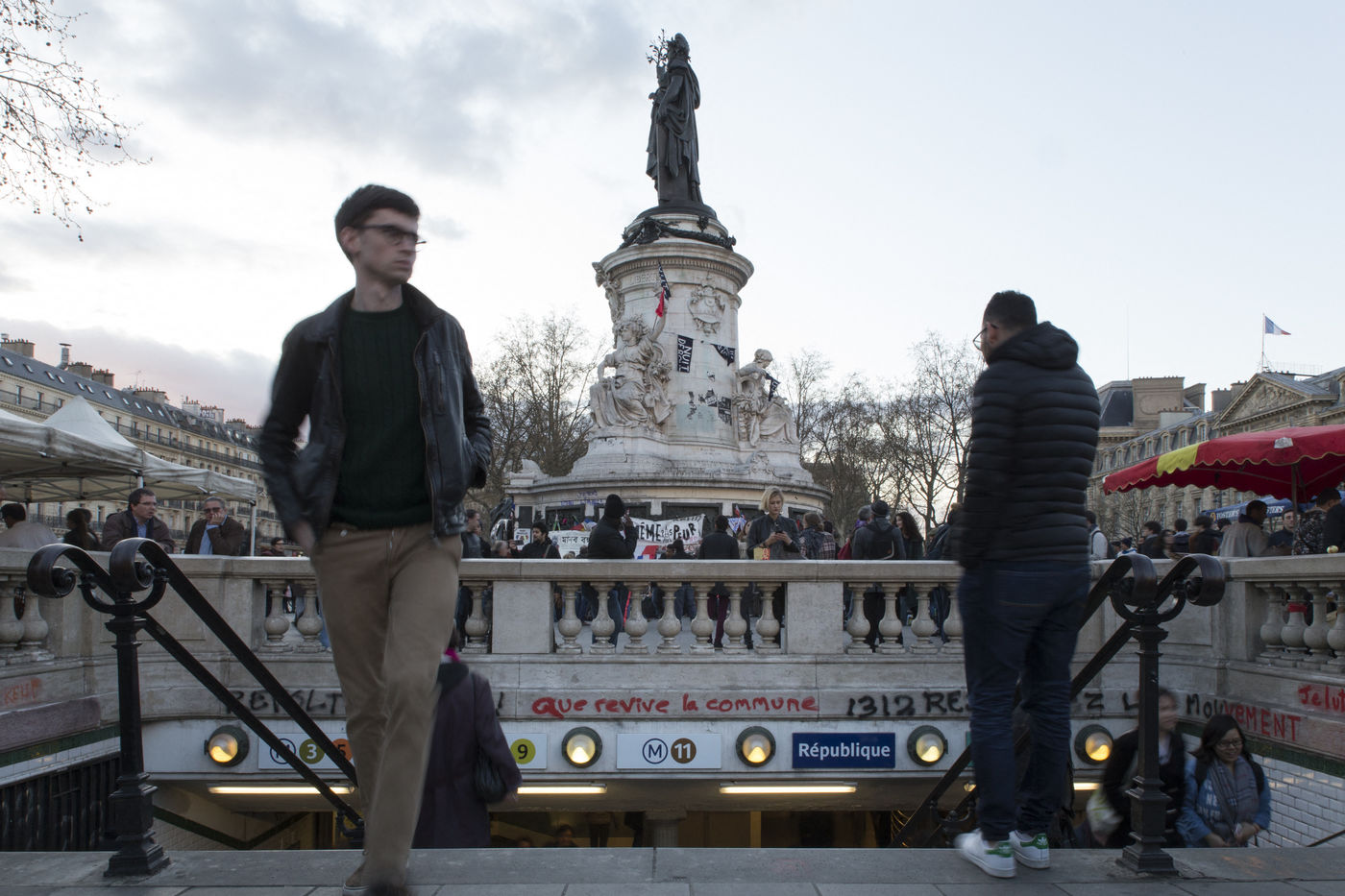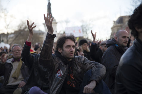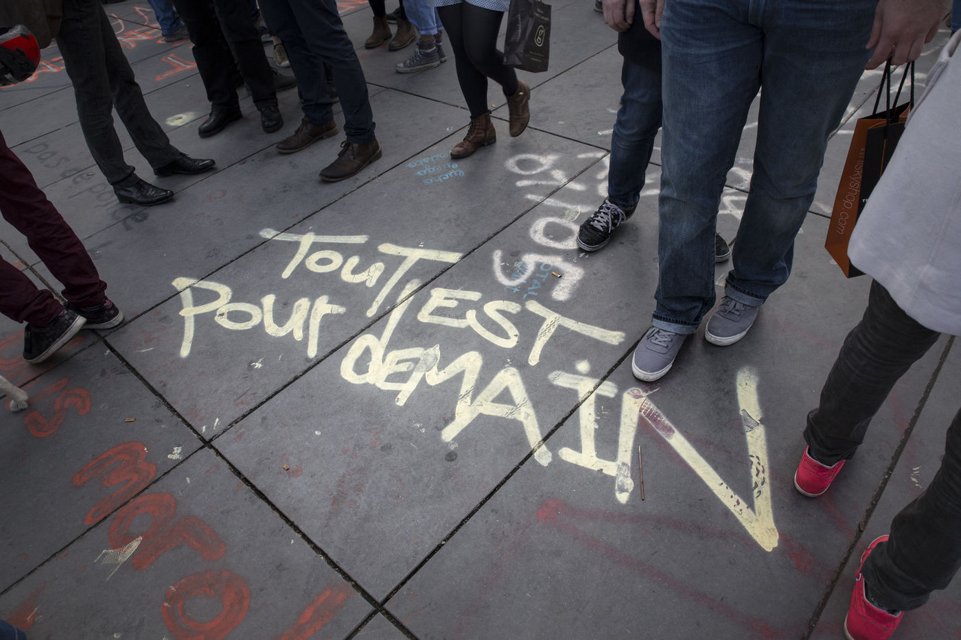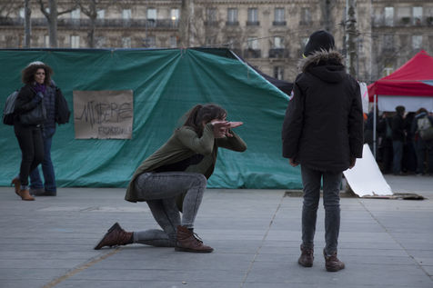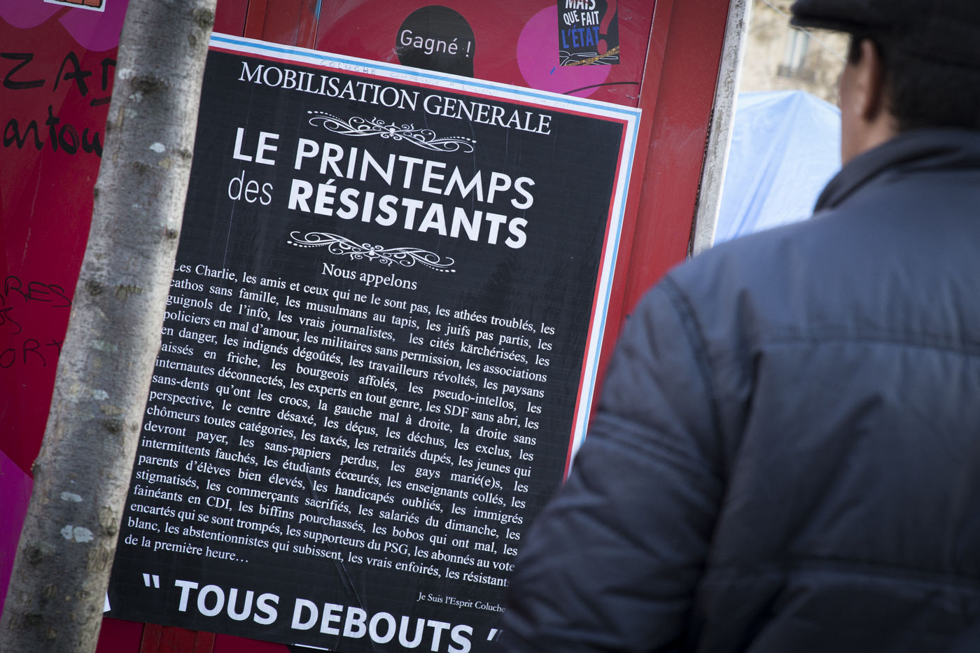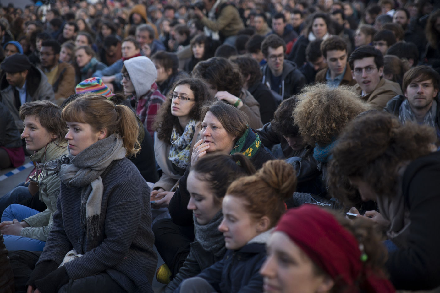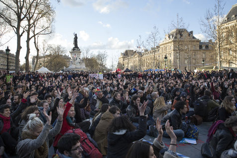 France, Paris, Place de la République. Thursday April 7 or March 38 - 2016. Eighth Nuit Debout, the movement born from the occupation of the Place de la République after the March 31 demonstration against the labor code reform project. Very largely inspired by the Spanish Indignés, this decentralized and heterogeneous agora which, well beyond the El Khomri law, gave itself for mission "to invent the society of tomorrow". The "infrimerie" point