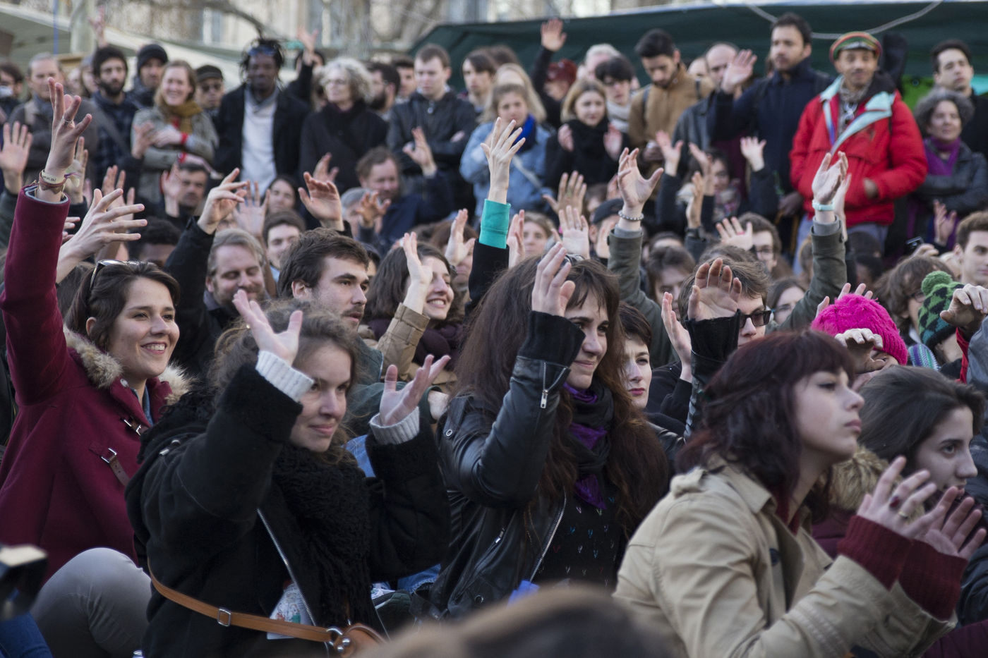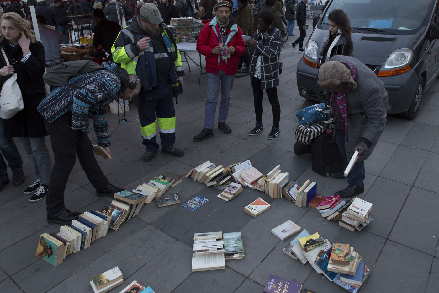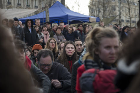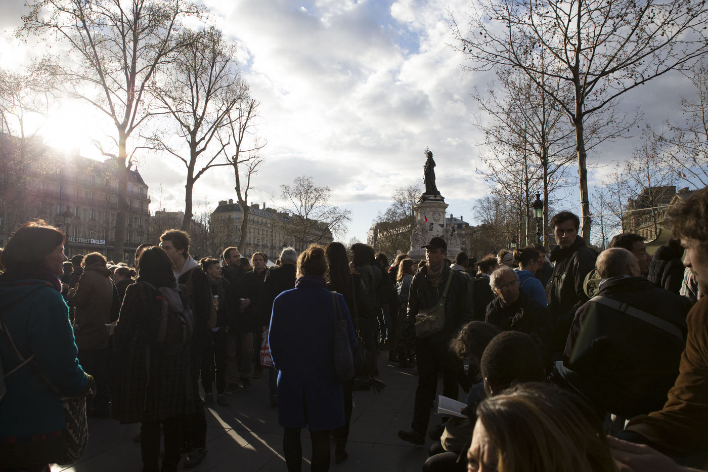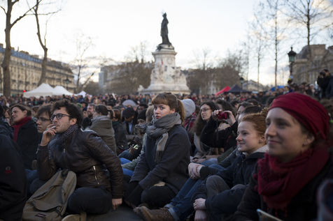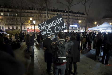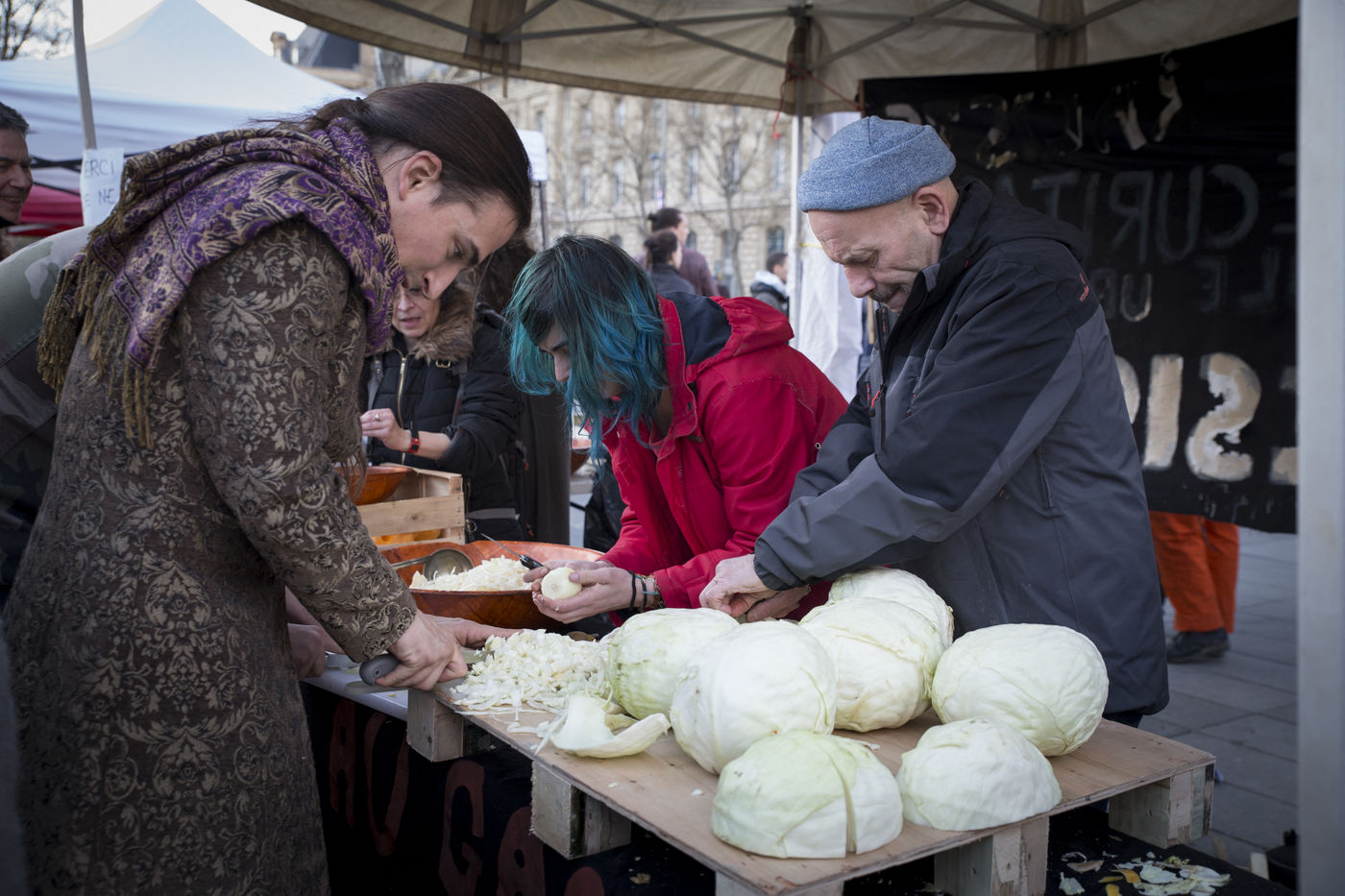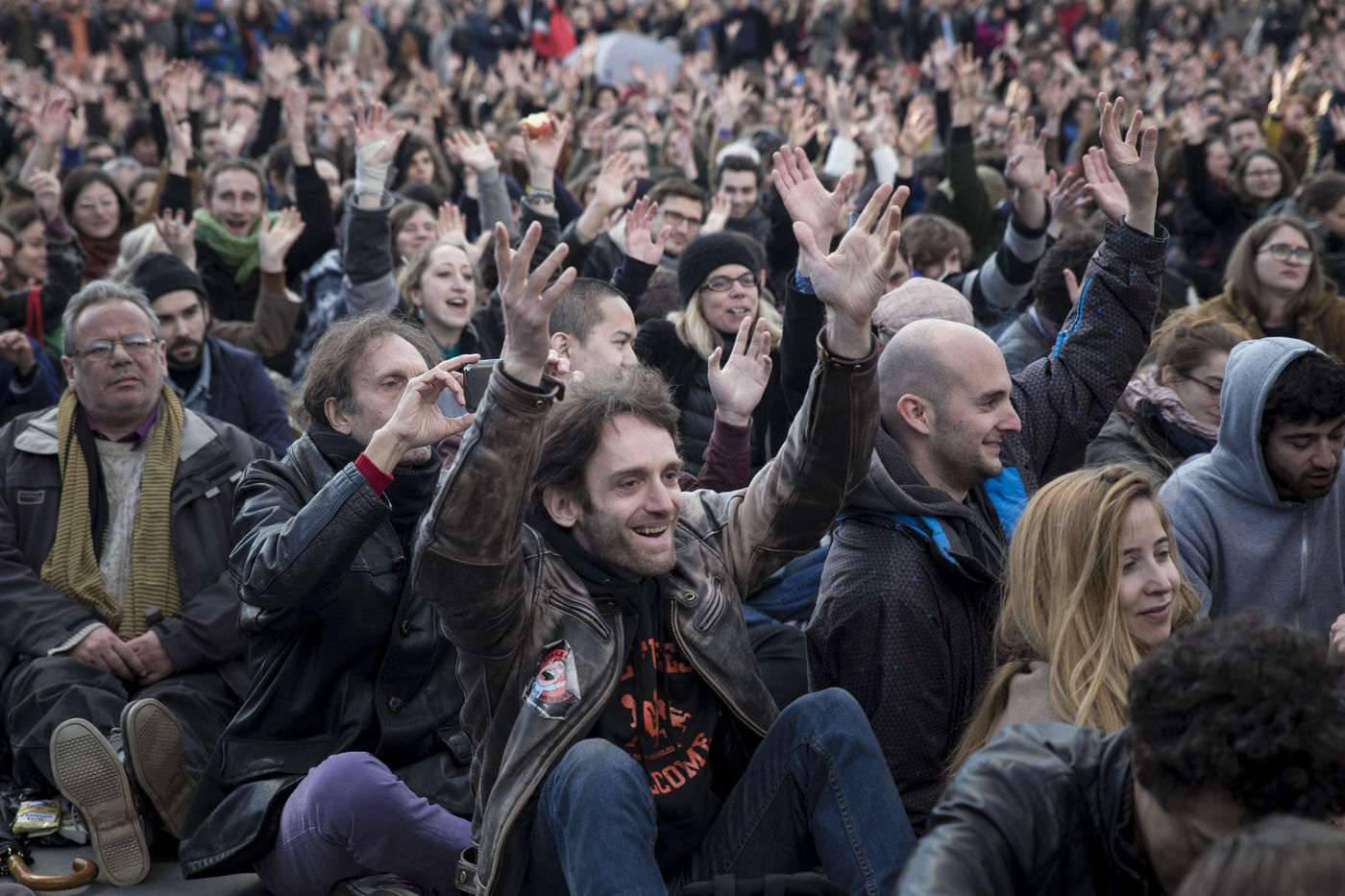 France, Paris, Place de la République. Thursday April 7 or March 38 - 2016. Eighth Nuit Debout, the movement born from the occupation of the Place de la République after the March 31 demonstration against the labor code reform project. Very largely inspired by the Spanish Indignés, this decentralized and heterogeneous agora which, well beyond the El Khomri law, gave itself for mission "to invent the society of tomorrow". The "infrimerie" point