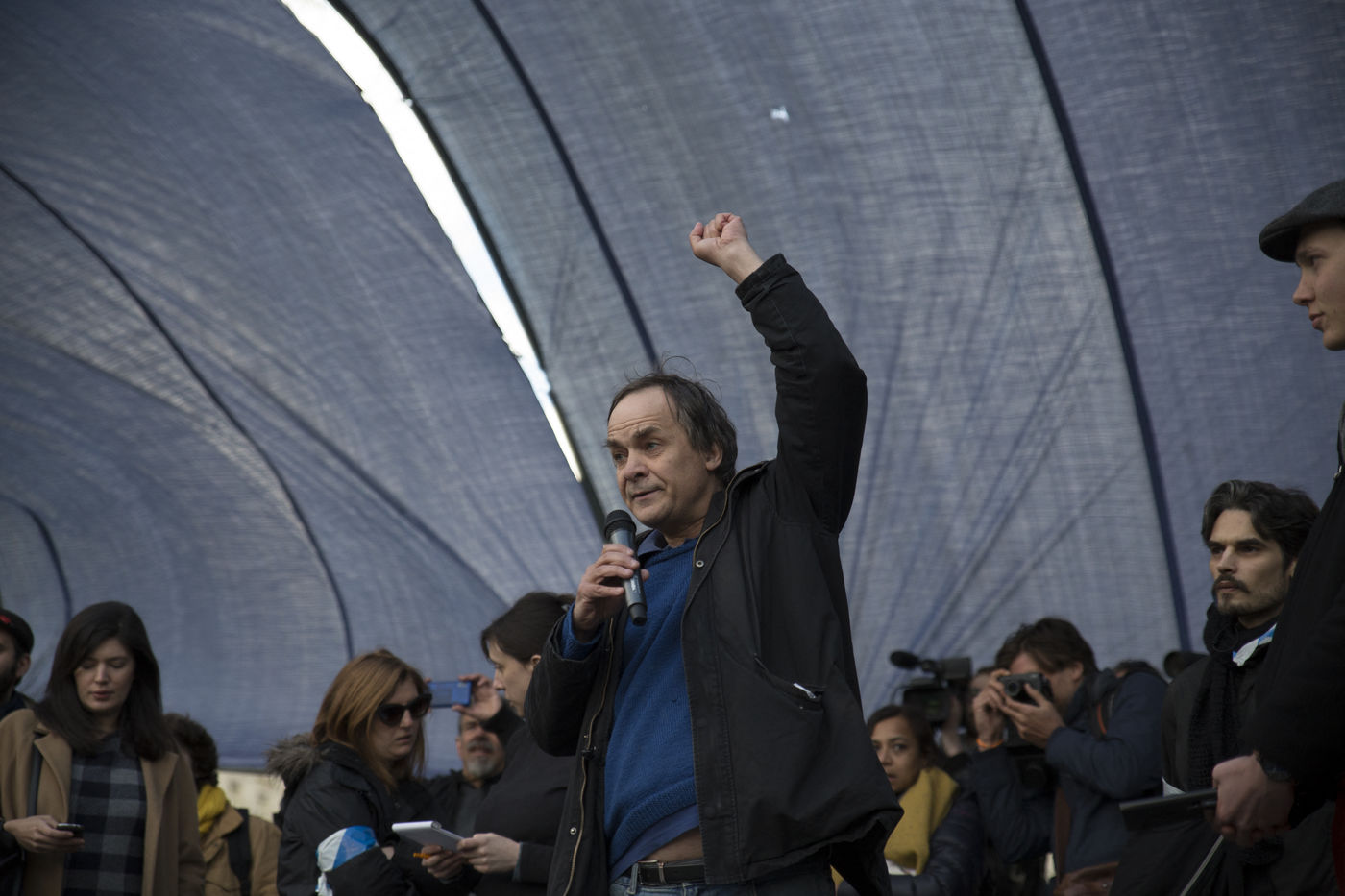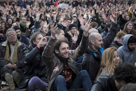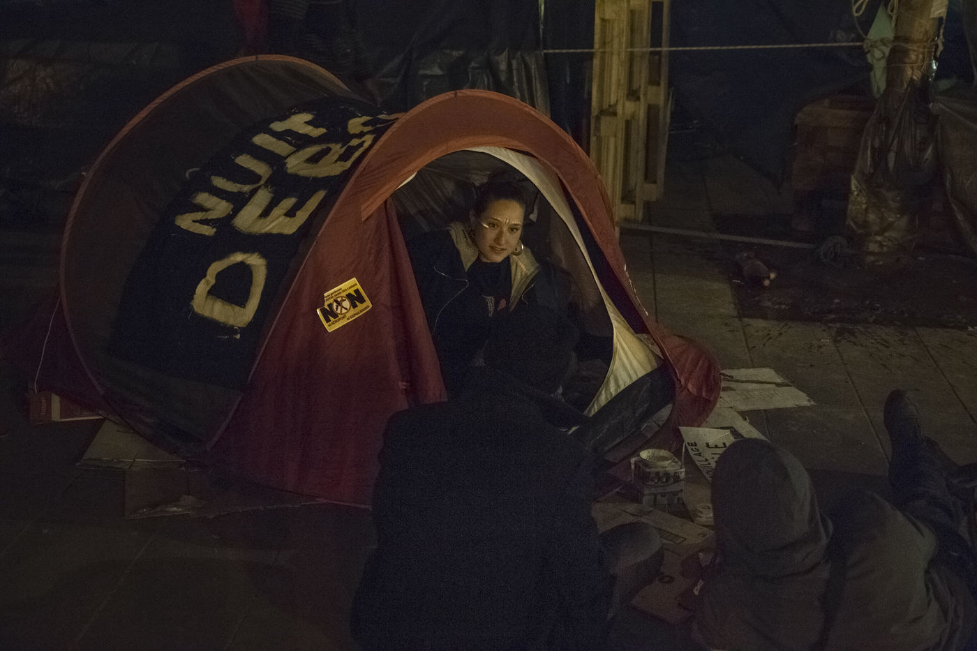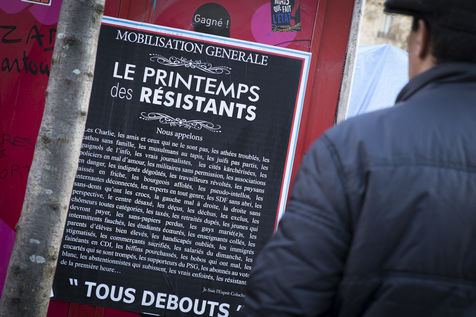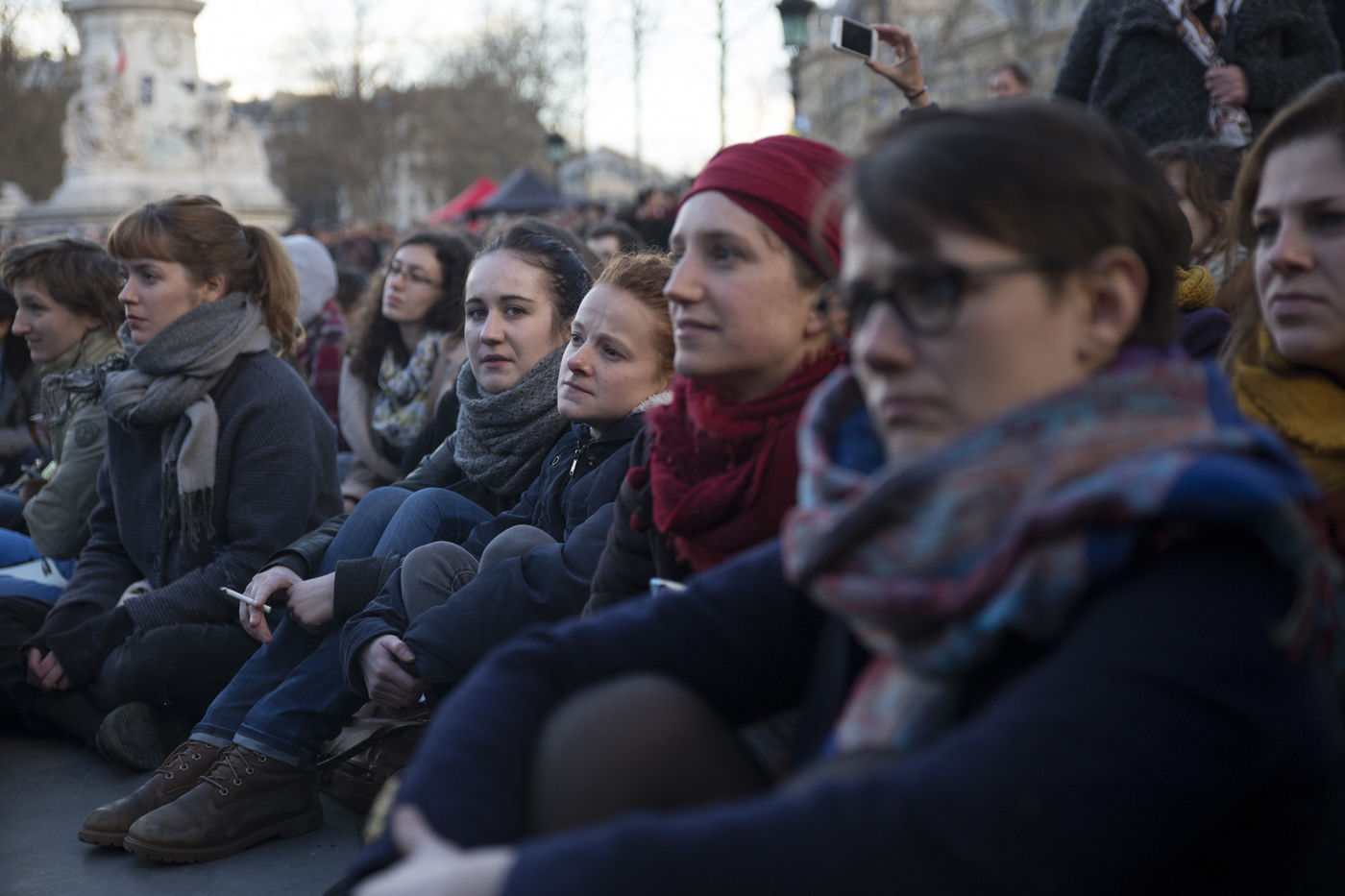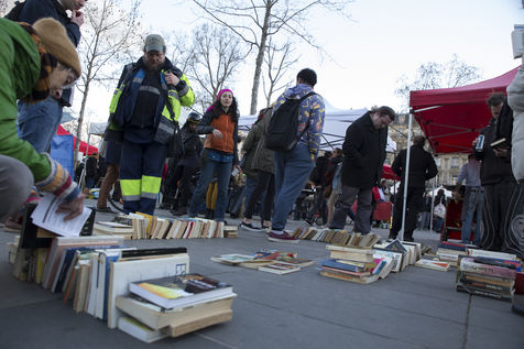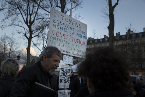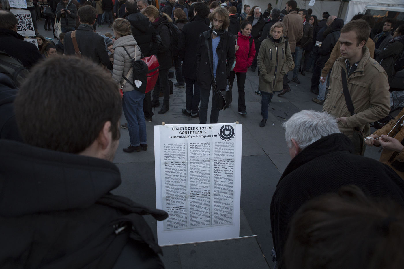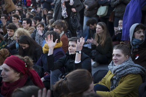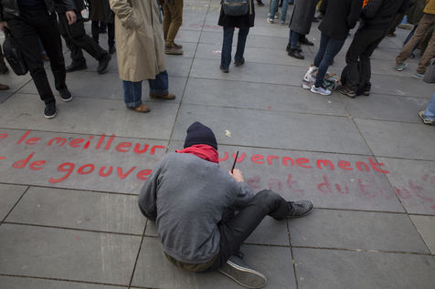 France, Paris, Place de la République. Thursday April 7 or March 38 - 2016. Eighth Nuit Debout, the movement born from the occupation of the Place de la République after the March 31 demonstration against the labor code reform project. Very largely inspired by the Spanish Indignés, this decentralized and heterogeneous agora which, well beyond the El Khomri law, gave itself for mission "to invent the society of tomorrow". The "infrimerie" point