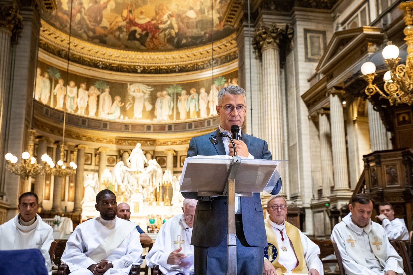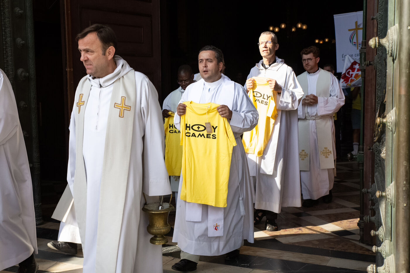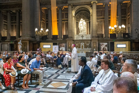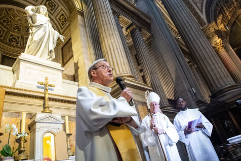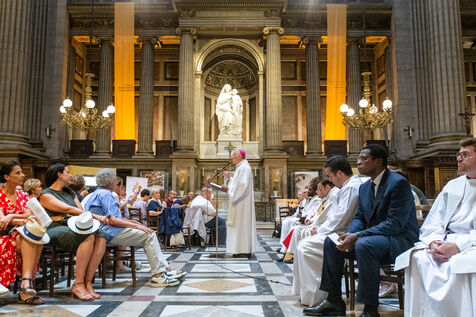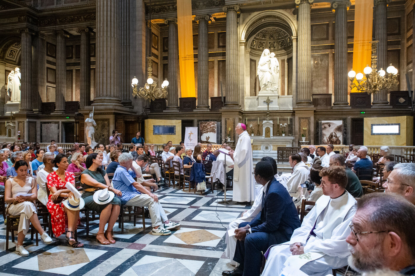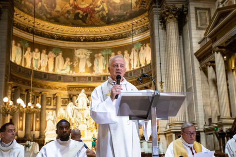 FRANCE, Paris, Eglise de la Madeleine (Paris 8e), Saturday, September 9, 2023. Benediction of the Notre-Dame des Sportifs chapel, a celebration presided over by Monsignor Philippe Marsset, auxiliary bishop of Paris. This chapel will be dedicated to athletes from the Rugby World Cup to the 2024 Olympic Games.