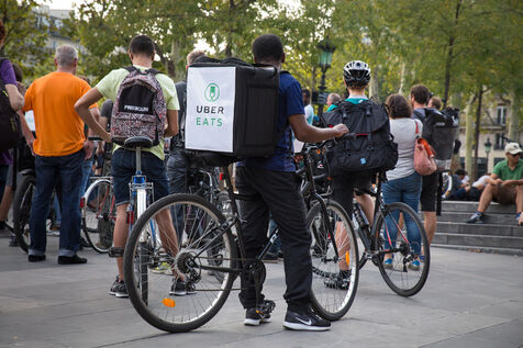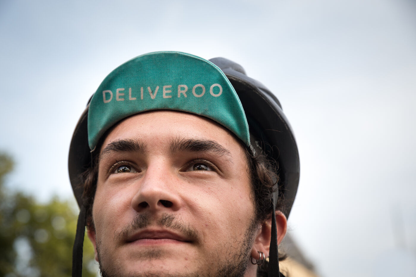 Sunday, August 27, 2017, Paris, France. Thirty to forty parisian bicycle drivers have gathered in the Place de la République. Deliveroo couriers joined by some of the other platforms (Foodora, Stuart and UberEATS) contest the new contracts implemented by Deliveroo and try to organize the fight against the precariousness of their condition.