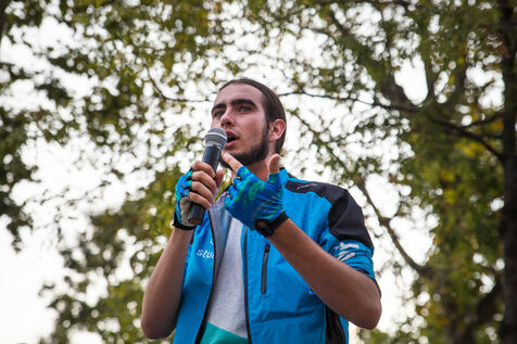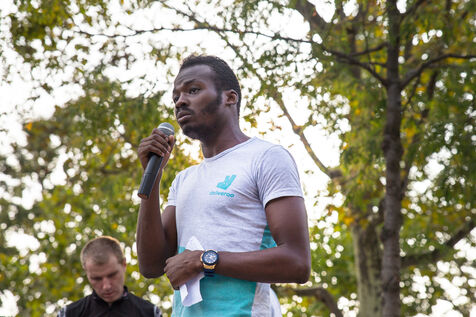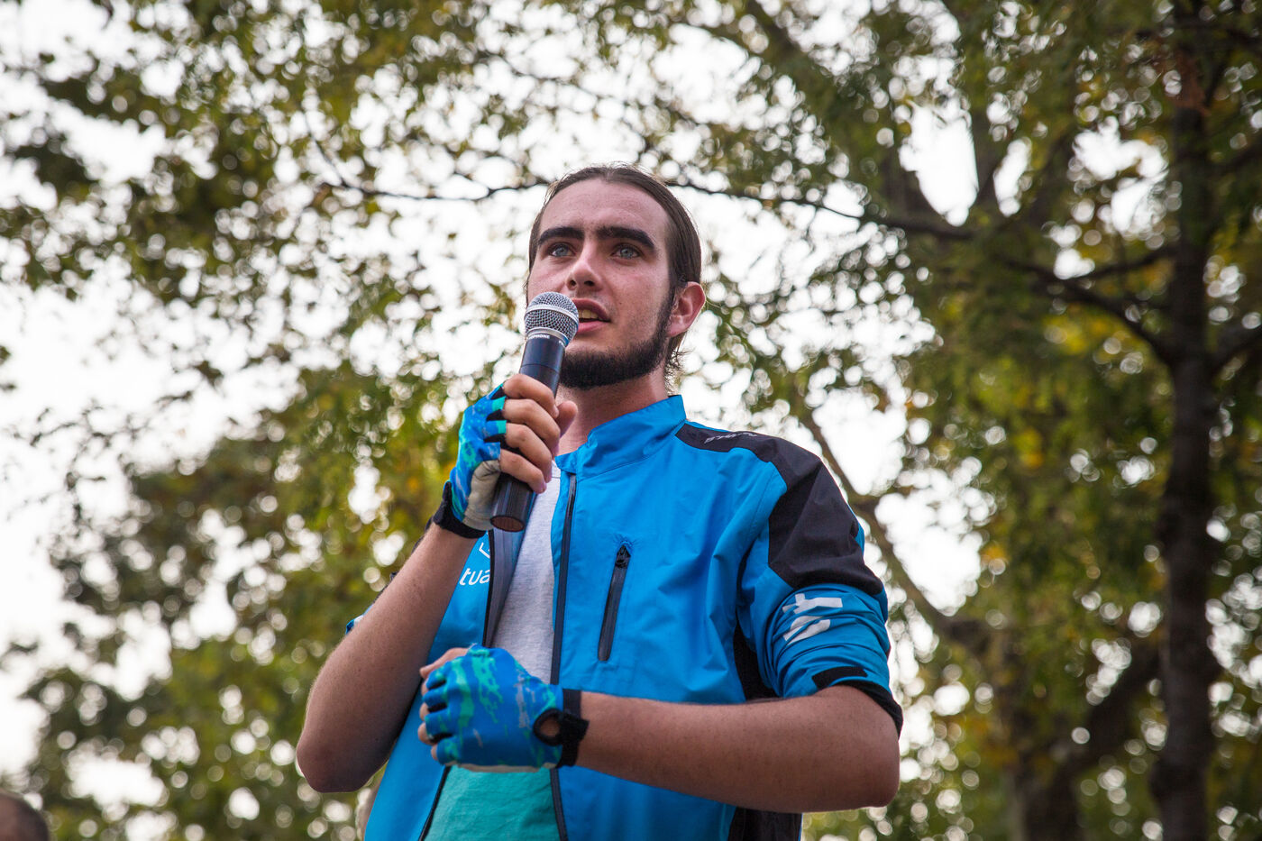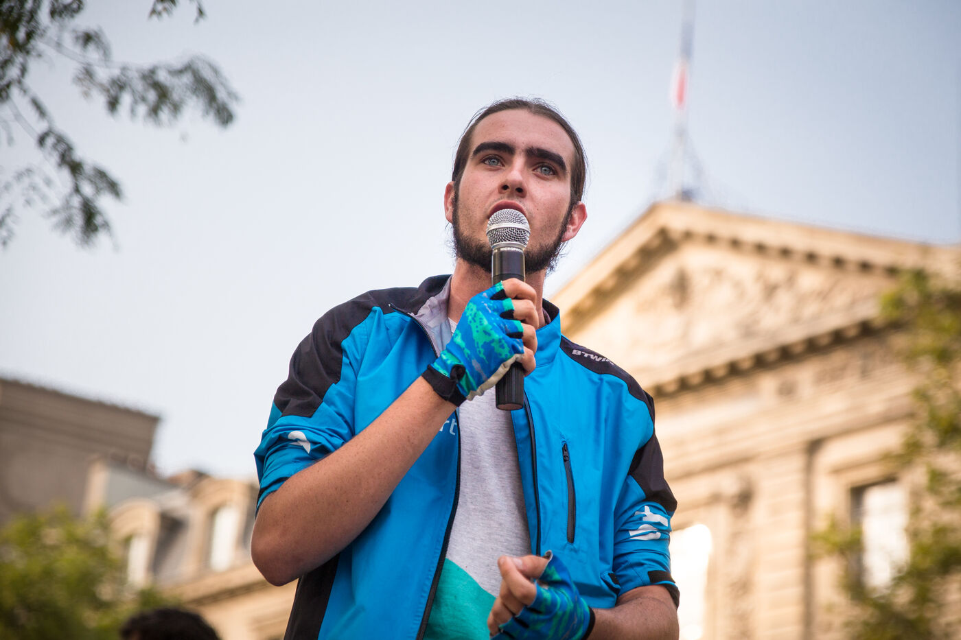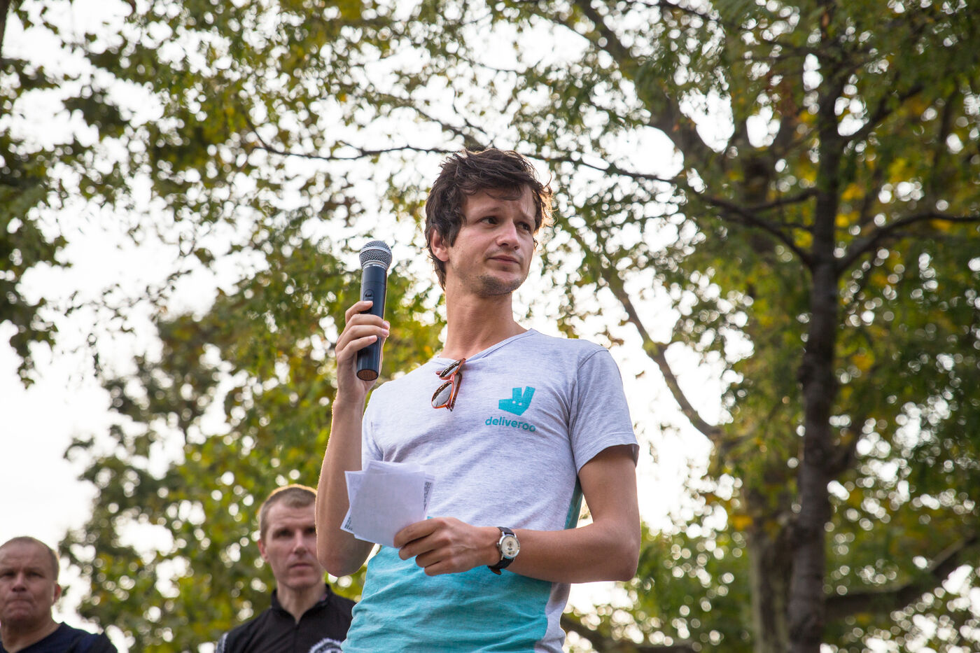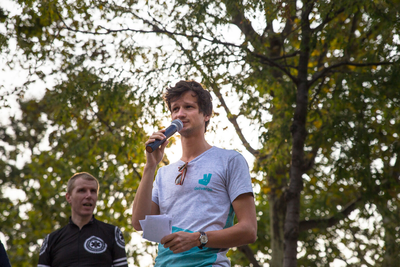 Dimanche 27 août 2017, Paris, France. Trente à quarante livreurs à vélos parisiens se sont rassemblés place de la République. Les coursiers Deliveroo rejoints par certains d'autres plateformes (Foodora, Stuart et UberEATS) contestent les nouveaux contrats mis en application par Deliveroo et tente d'organiser la lutte contre la précarité de leur condition.