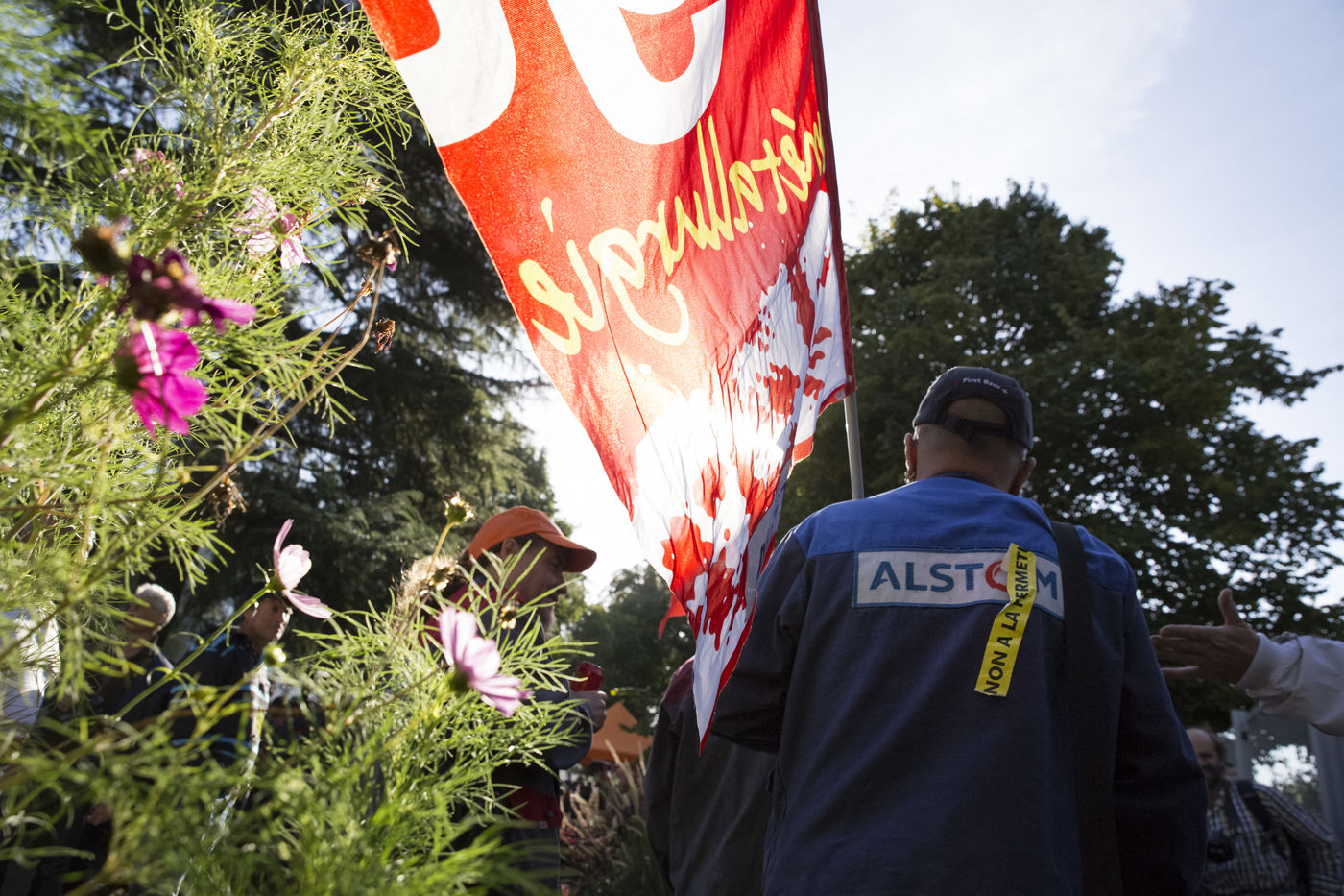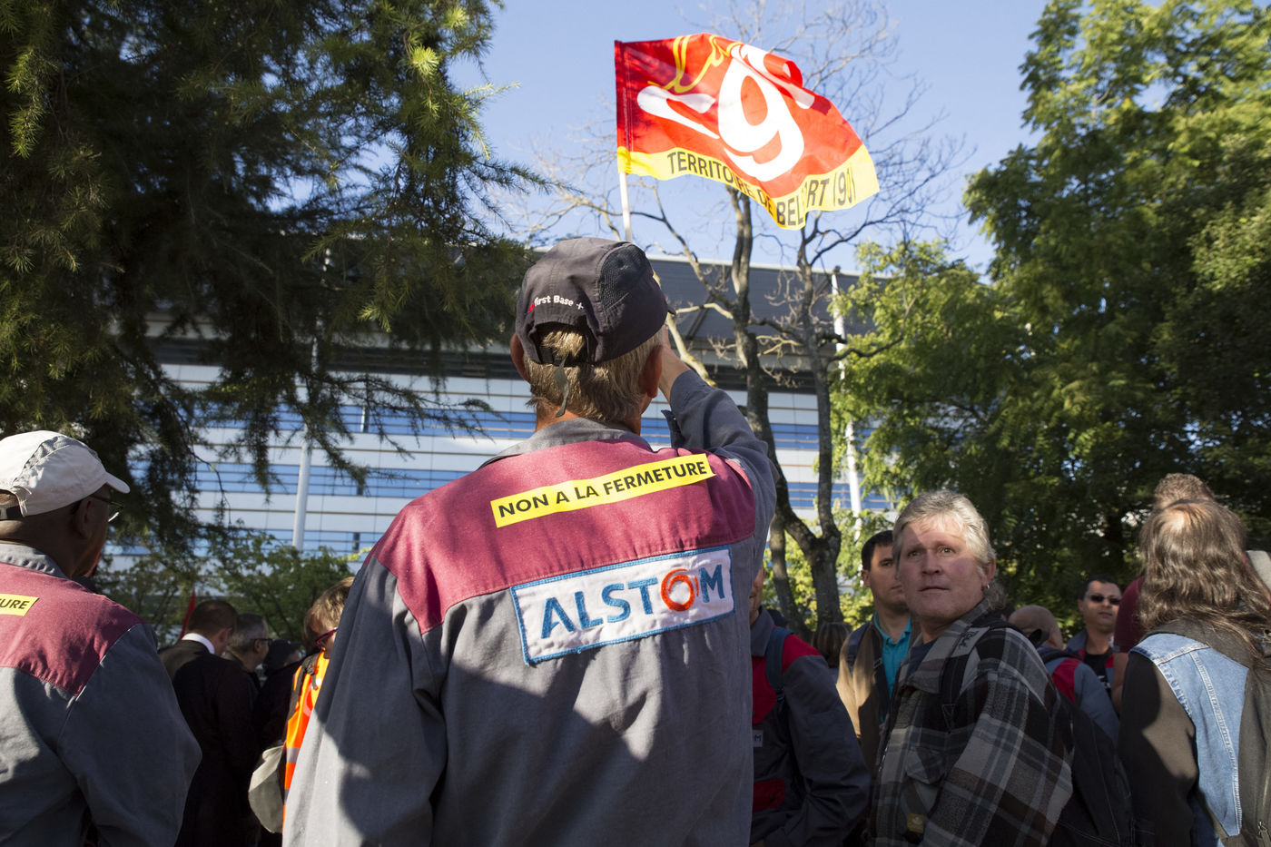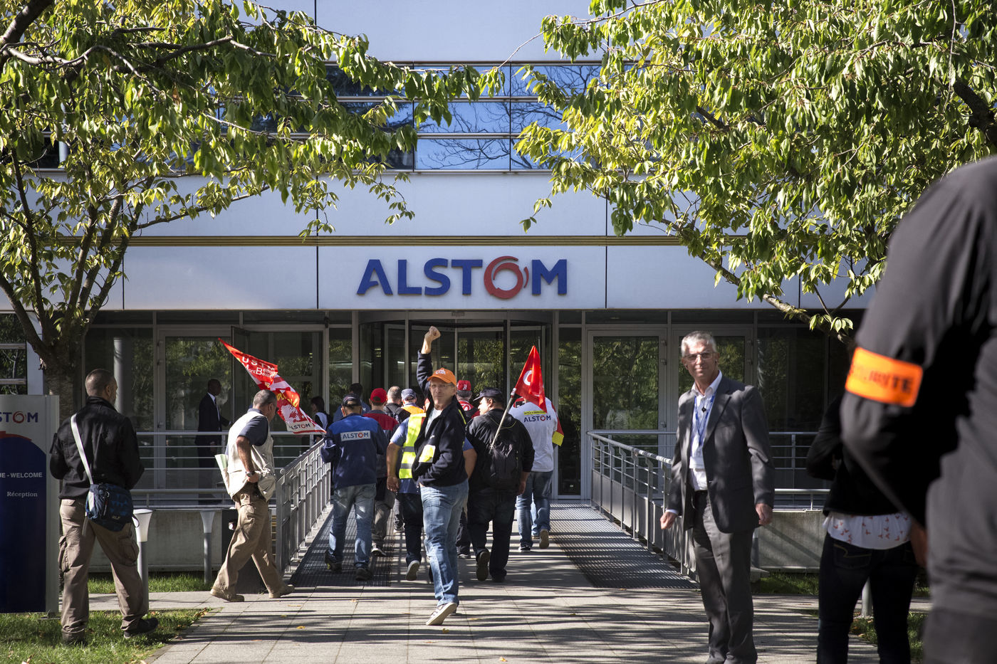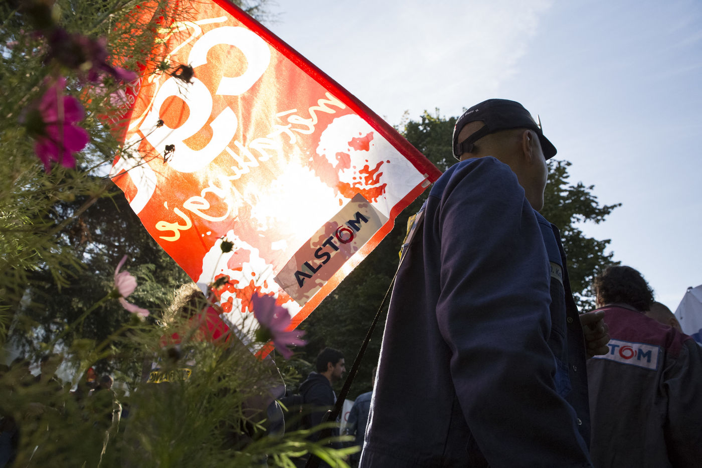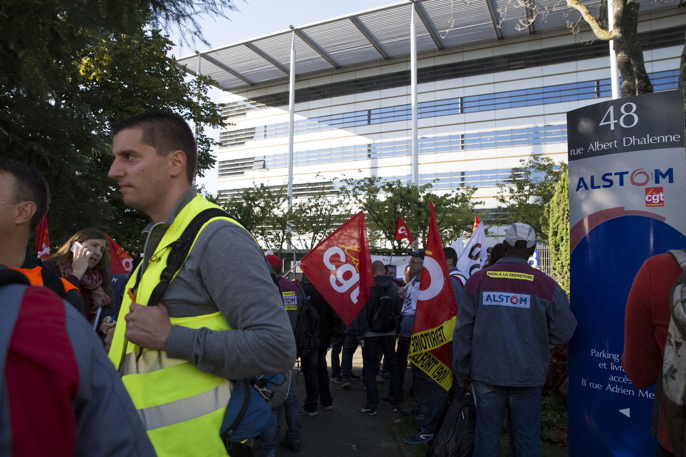 Saint Ouen, France, September 27, 2016. Rally against layoffs in front of Alstom headquarters. Employees demonstrate after the announcement of the closure of the historical site of Belfort.