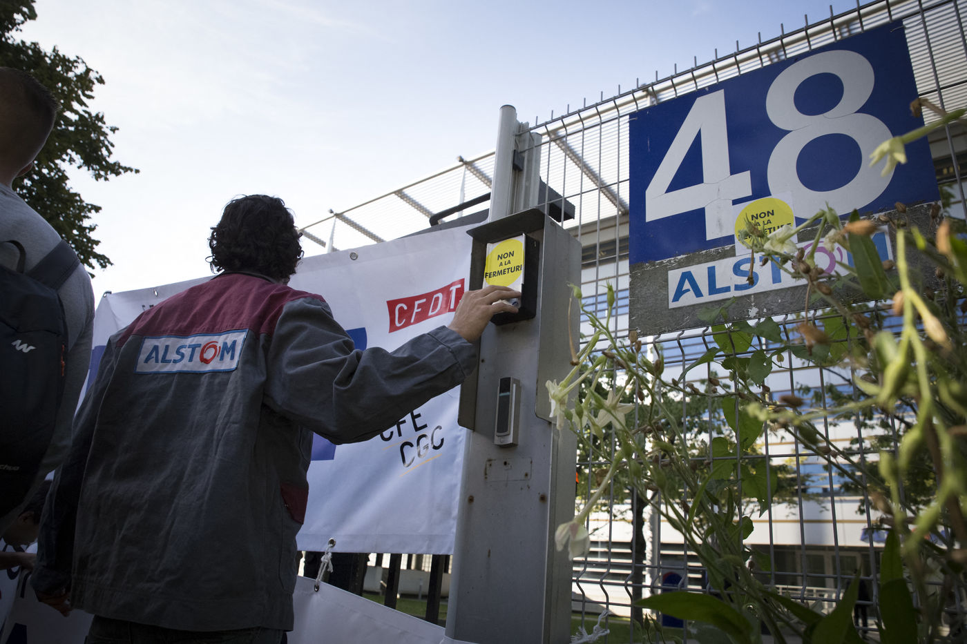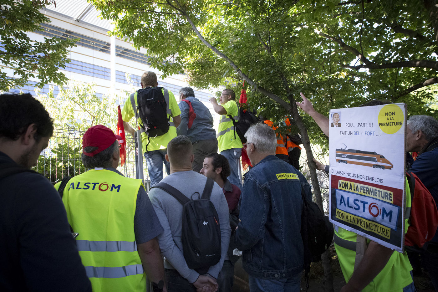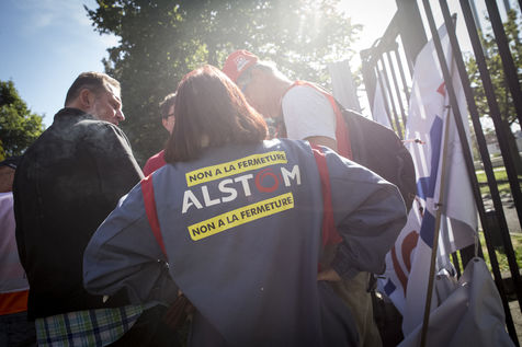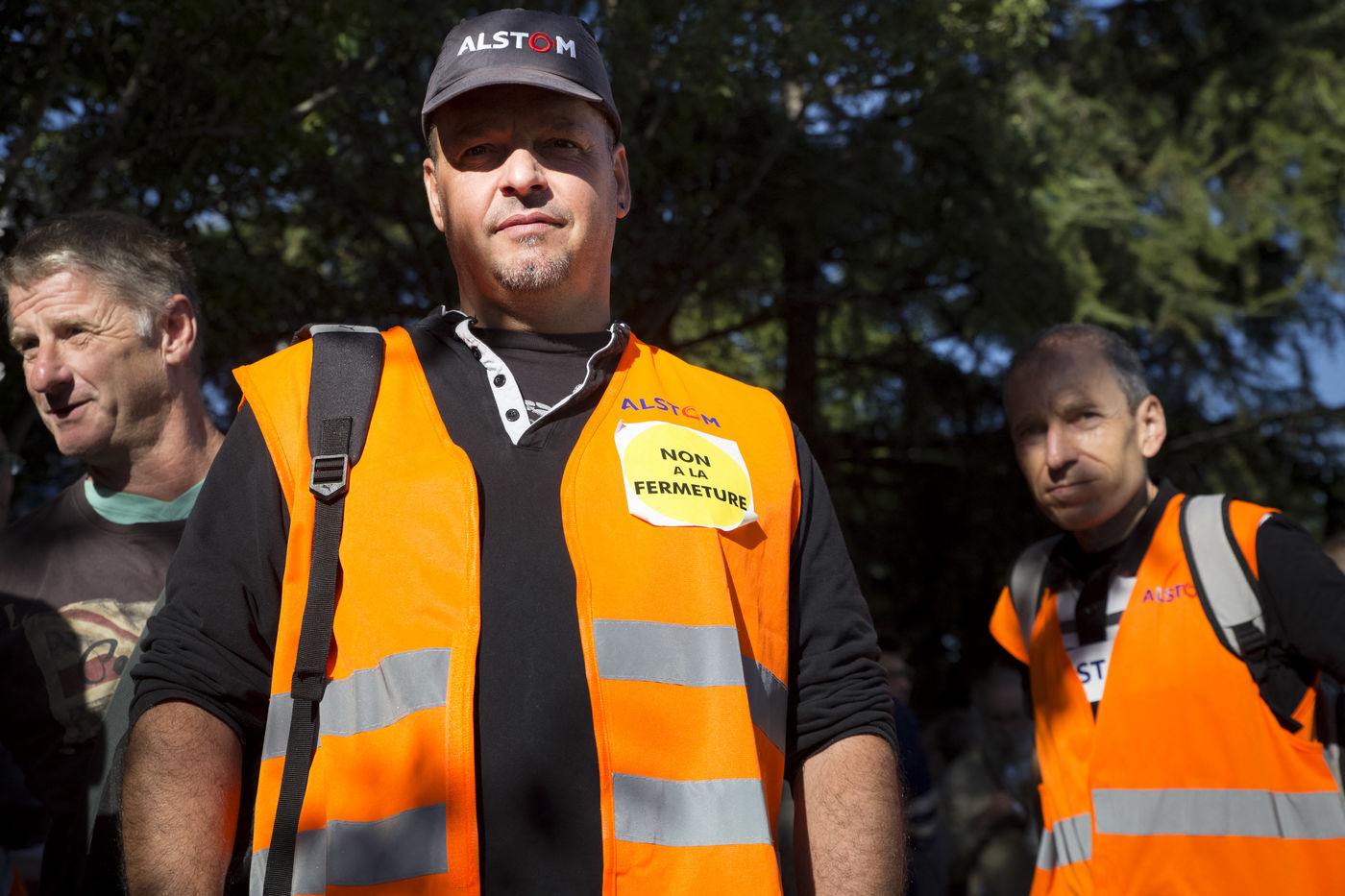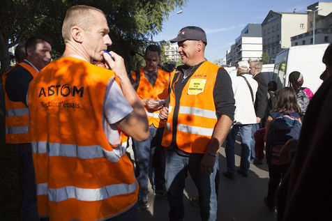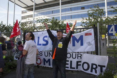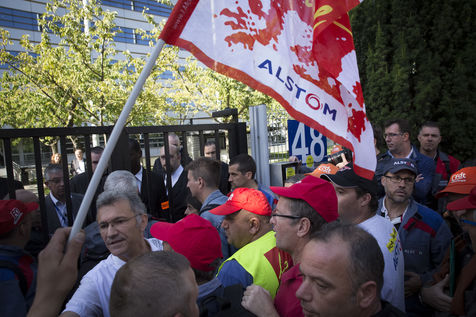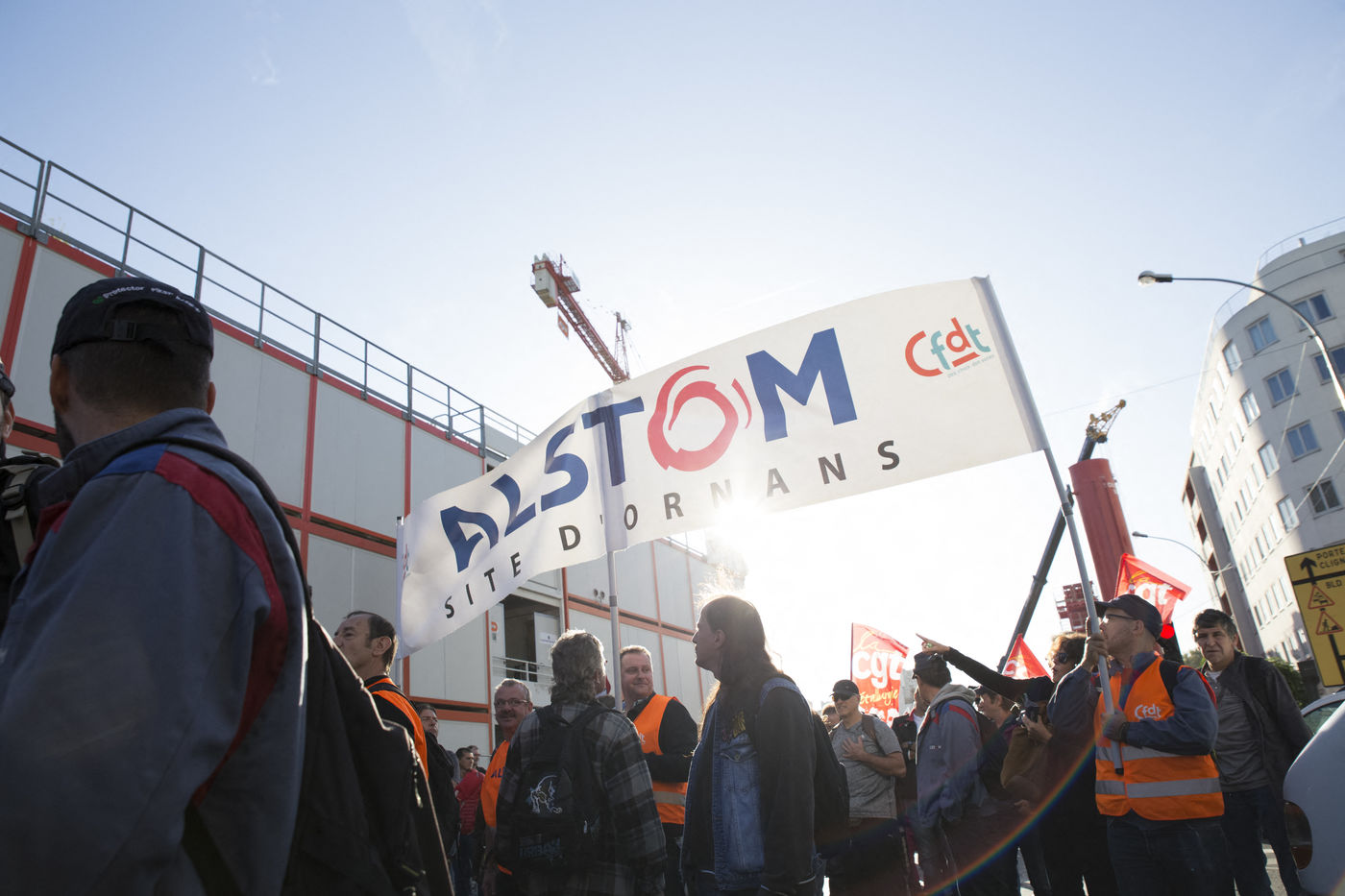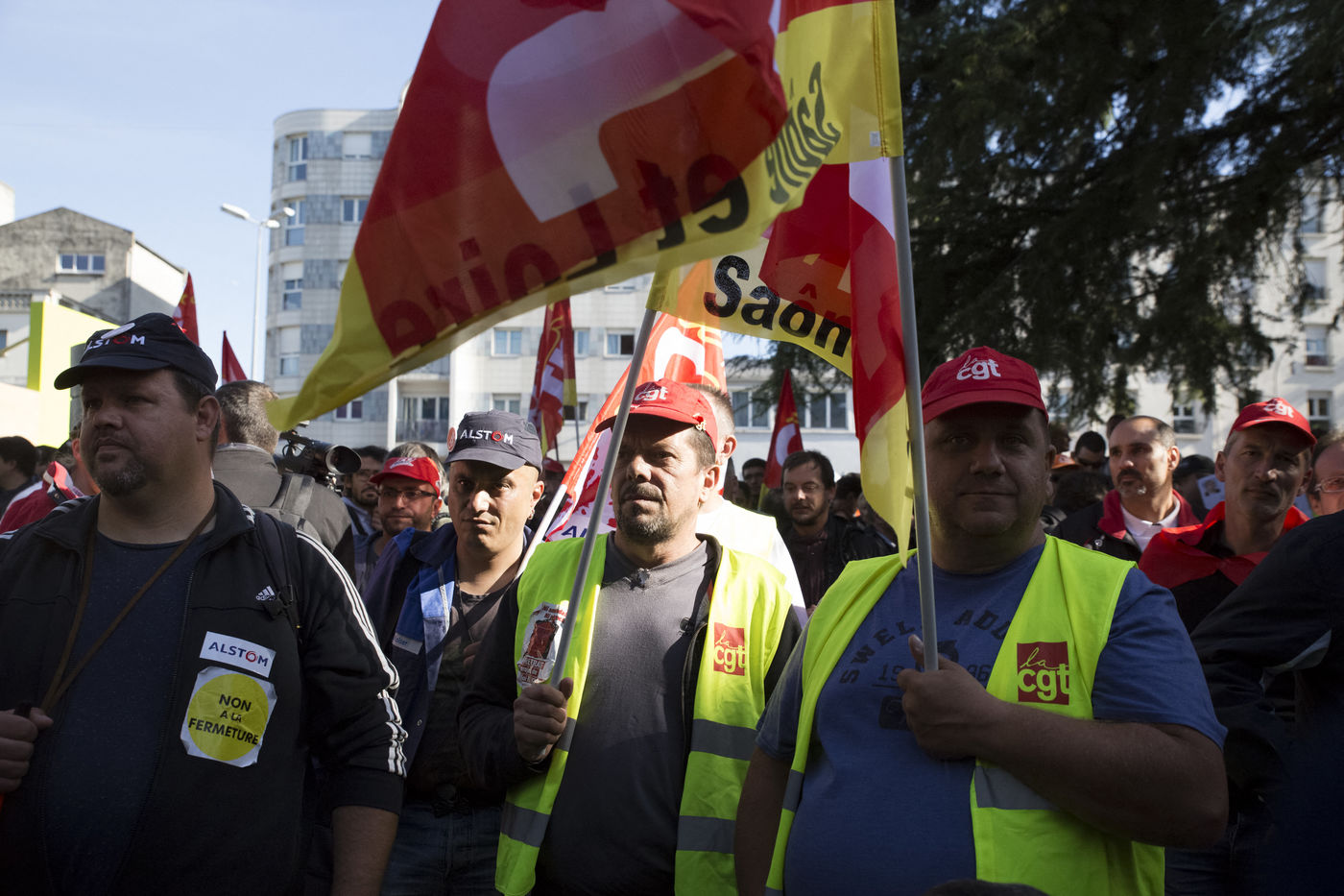 Saint Ouen, France, September 27, 2016. Rally against layoffs in front of Alstom headquarters. Employees demonstrate after the announcement of the closure of the historical site of Belfort.