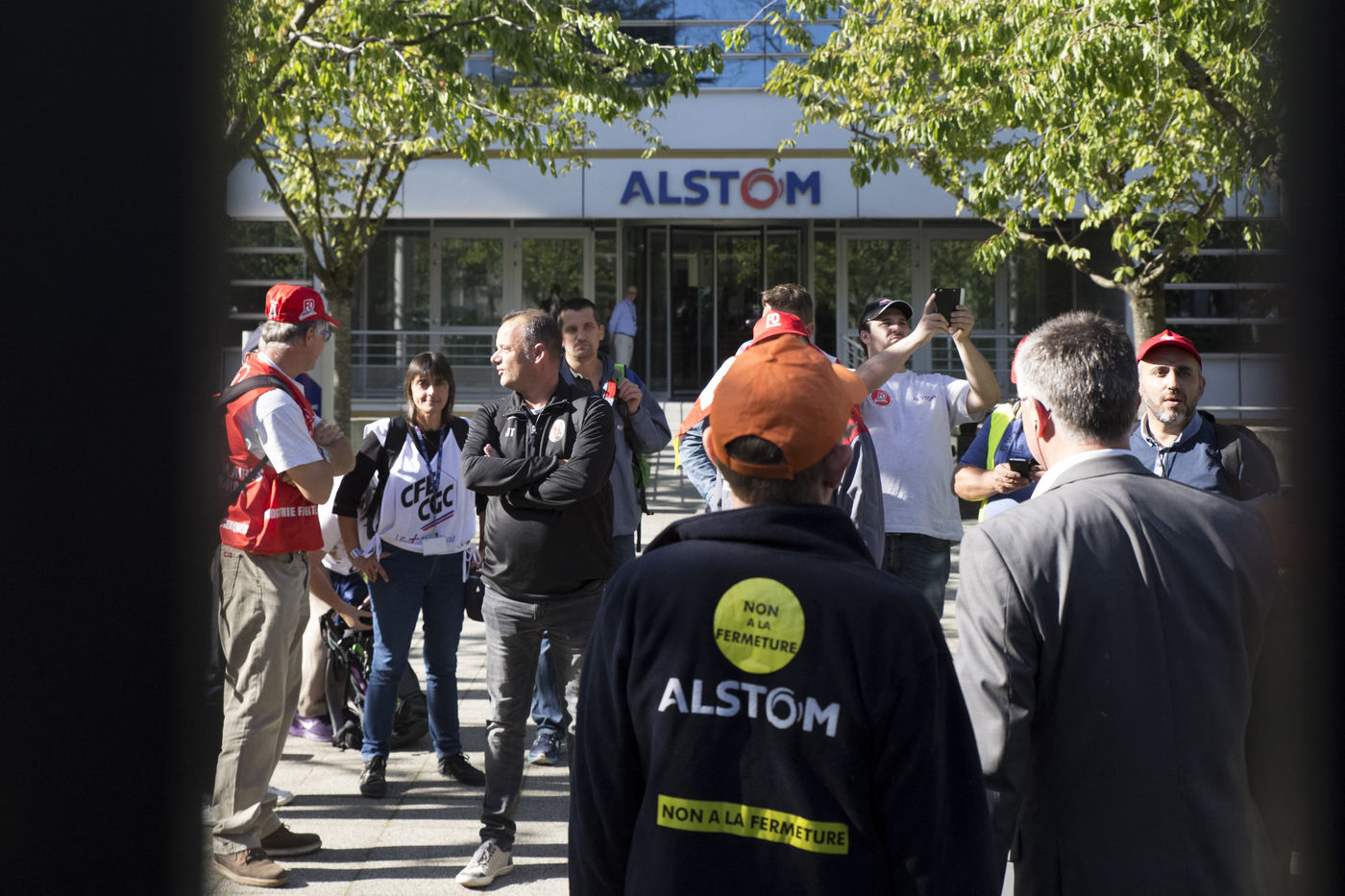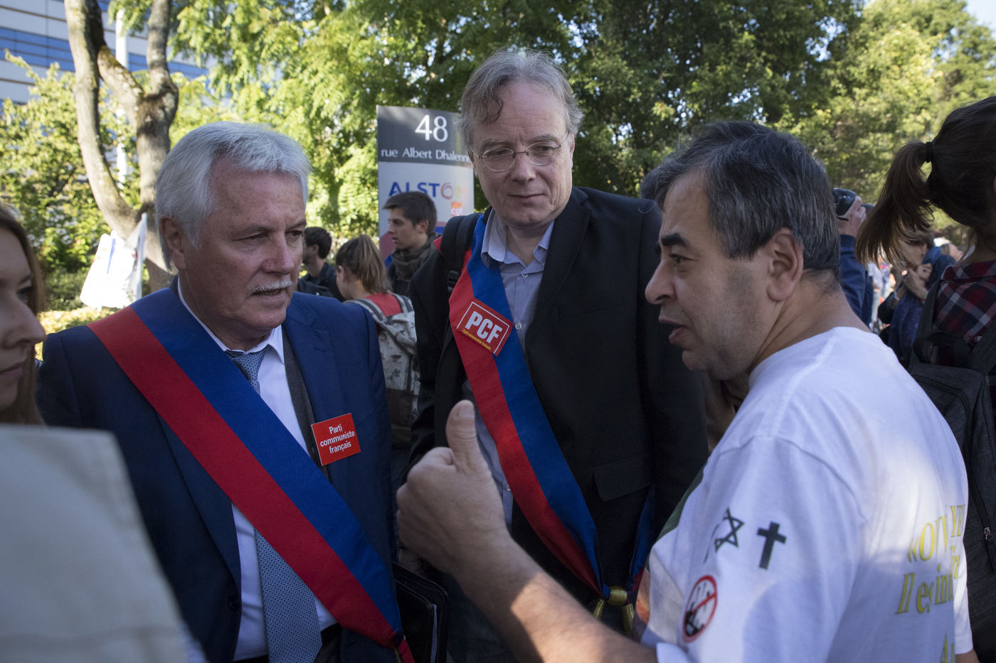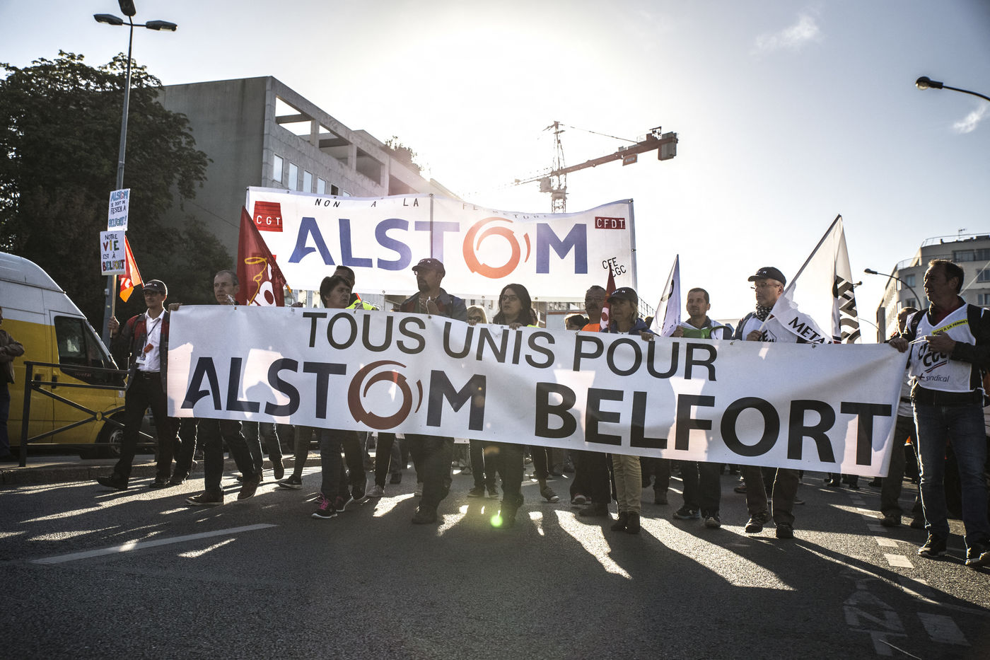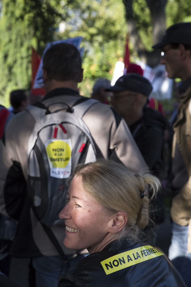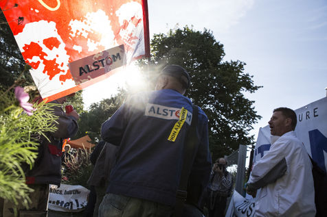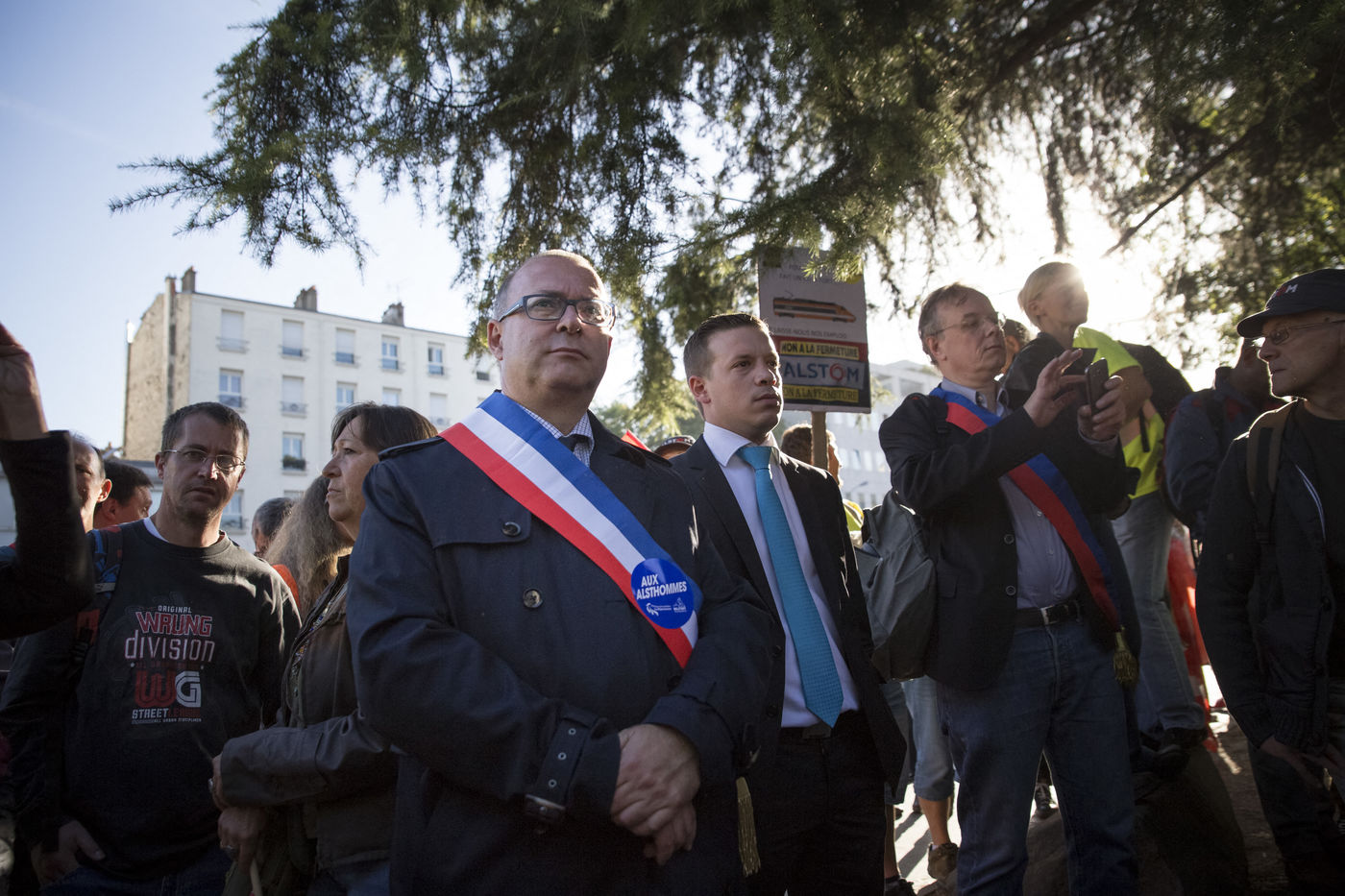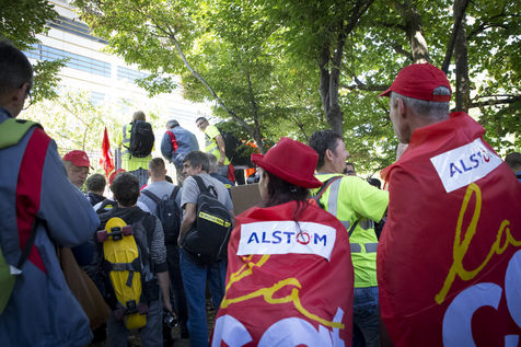 Saint Ouen, France, September 27, 2016. Rally against layoffs in front of Alstom headquarters. Employees demonstrate after the announcement of the closure of the historical site of Belfort.