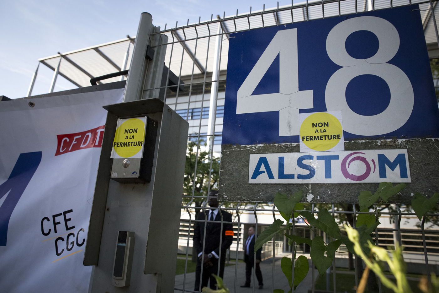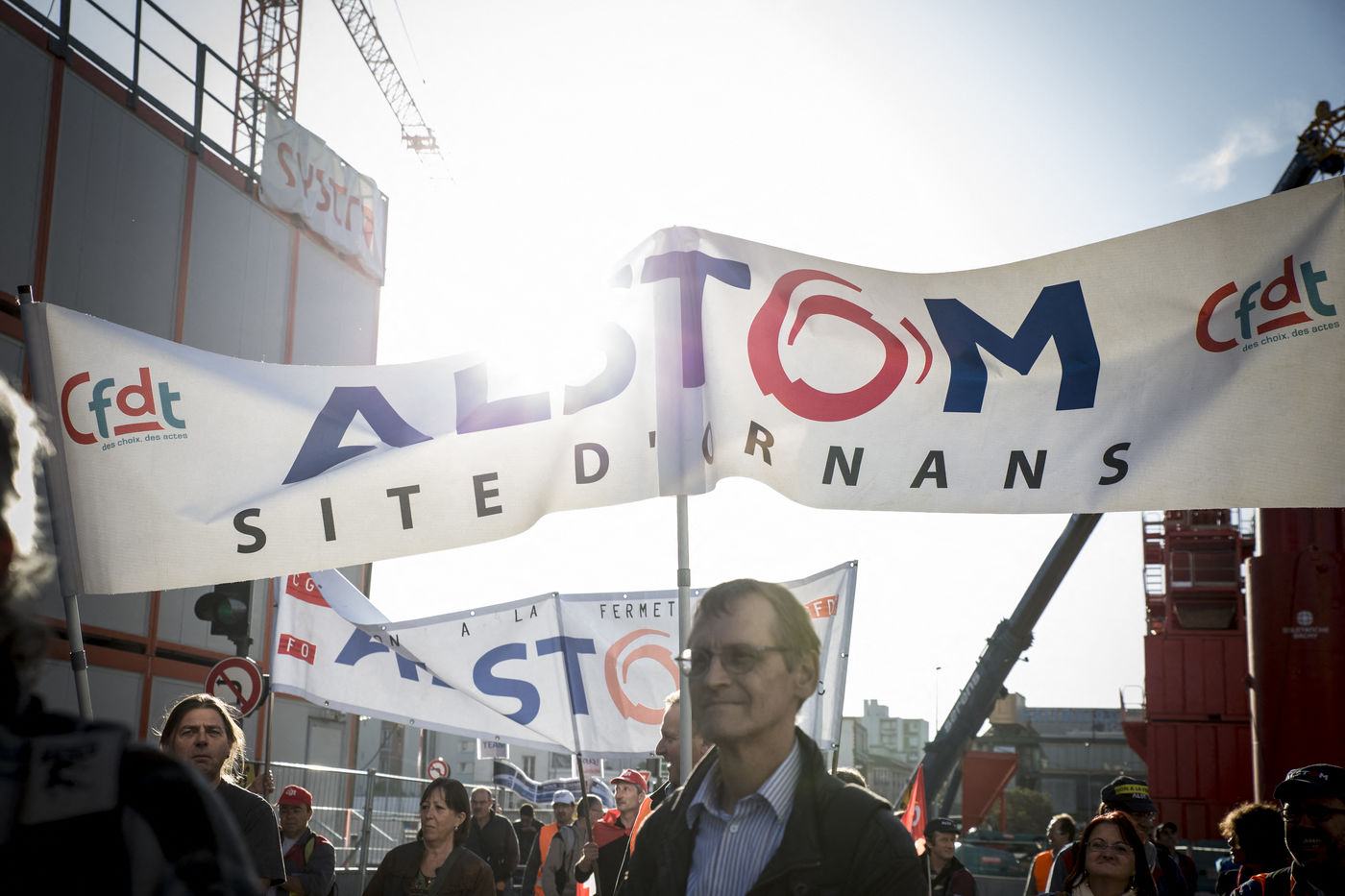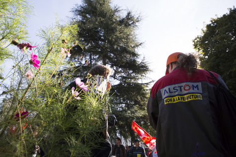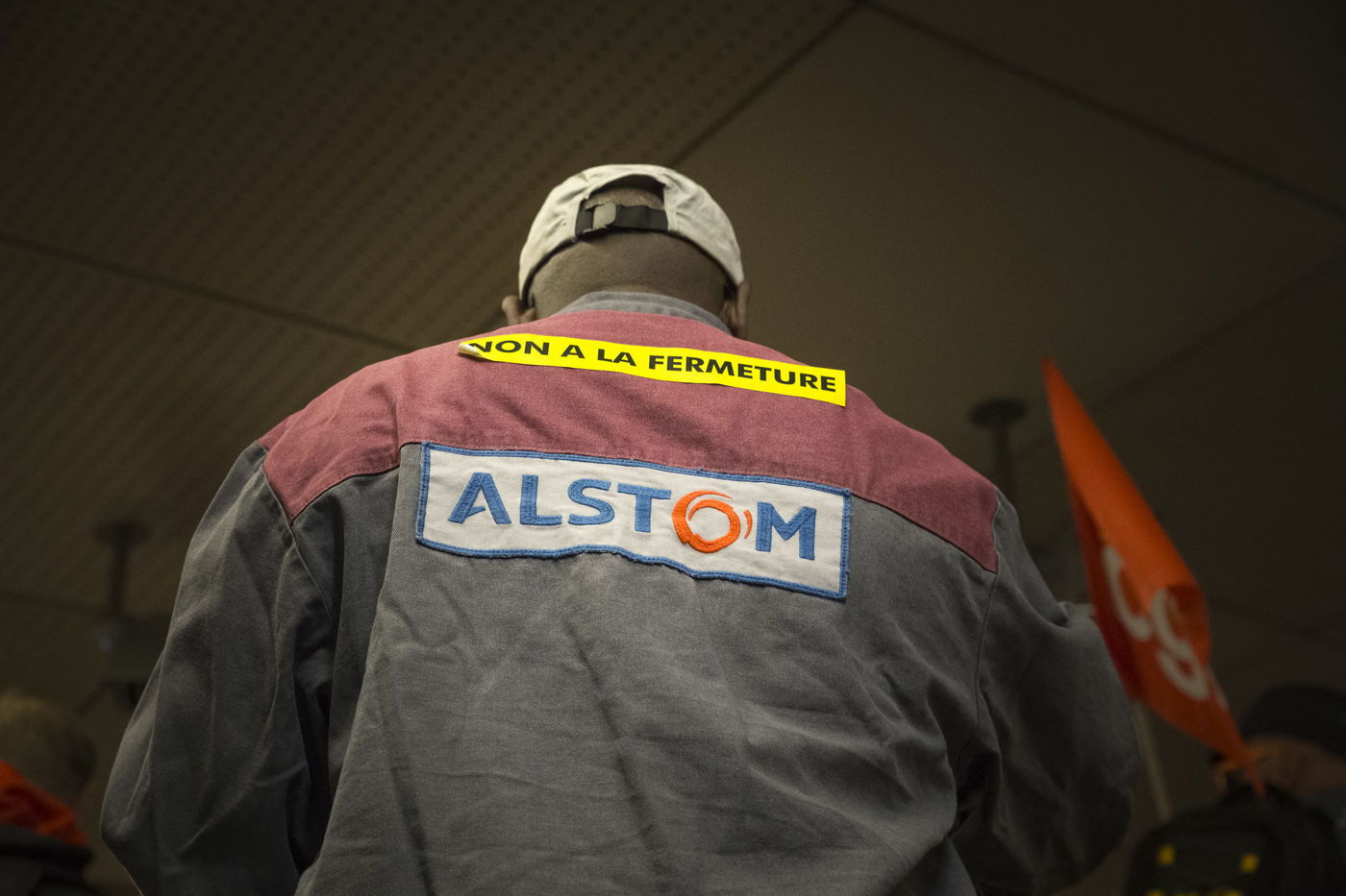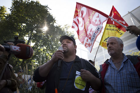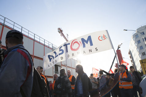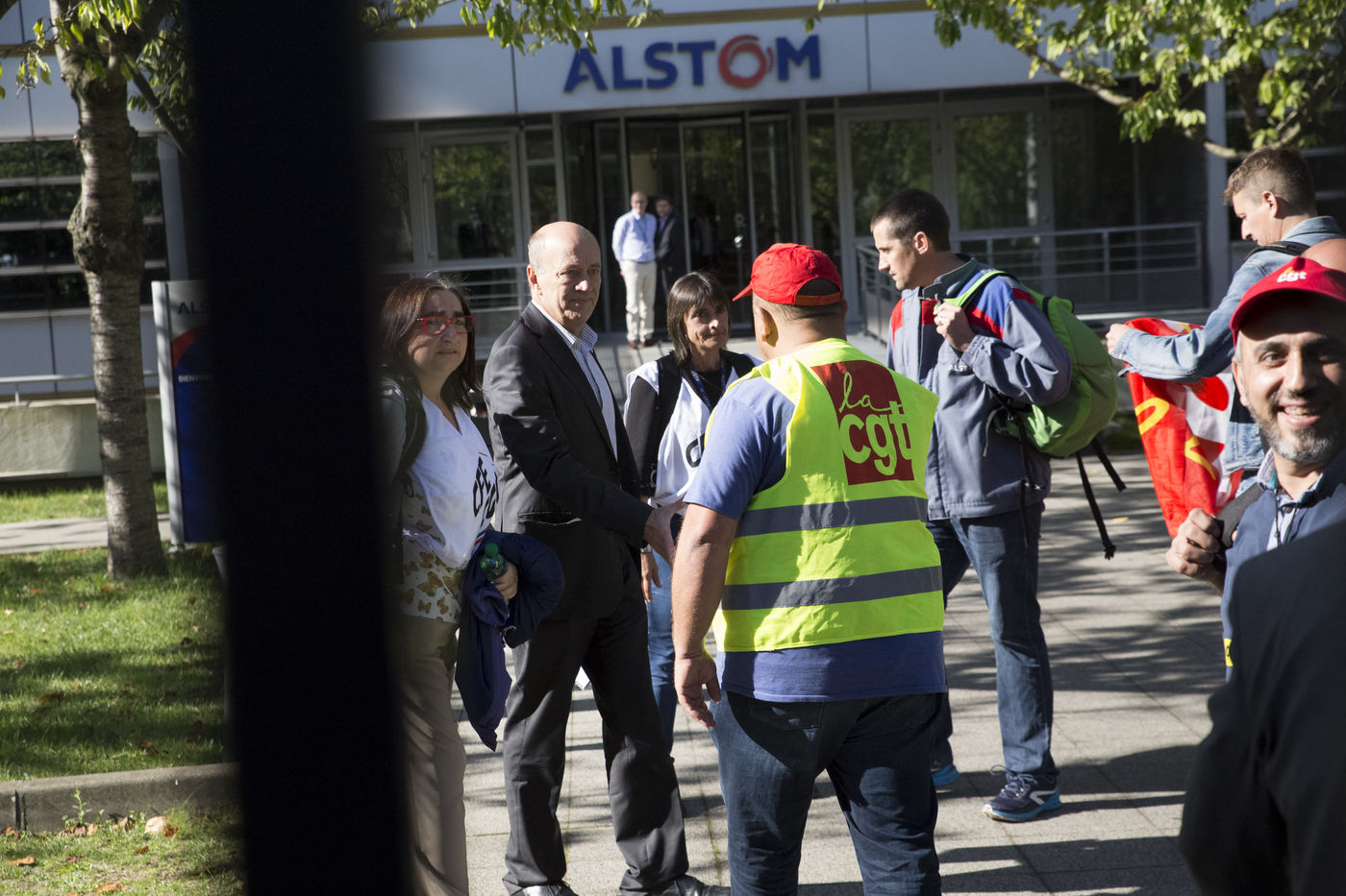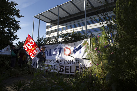Saint Ouen, France, September 27, 2016. Rally against layoffs in front of Alstom headquarters. Employees demonstrate after the announcement of the closure of the historical site of Belfort.