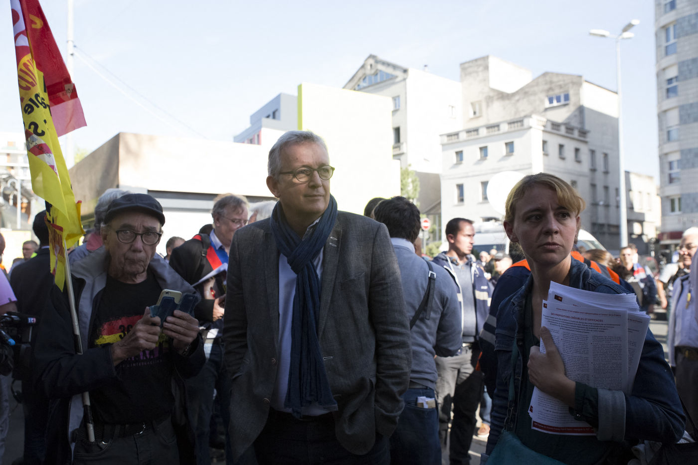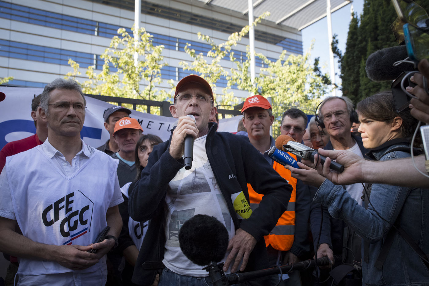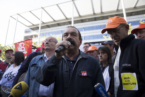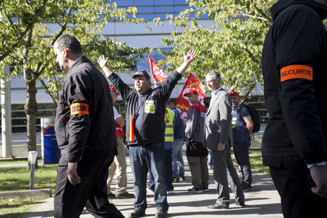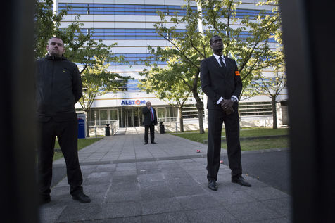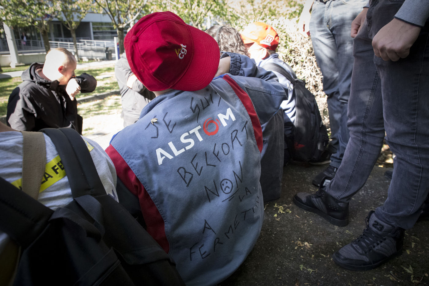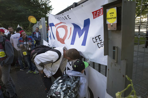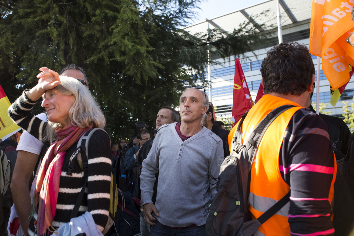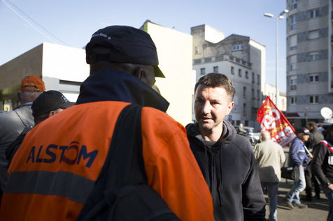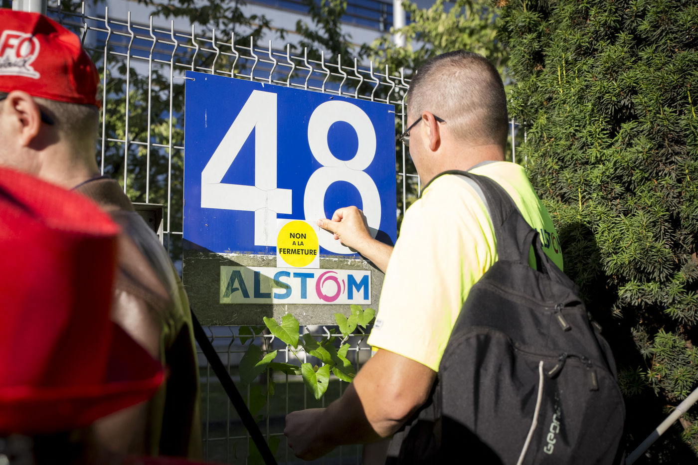 Saint Ouen, France, September 27, 2016. Rally against layoffs in front of Alstom headquarters. Employees demonstrate after the announcement of the closure of the historical site of Belfort.