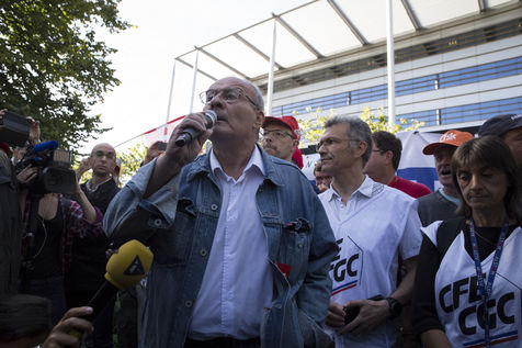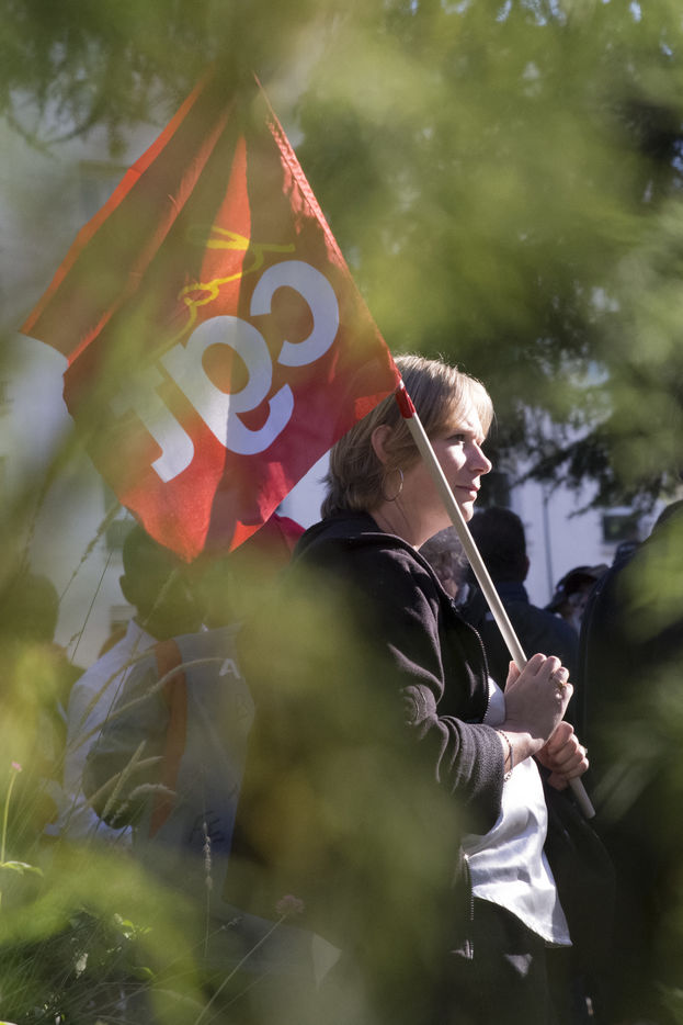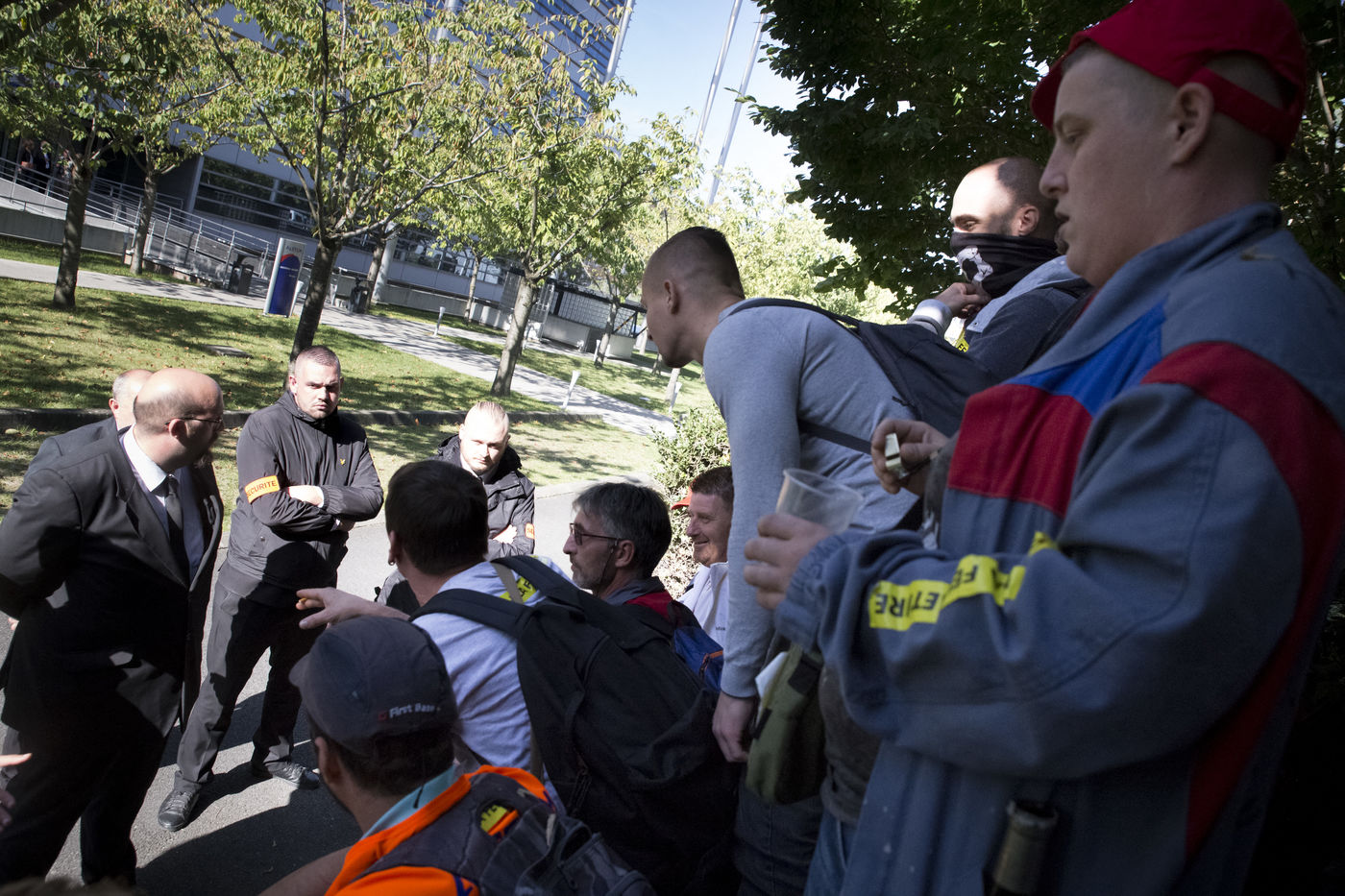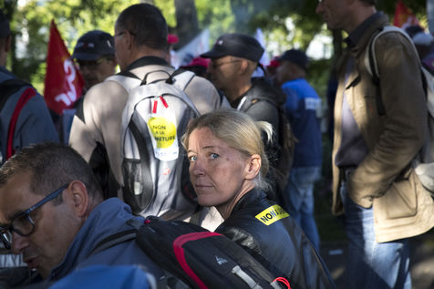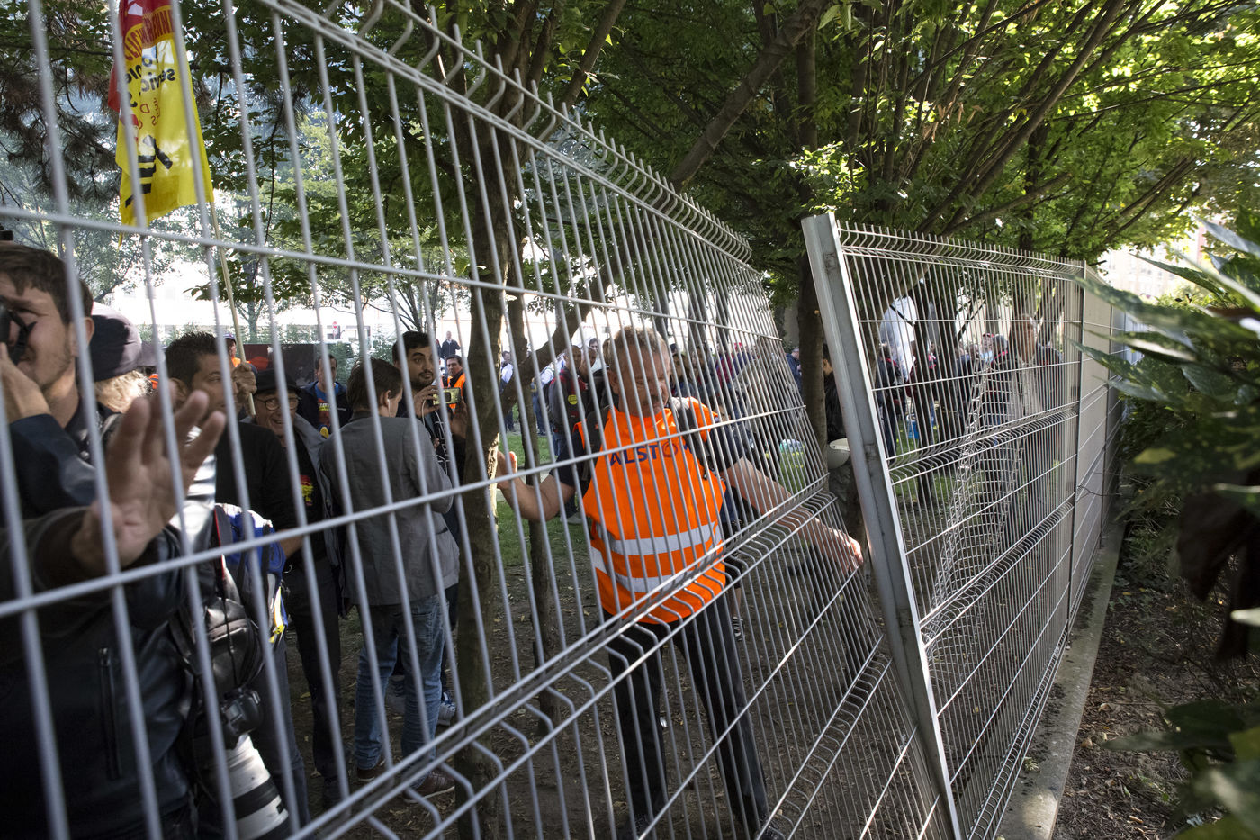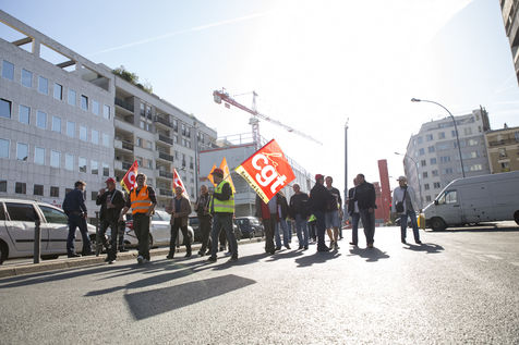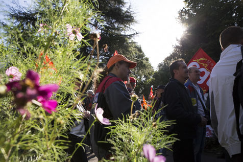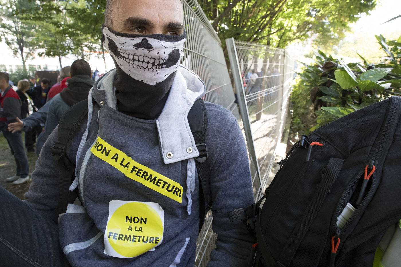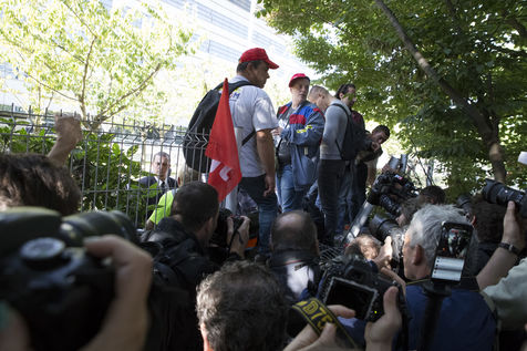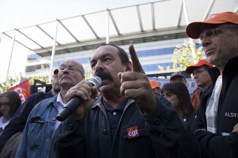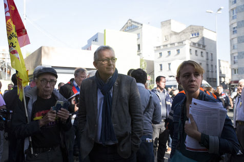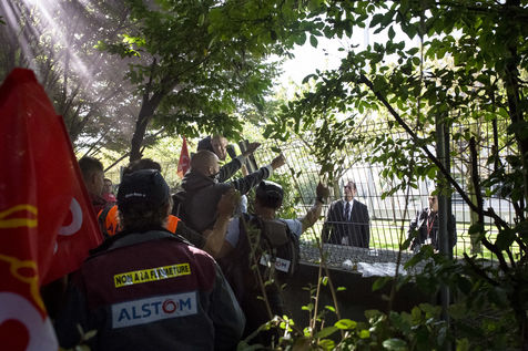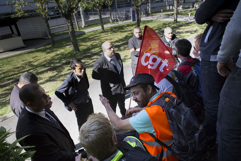 Saint Ouen, France, September 27, 2016. Rally against layoffs in front of Alstom headquarters. Employees demonstrate after the announcement of the closure of the historical site of Belfort.