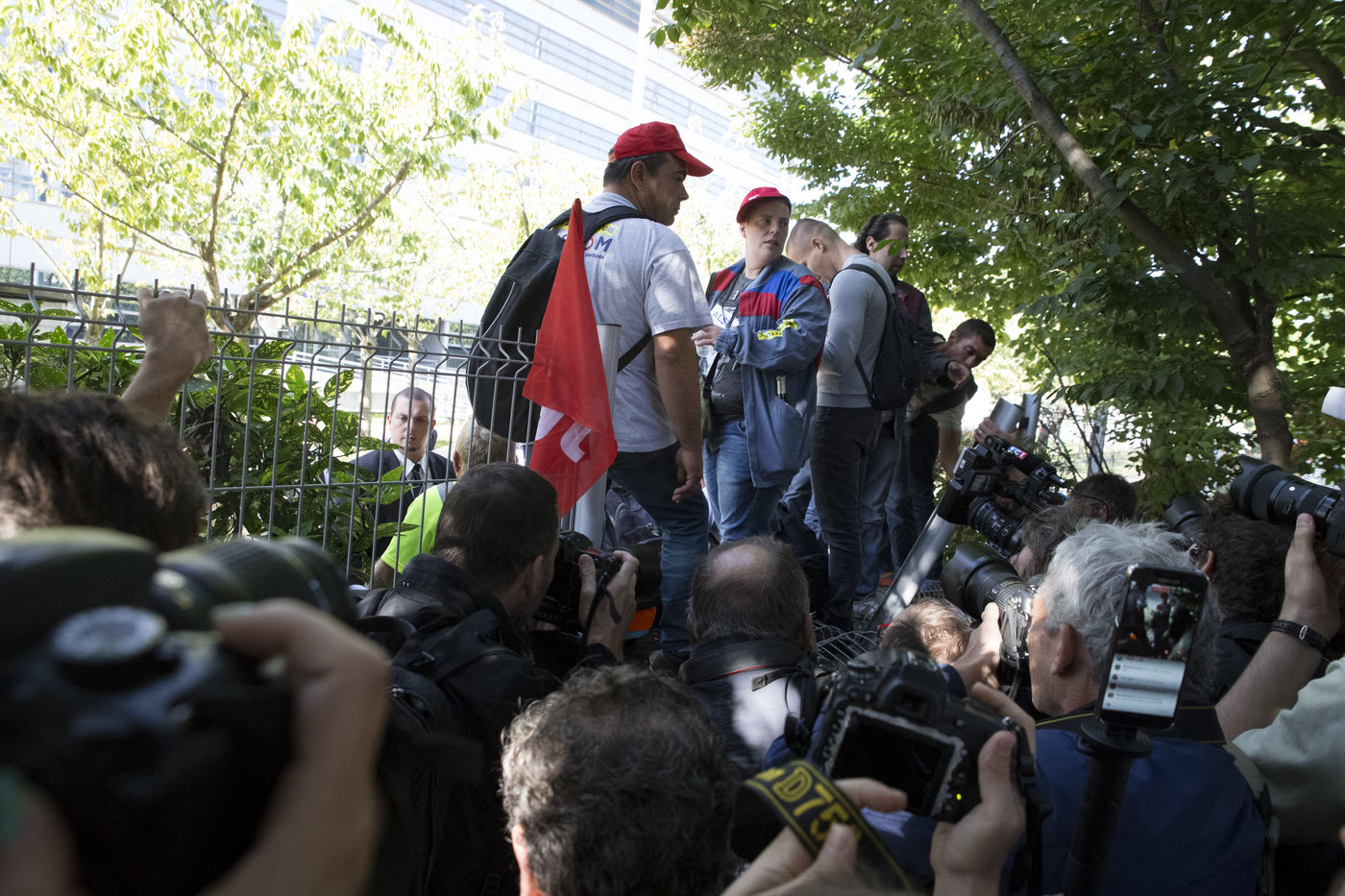 Saint Ouen, France, 27 septembre 2016. Rassemblement contre les licenciements devant le siège d'Alstom. Les salariés manifestent après l'annonce de la fermeture du site historique de Belfort.