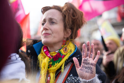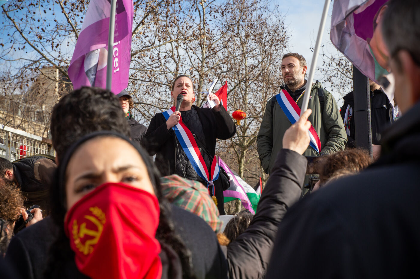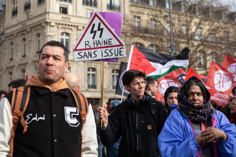 FRANCE, Paris, February 22, 2025. Antifascist demonstration called by the Association Culturelle des Travailleurs Immigres de Turquie (ACTIT) and Young Struggle, following a violent stabbing by members of the ultra-right. Anti-fascist activists and left-wing sympathizers came to denounce the brutality of the extreme right, and the current climate of violence and xenophobia. They wanted to keep the streets free from fascist rule.