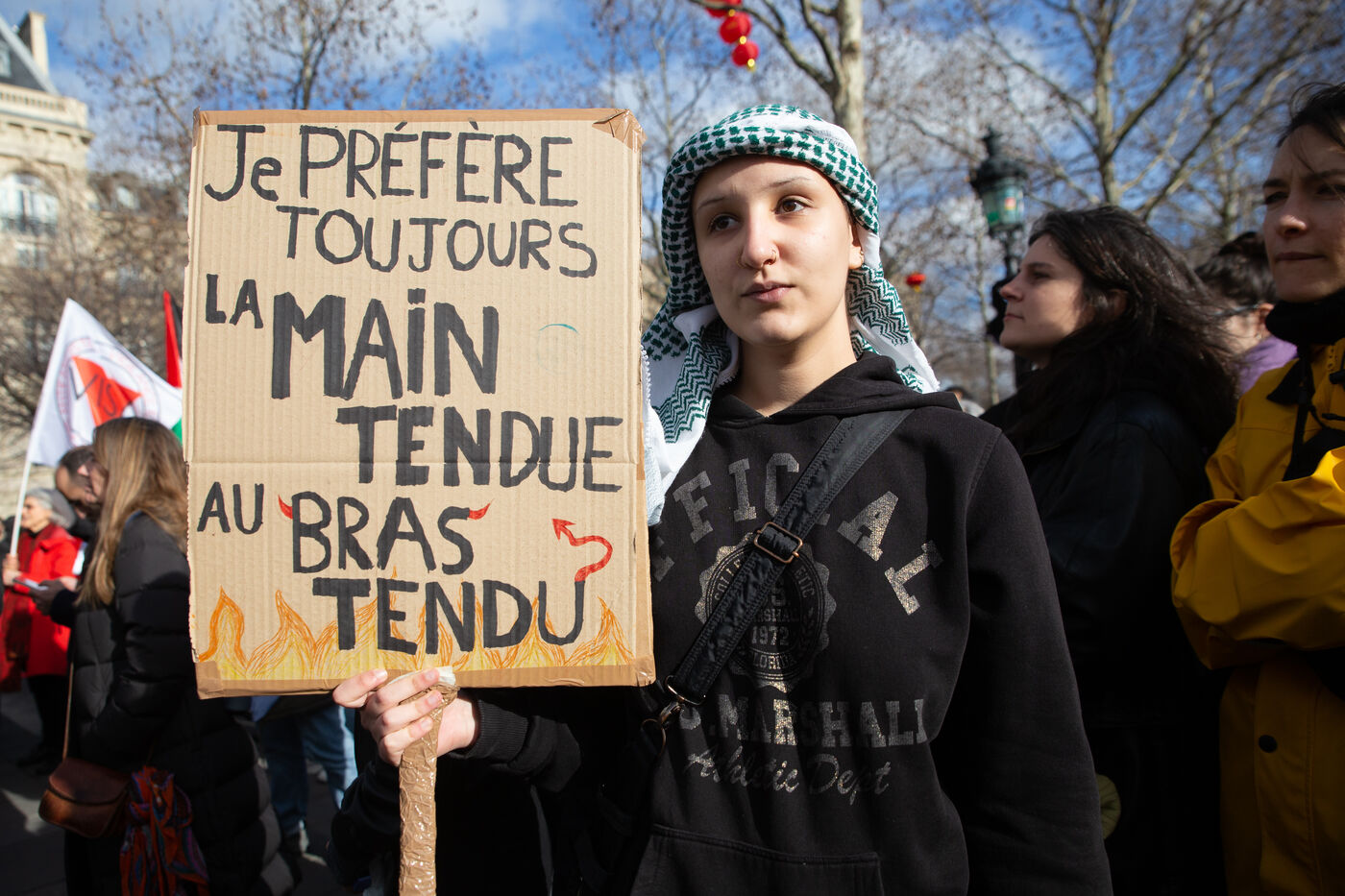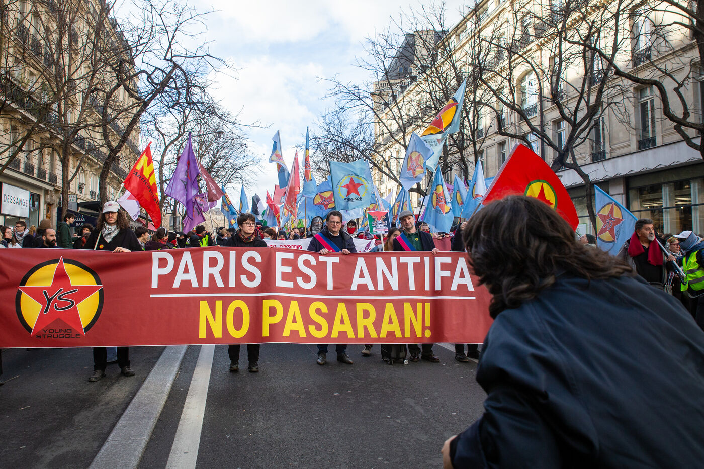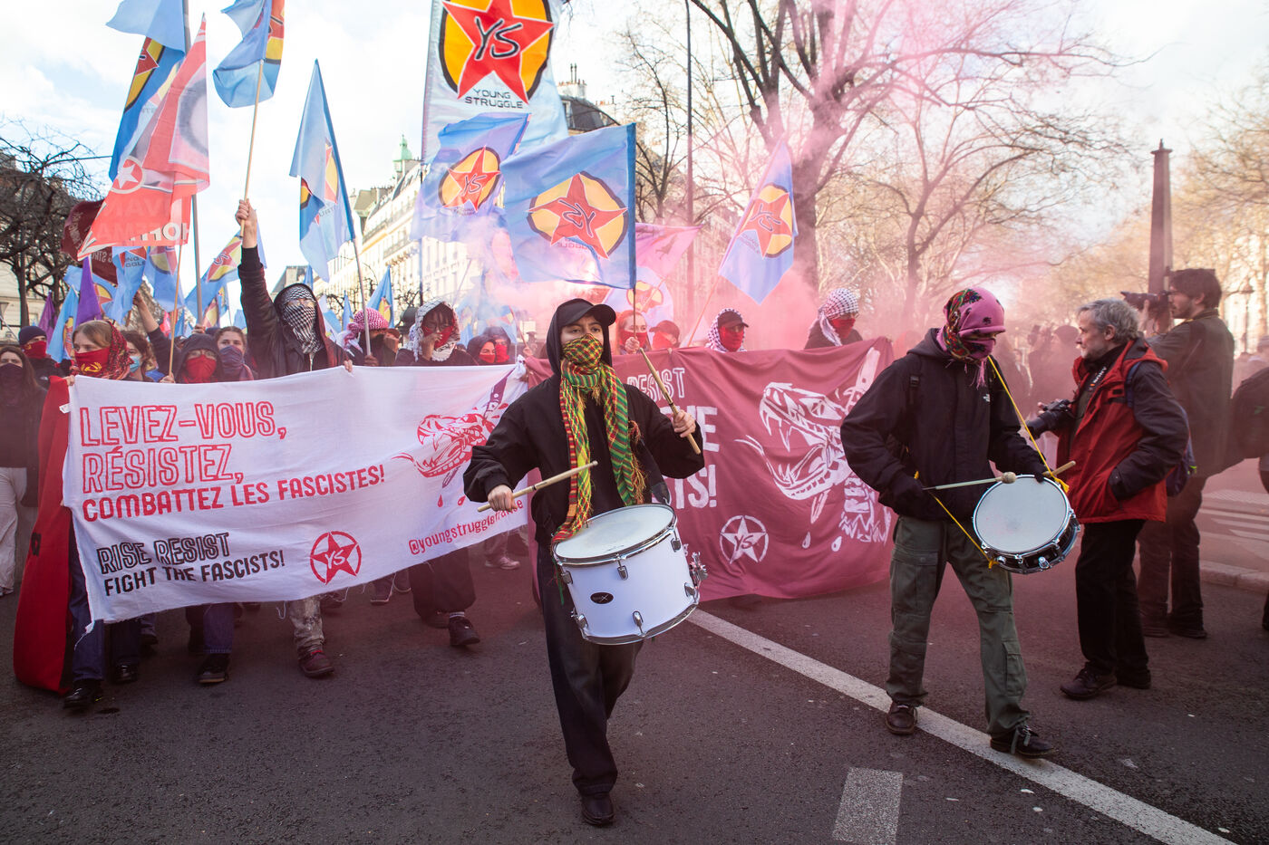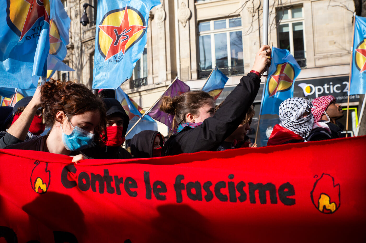 FRANCE, Paris, le 22 Fevrier 2025. Manifestation antifasciste a l appel de l Association Culturelle des Travailleurs Immigres de Turquie (ACTIT) et de Young Struggle, suite a une violente agression a l’arme blanche par des membres de l ultradroite. Militants antifascistes et sympathisants de gauche sont venus denoncer la brutalite de l extreme droite, le climat de violence et de xénophobie actuel. Ils ont voulu tenir la rue pour que les fascistes n y fassent pas leur loi.