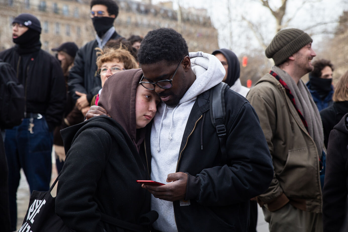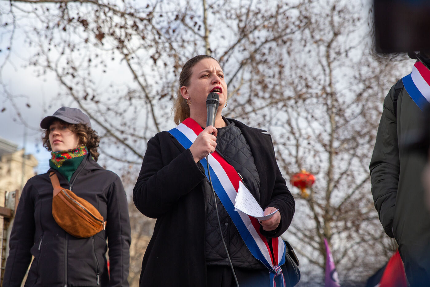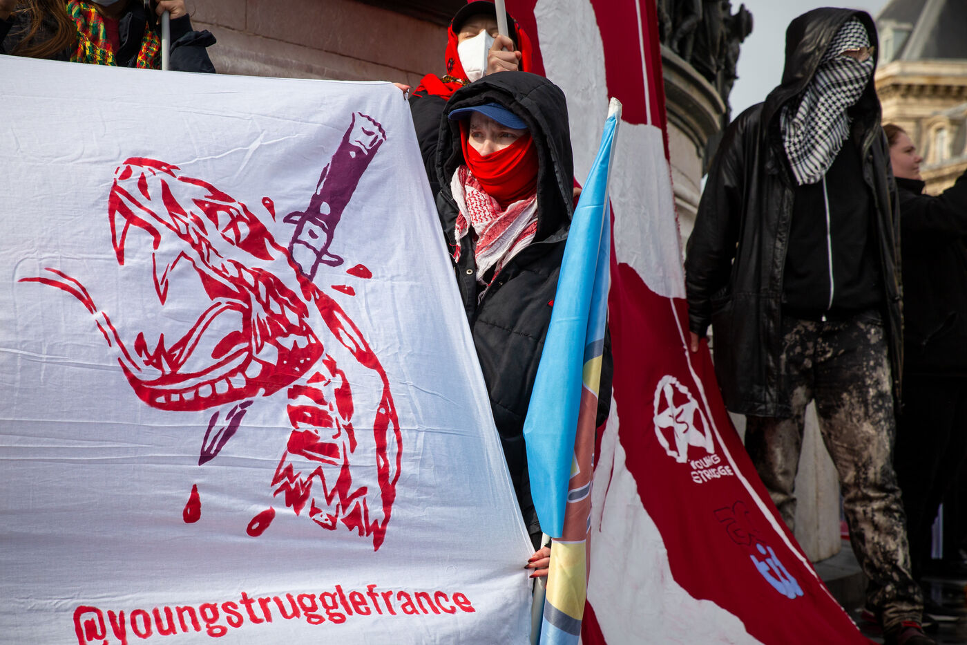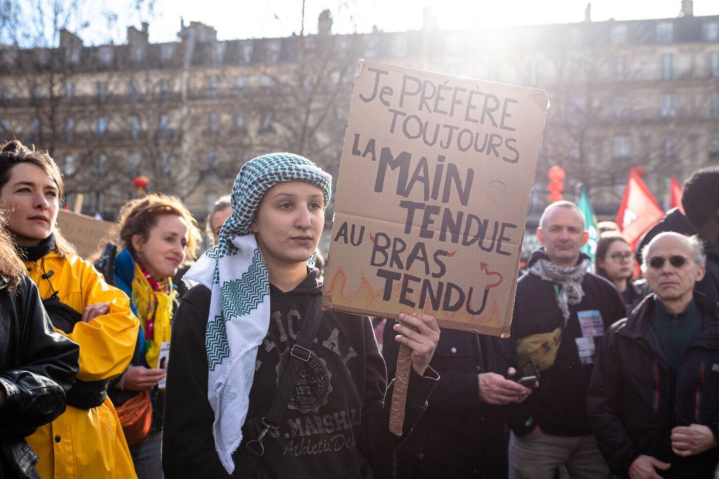 FRANCE, Paris, le 22 Fevrier 2025. Manifestation antifasciste a l appel de l Association Culturelle des Travailleurs Immigres de Turquie (ACTIT) et de Young Struggle, suite a une violente agression a l’arme blanche par des membres de l ultradroite. Militants antifascistes et sympathisants de gauche sont venus denoncer la brutalite de l extreme droite, le climat de violence et de xénophobie actuel. Ils ont voulu tenir la rue pour que les fascistes n y fassent pas leur loi.