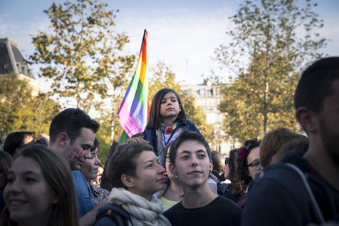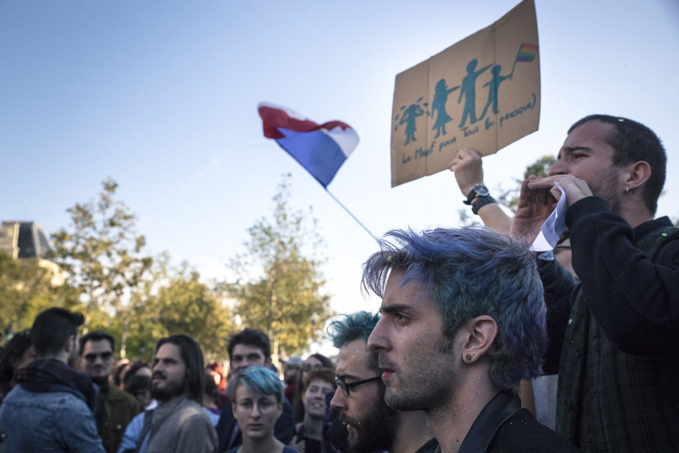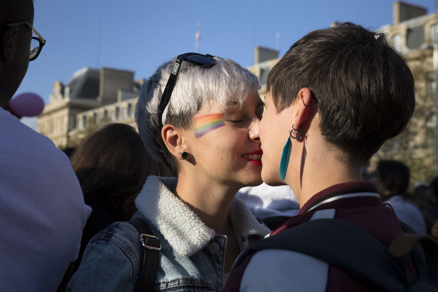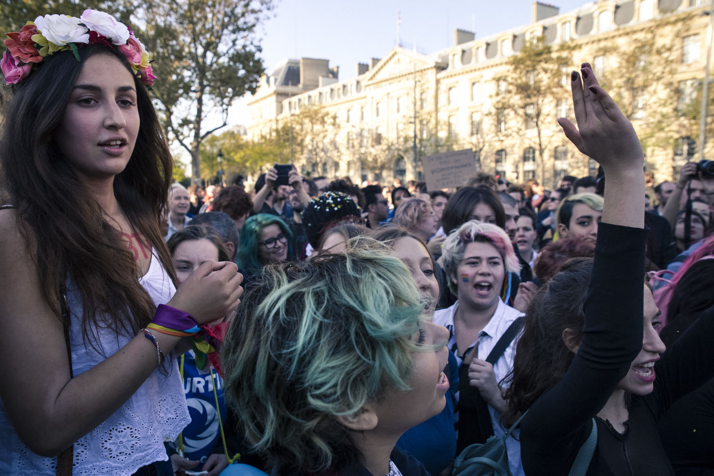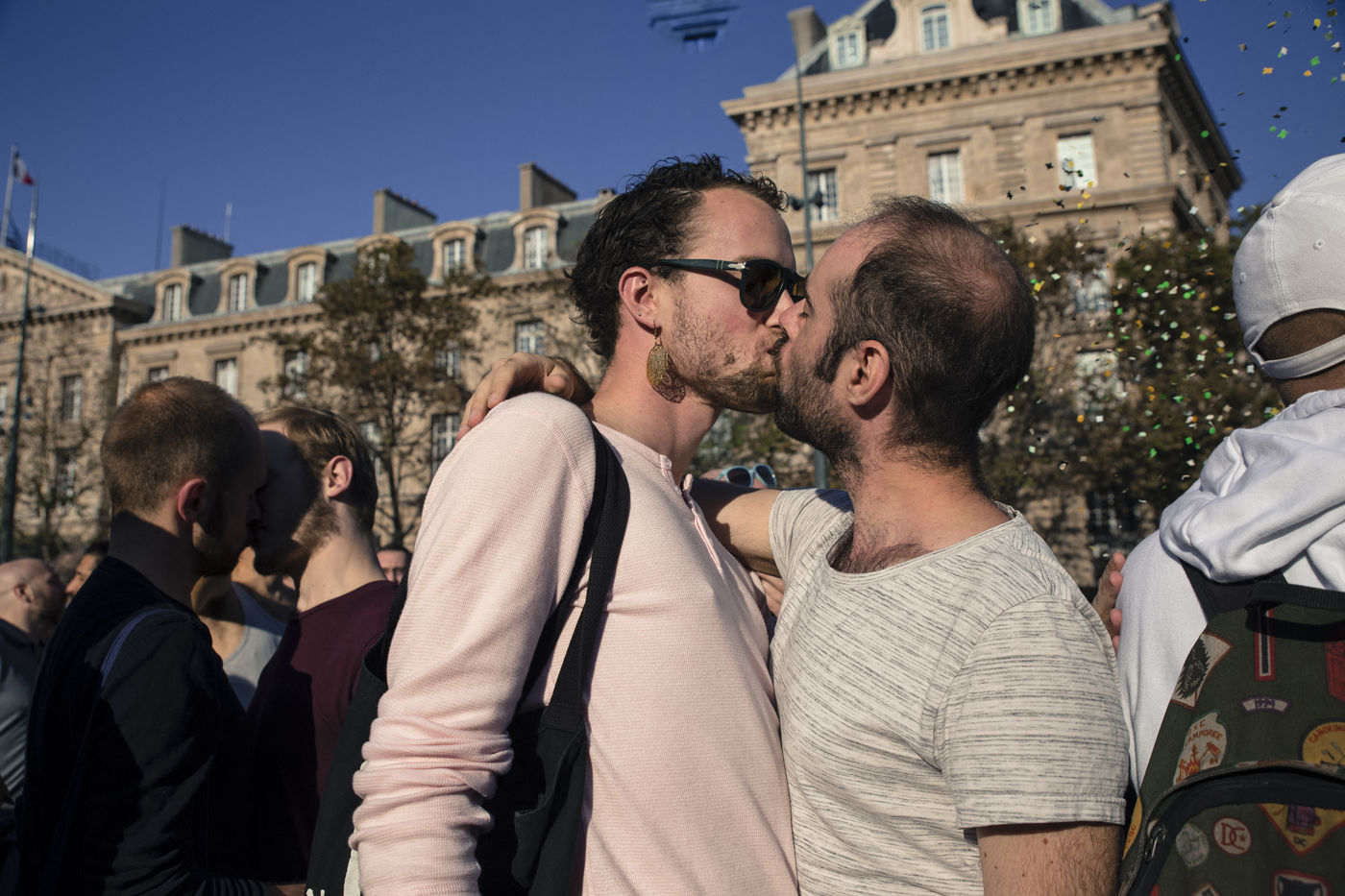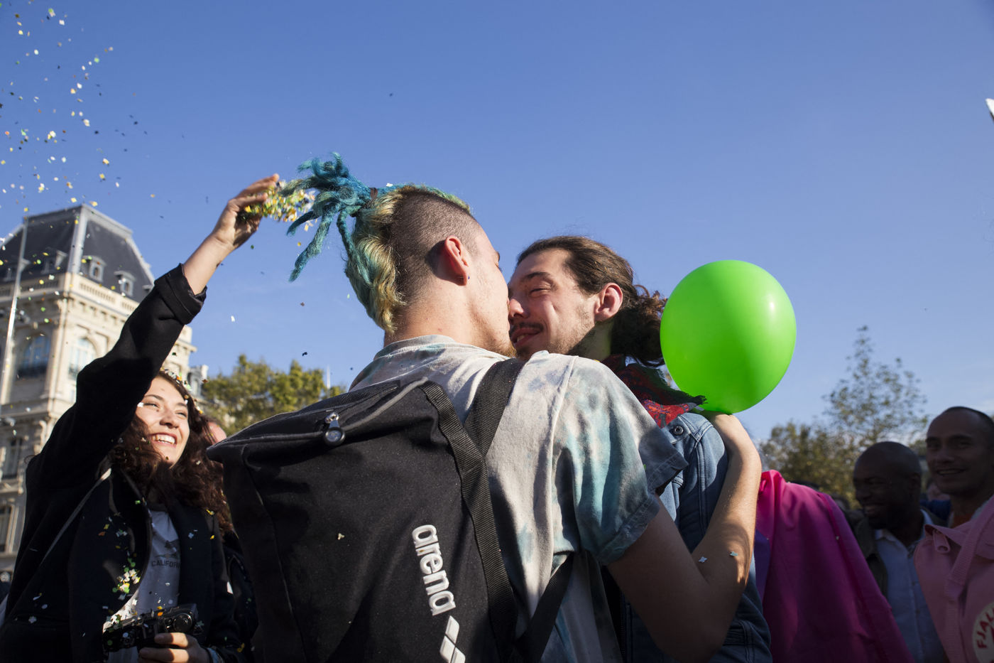 While the "manif pour tous" is taking place at the Trocadéro palace, a KissIN (people kissing each other in a public place) is happening at the same time Place de la République, in Paris, the 16th october 2016.