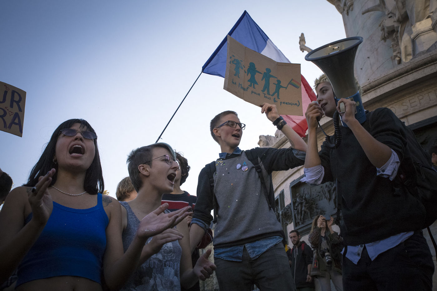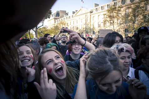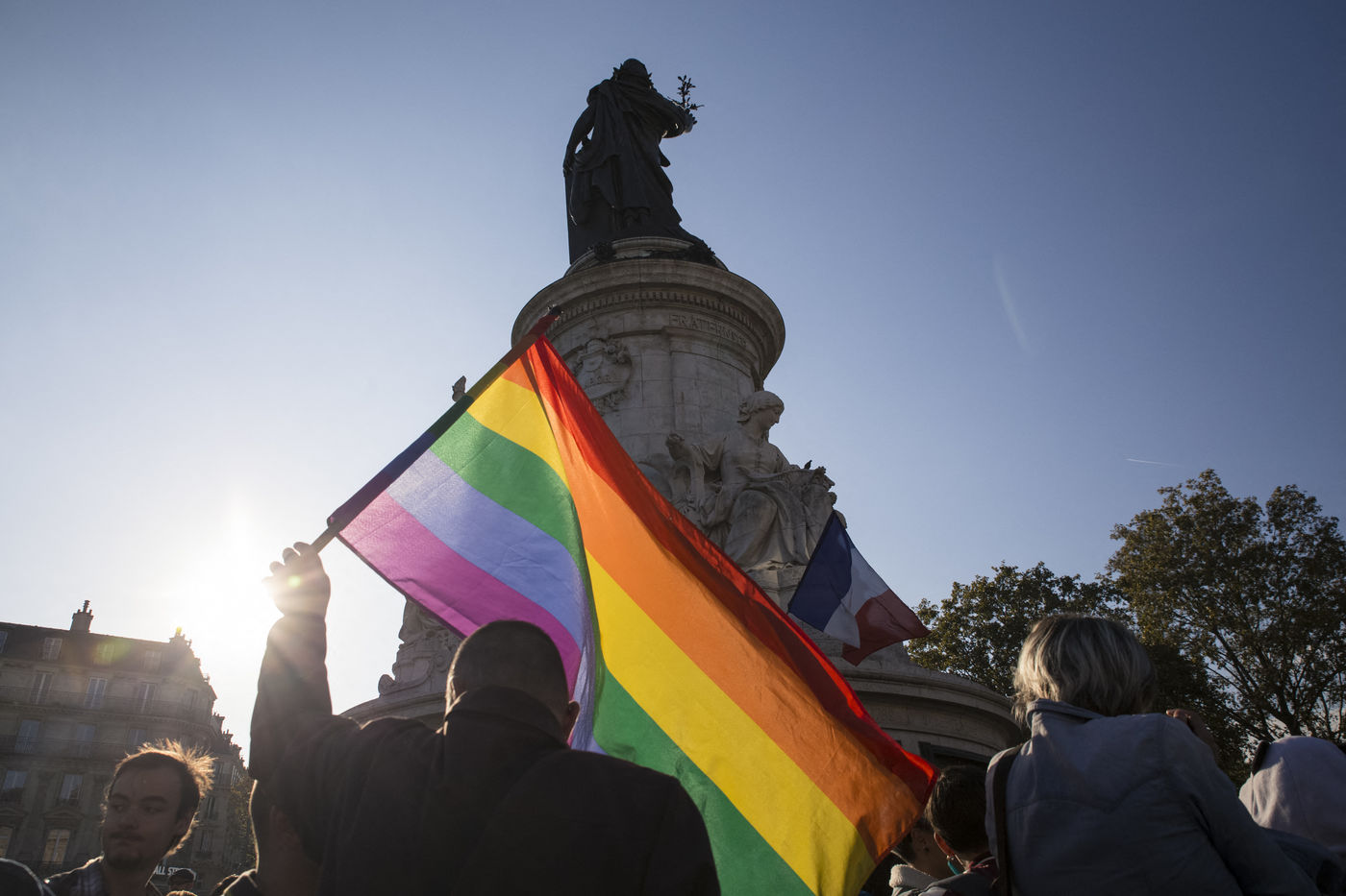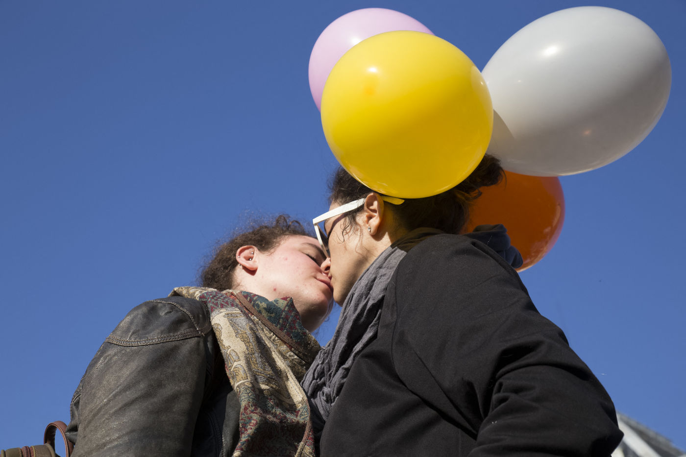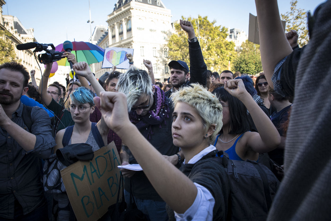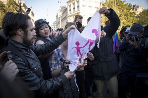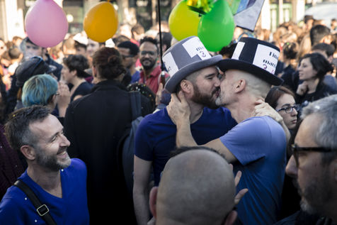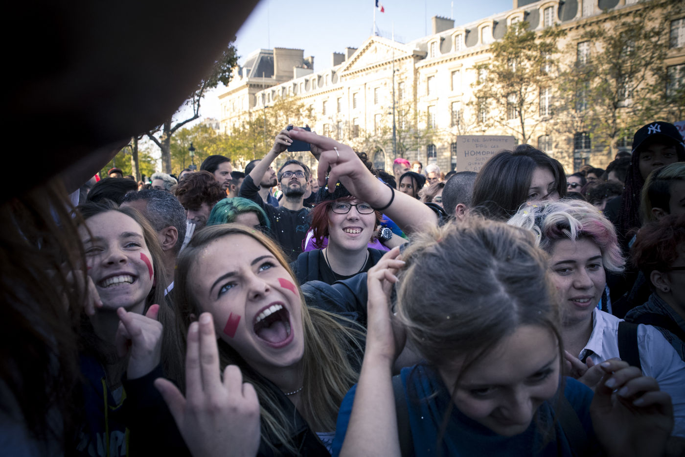 While the "manif pour tous" is taking place at the Trocadéro palace, a KissIN (people kissing each other in a public place) is happening at the same time Place de la République, in Paris, the 16th october 2016.