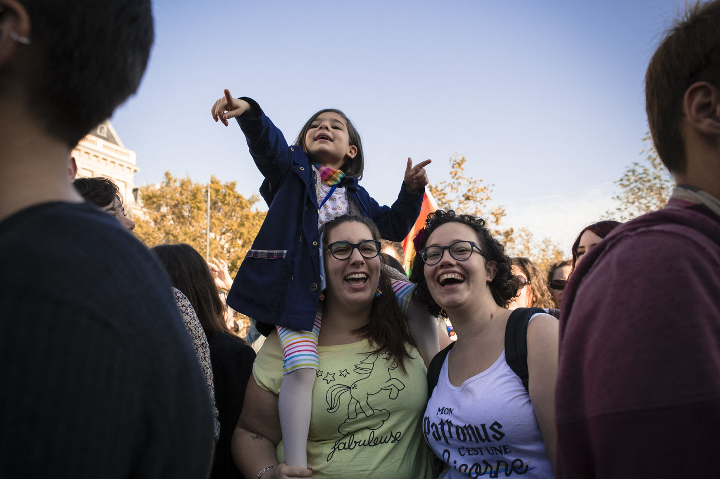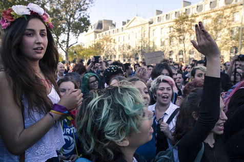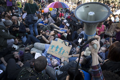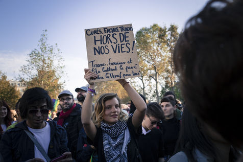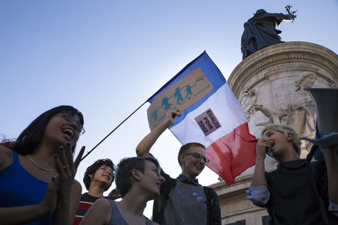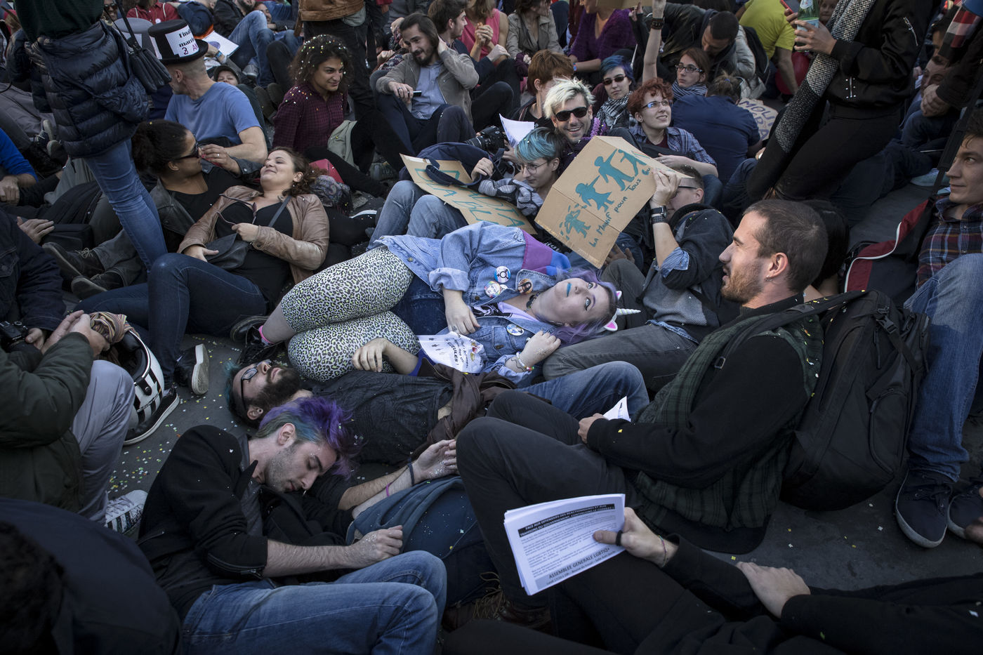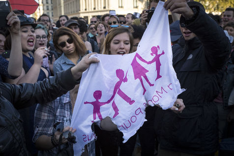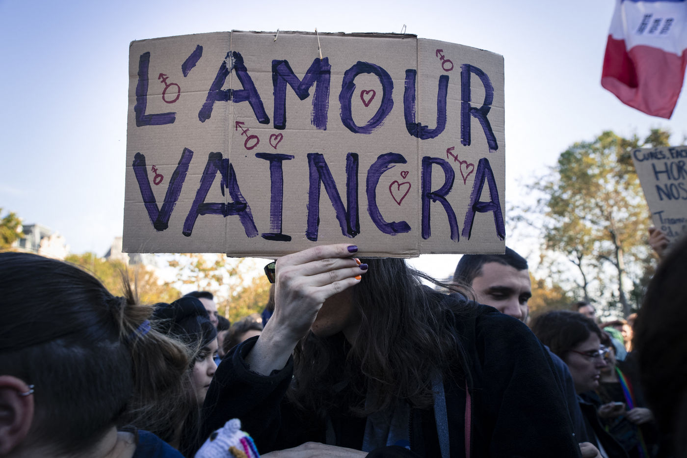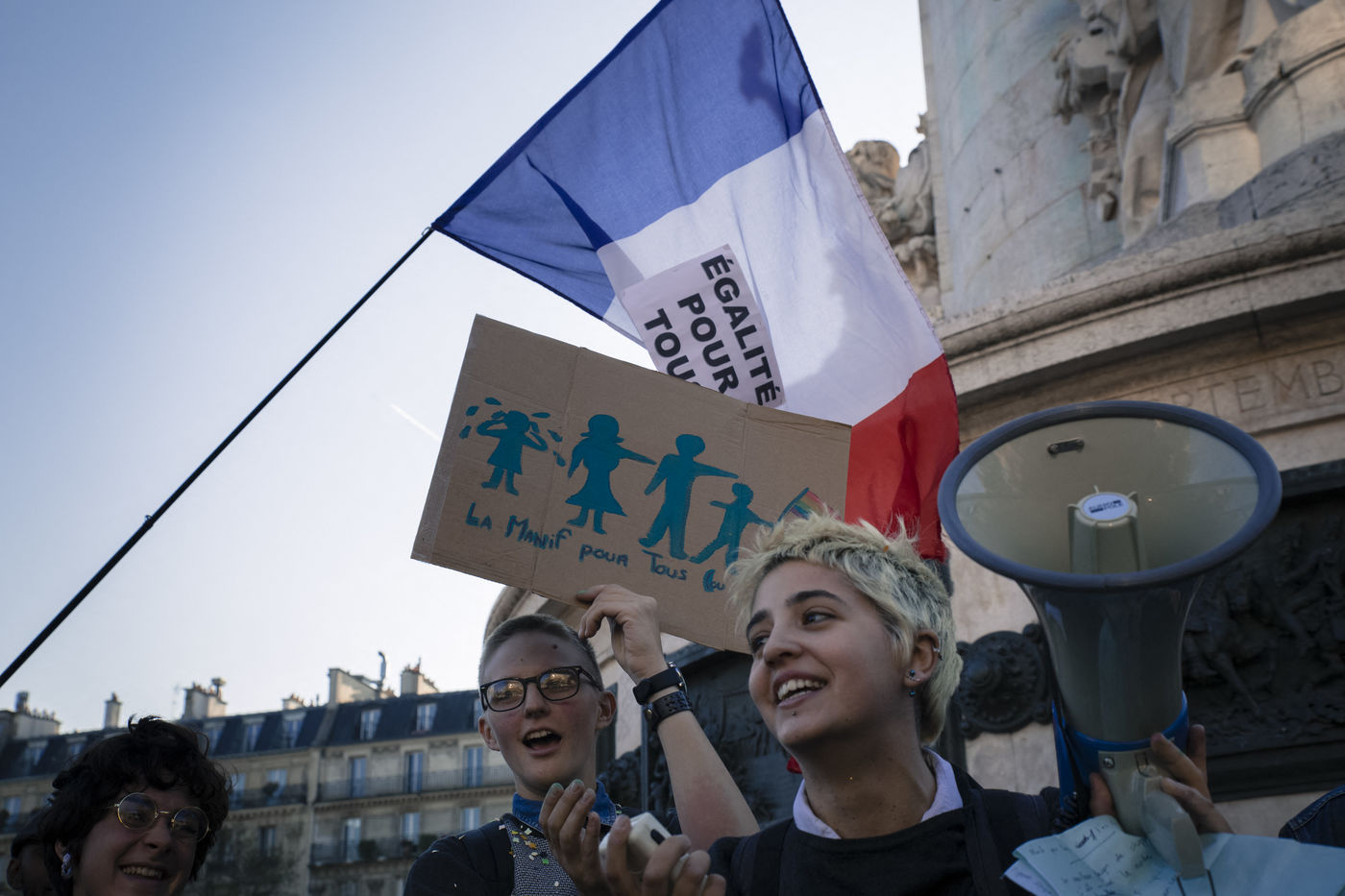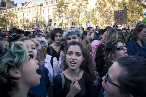 While the "manif pour tous" is taking place at the Trocadéro palace, a KissIN (people kissing each other in a public place) is happening at the same time Place de la République, in Paris, the 16th october 2016.