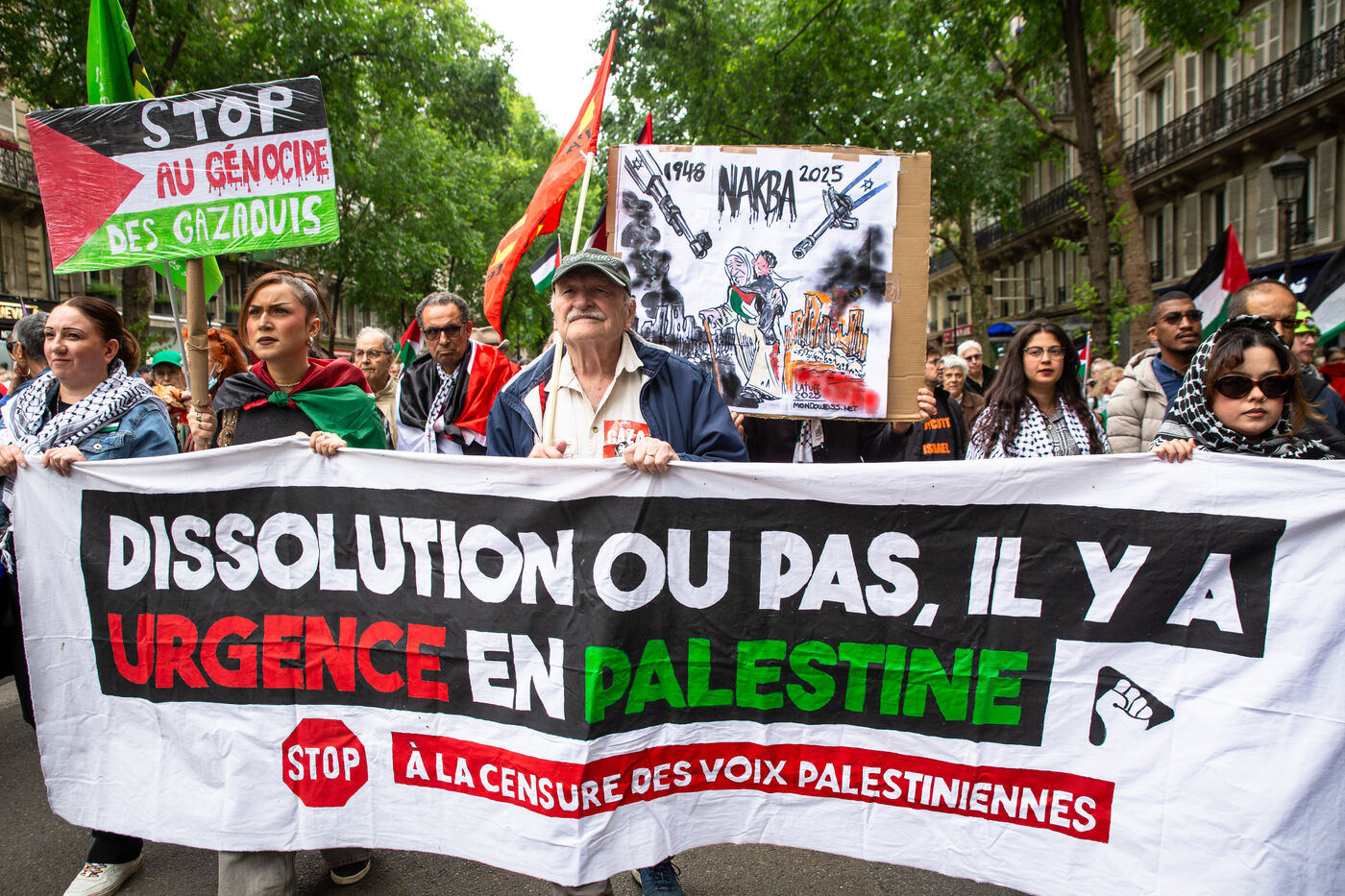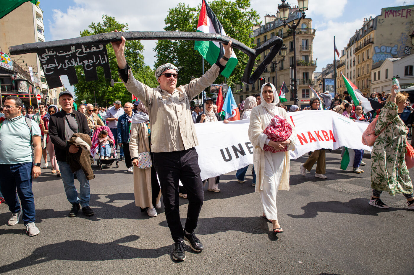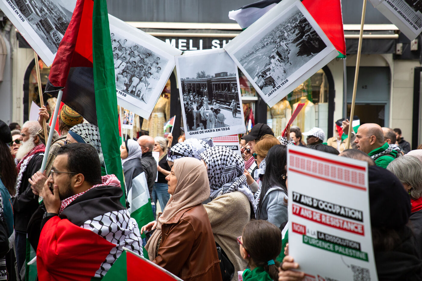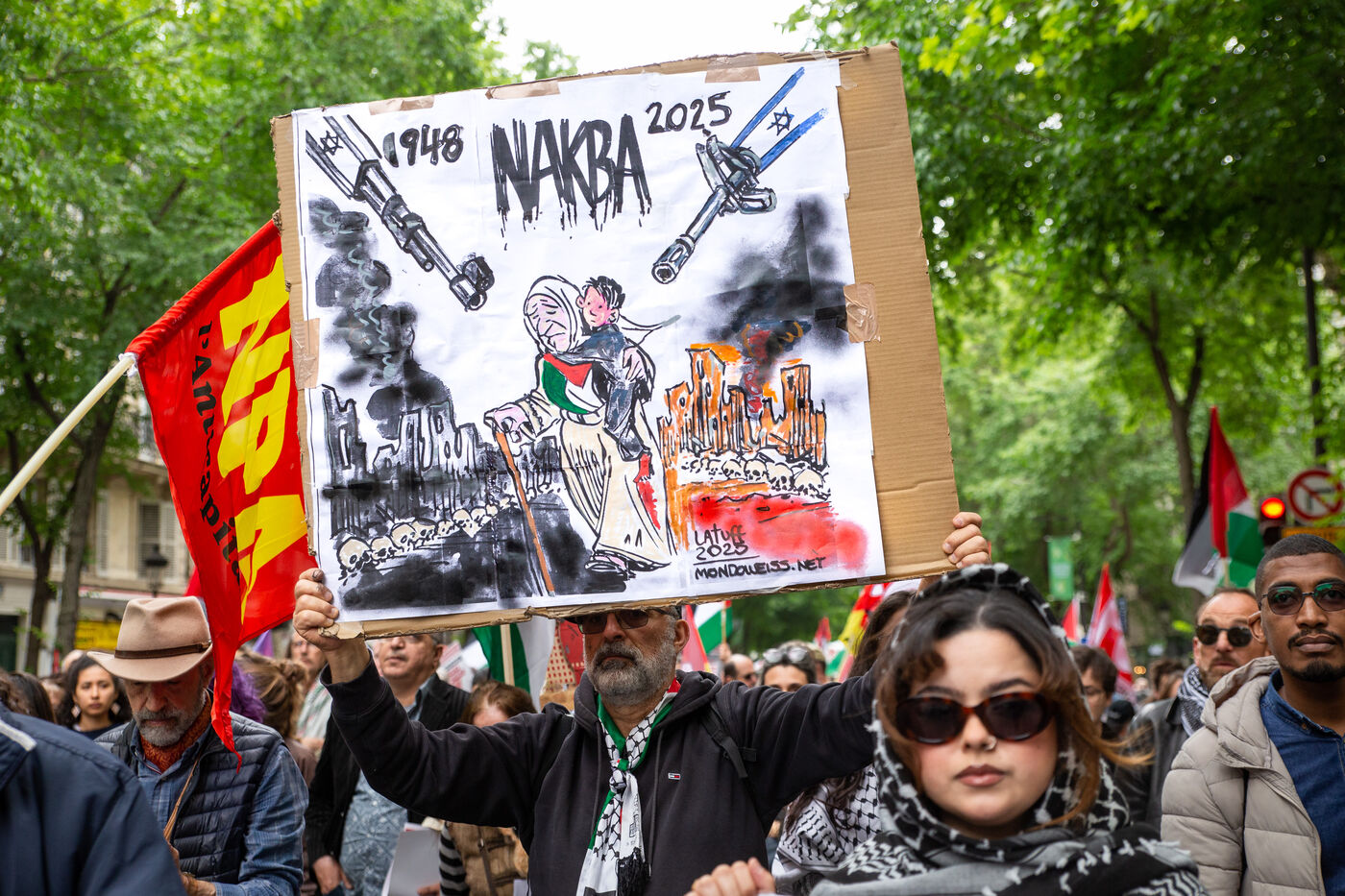 FRANCE, Paris, May 17, 2025. Demonstration in support of the Palestinian people and commemoration of the Nakba, which means “catastrophe” and refers to the Palestinian exodus following the creation of the State of Israel and the defeat of the Arab countries in the first Arab-Israeli war in 1948. A duty to remember for pro-Palestinian activists, it aims to keep Palestine in the public debate and influence diplomatic decisions, notably for the recognition of the Palestinian state.