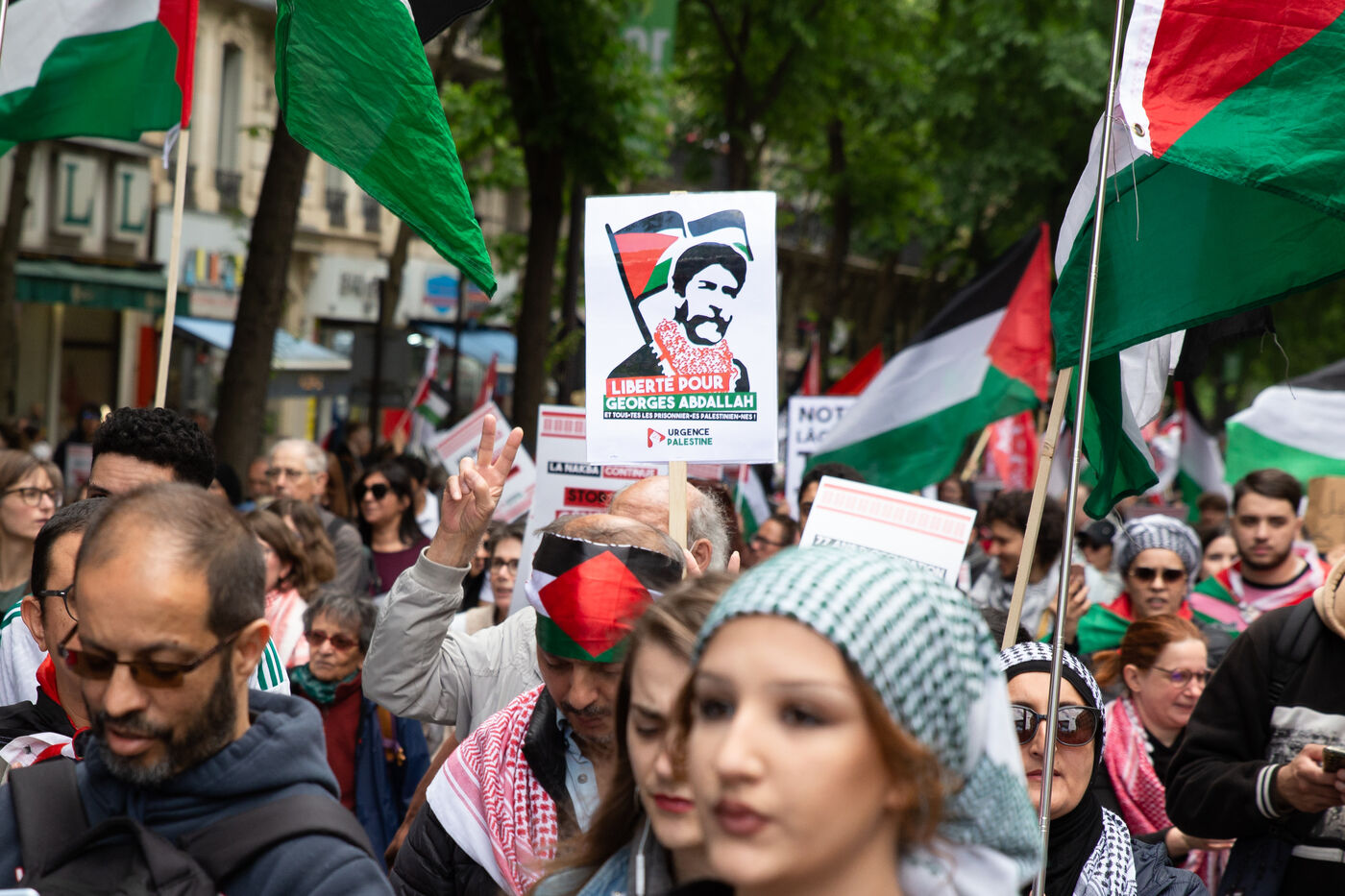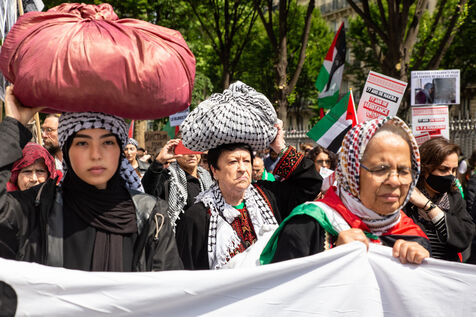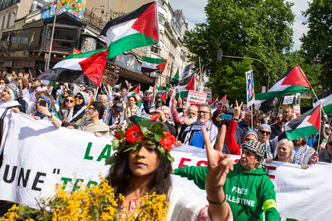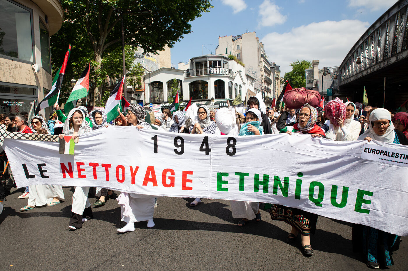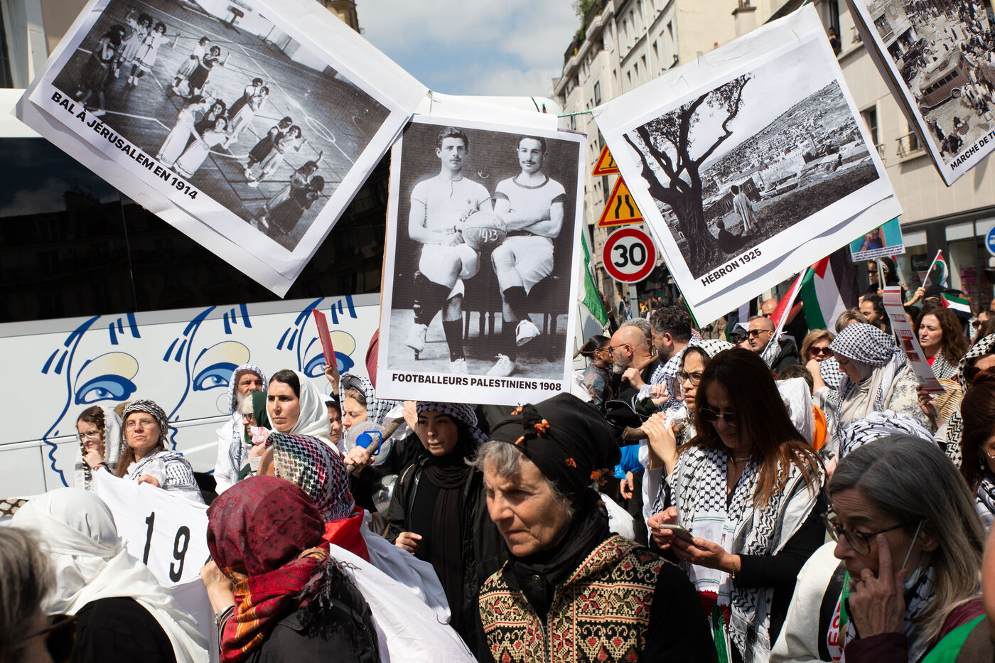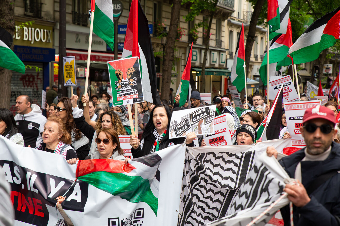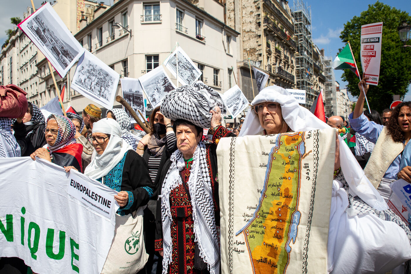 FRANCE, Paris, May 17, 2025. Demonstration in support of the Palestinian people and commemoration of the Nakba, which means “catastrophe” and refers to the Palestinian exodus following the creation of the State of Israel and the defeat of the Arab countries in the first Arab-Israeli war in 1948. A duty to remember for pro-Palestinian activists, it aims to keep Palestine in the public debate and influence diplomatic decisions, notably for the recognition of the Palestinian state.