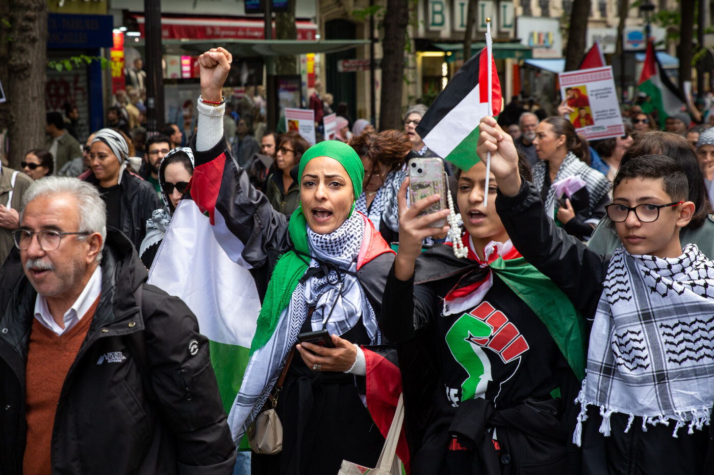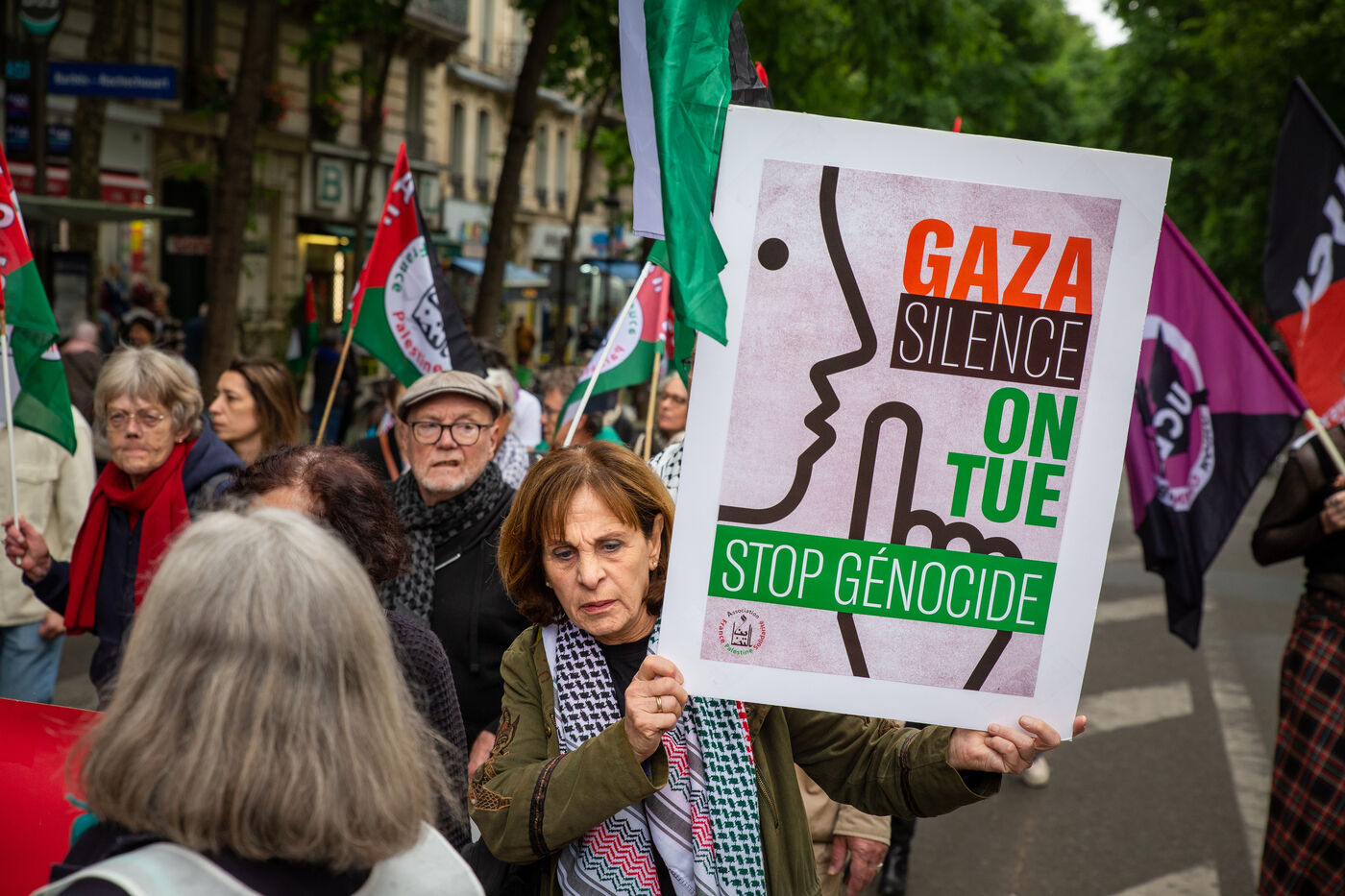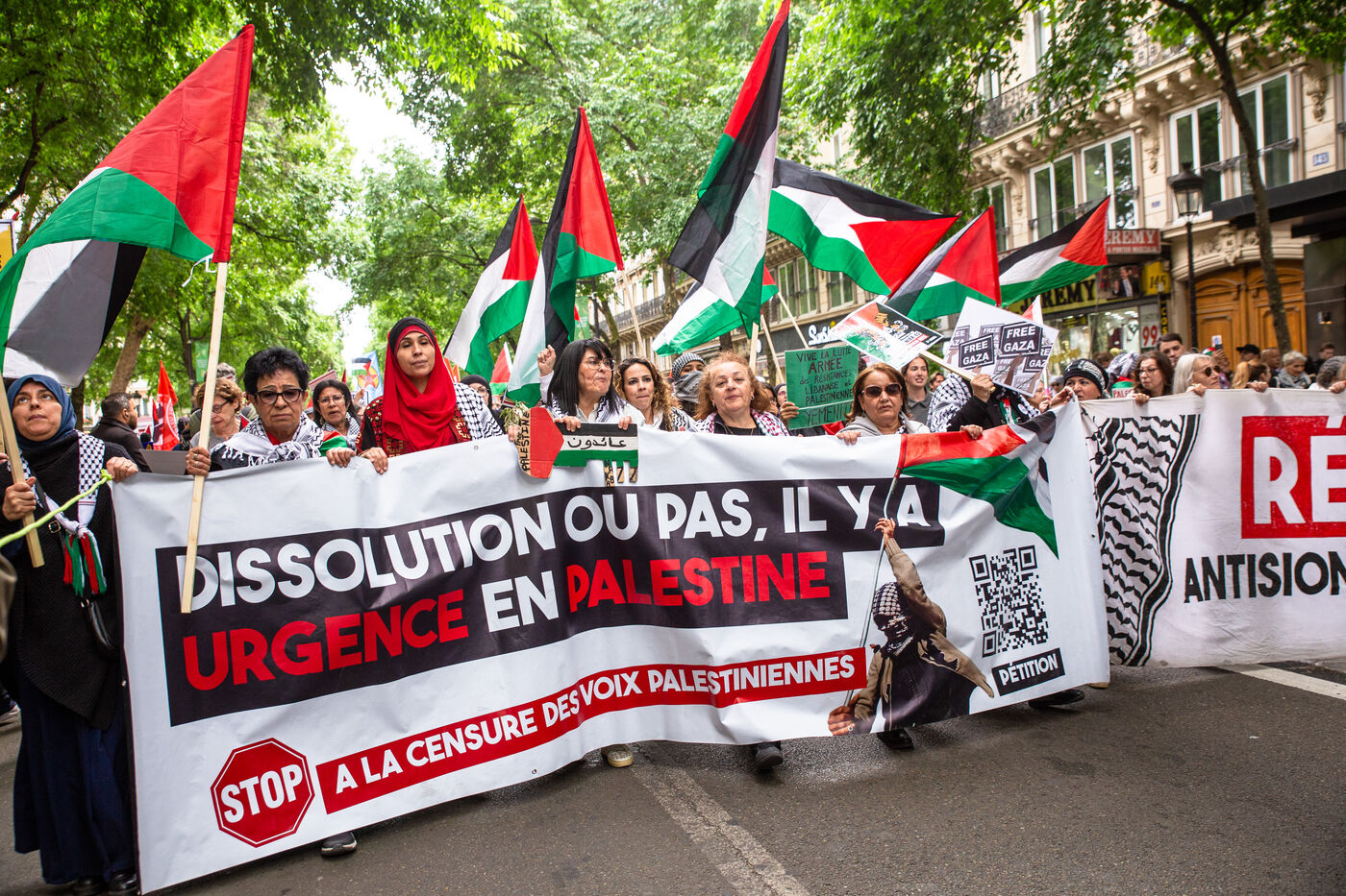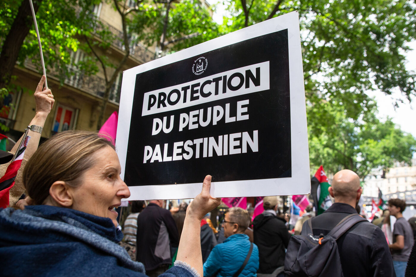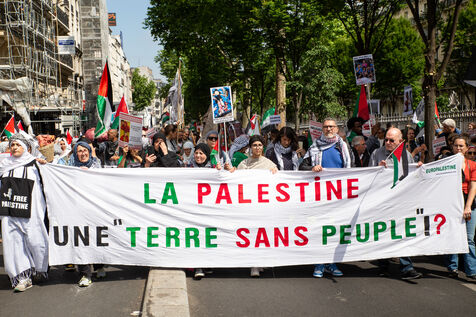 FRANCE, Paris, May 17, 2025. Demonstration in support of the Palestinian people and commemoration of the Nakba, which means “catastrophe” and refers to the Palestinian exodus following the creation of the State of Israel and the defeat of the Arab countries in the first Arab-Israeli war in 1948. A duty to remember for pro-Palestinian activists, it aims to keep Palestine in the public debate and influence diplomatic decisions, notably for the recognition of the Palestinian state.