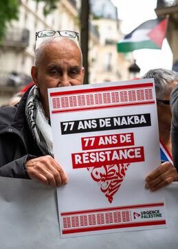 FRANCE, Paris, le 17 Mai 2025. Manifestation de soutien au peuple palestinien et commemoration de la Nakba, qui signifie « catastrophe » et designe l exode palestinien suite a la creation de l’Etat d’Israel et a la defaite des pays arabes lors de la premiere guerre israelo-arabe en 1948. Devoir de memoire pour les militants pro-palestiniens, qui vise à maintenir la Palestine dans le debat public et à peser sur les décisions diplomatiques, notamment pour la reconnaissance de l'État palestinien.