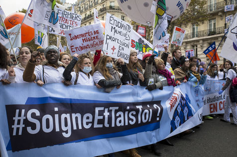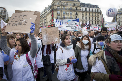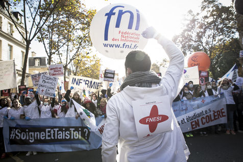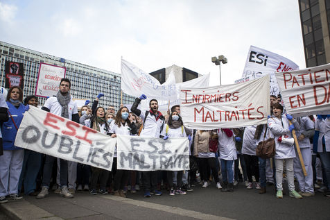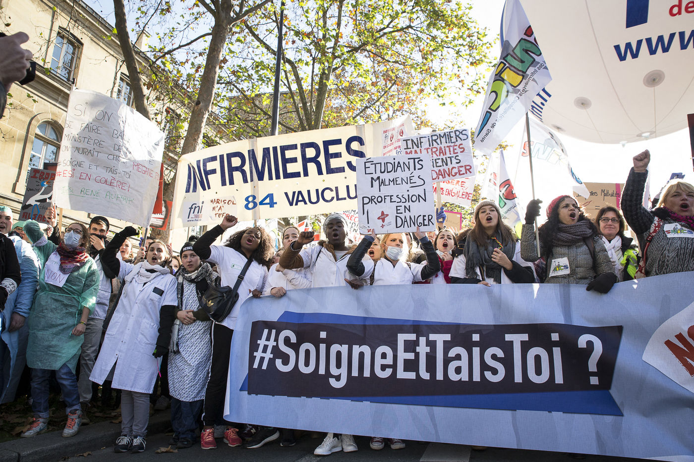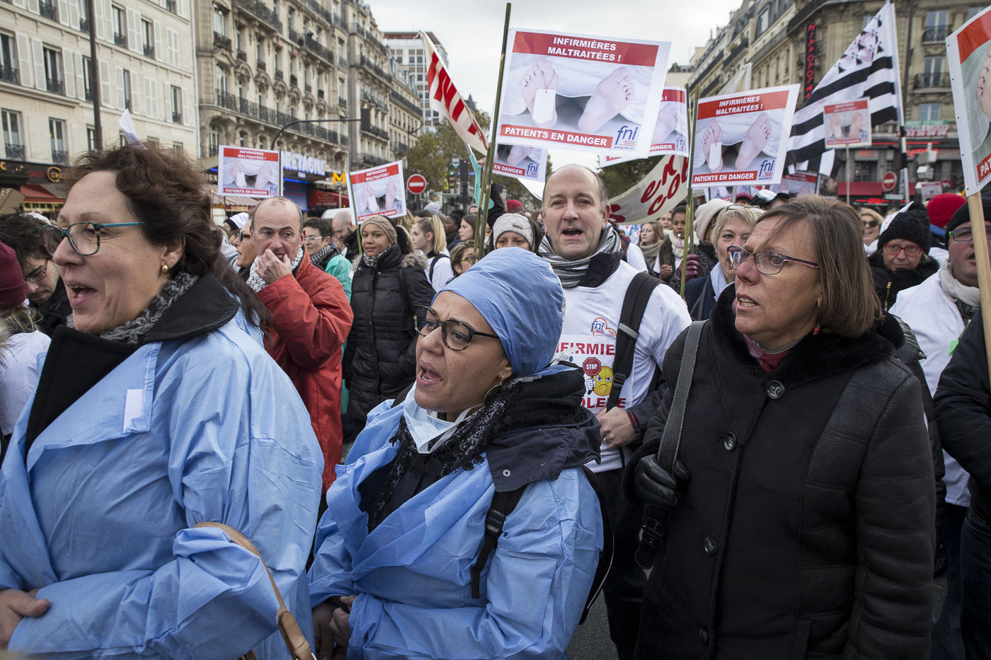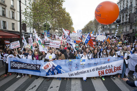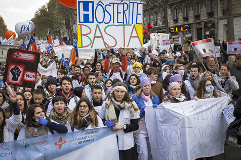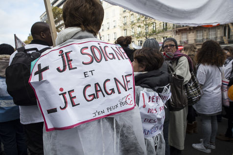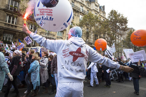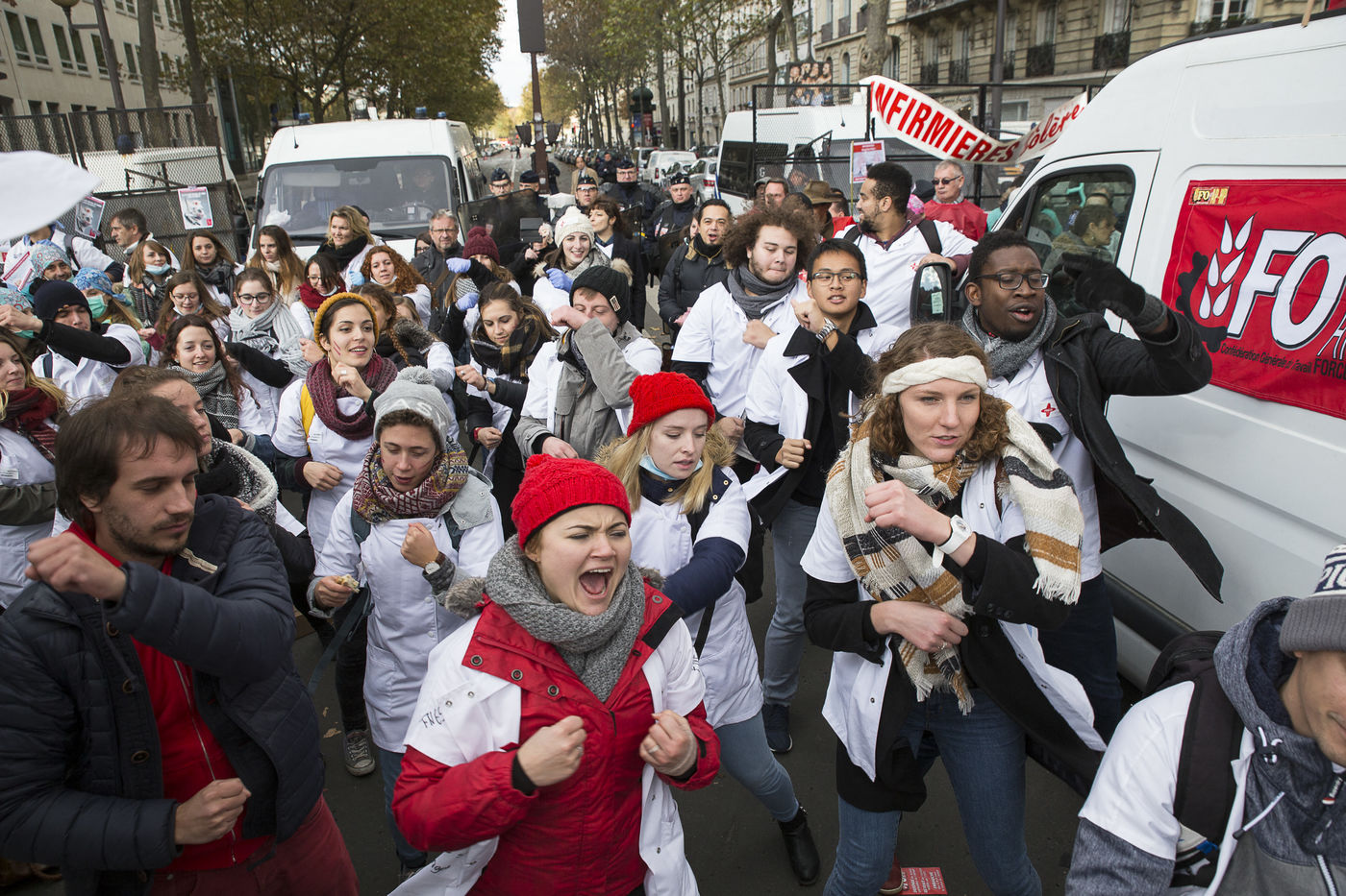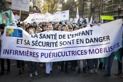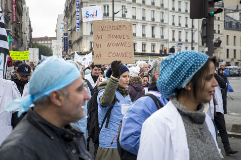 FRANCE, Paris. Nurses and Hospital staff demonstrate against the "deterioration of their working conditions" as part of a nation wide protest day on November 8, 2016.