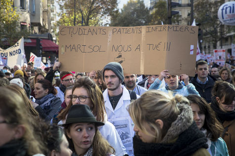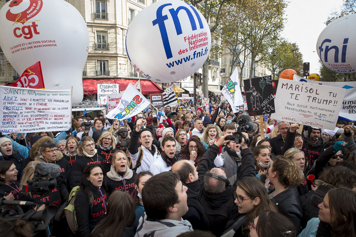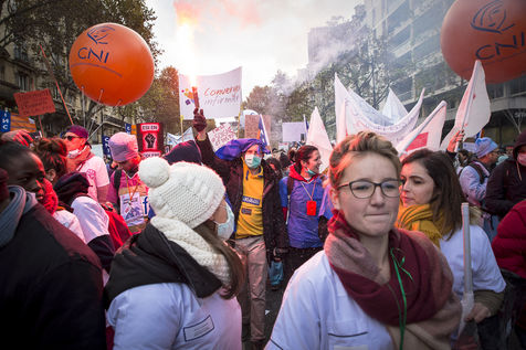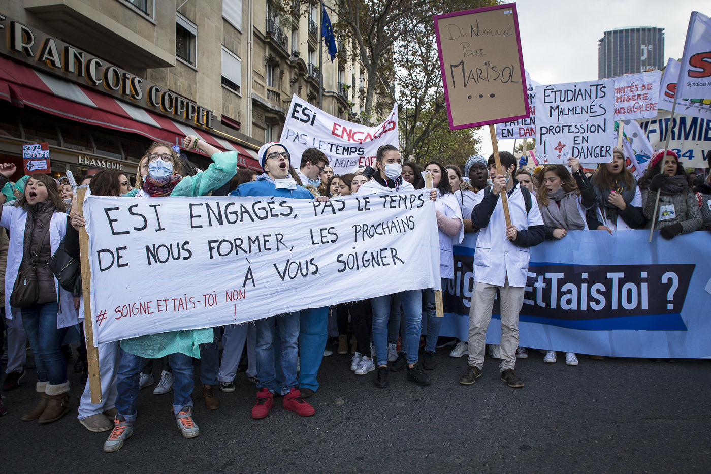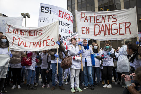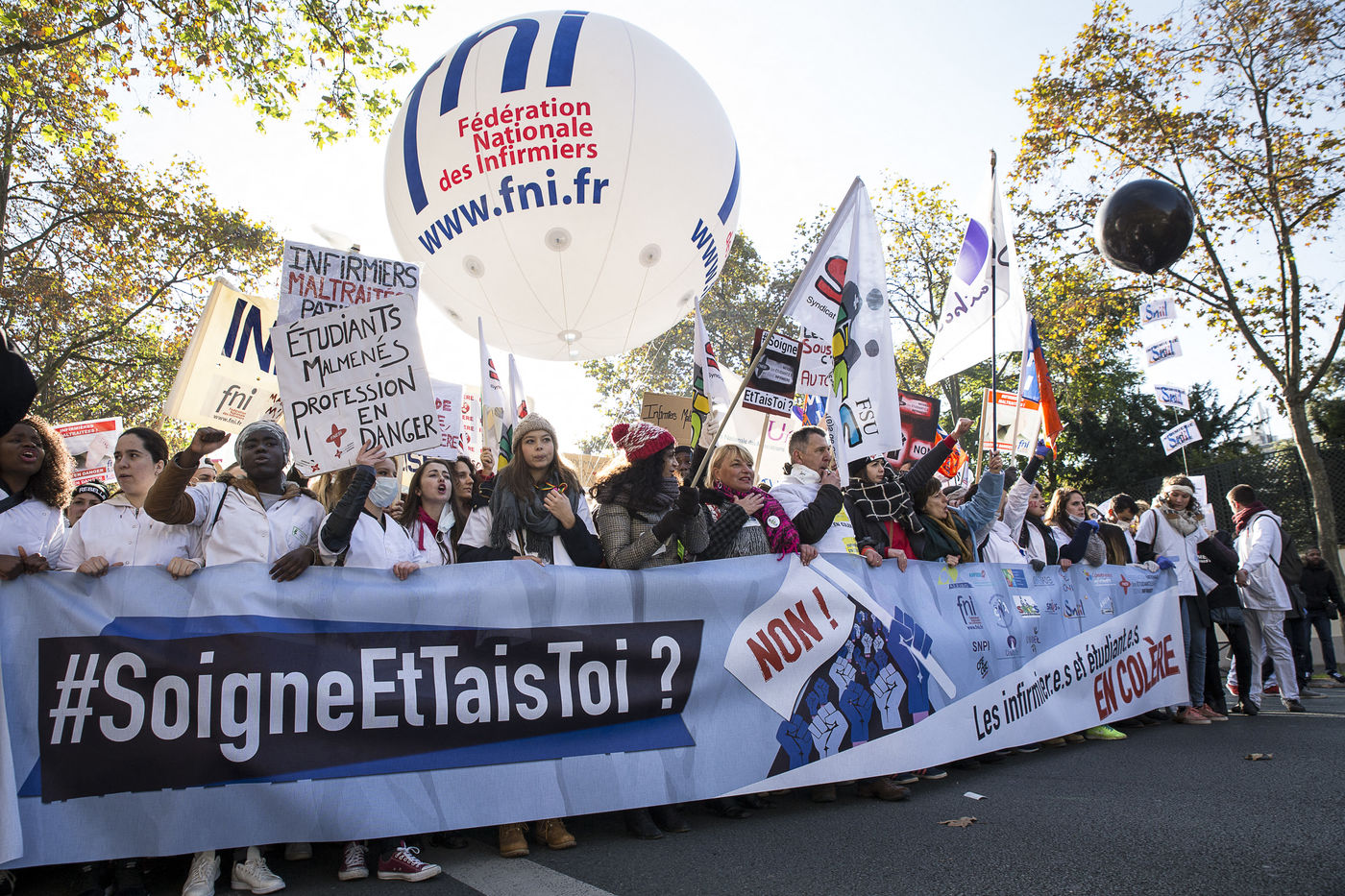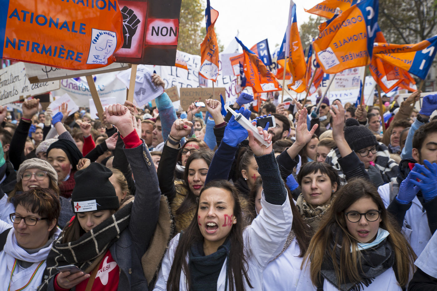 FRANCE, Paris. Nurses and Hospital staff demonstrate against the "deterioration of their working conditions" as part of a nation wide protest day on November 8, 2016.