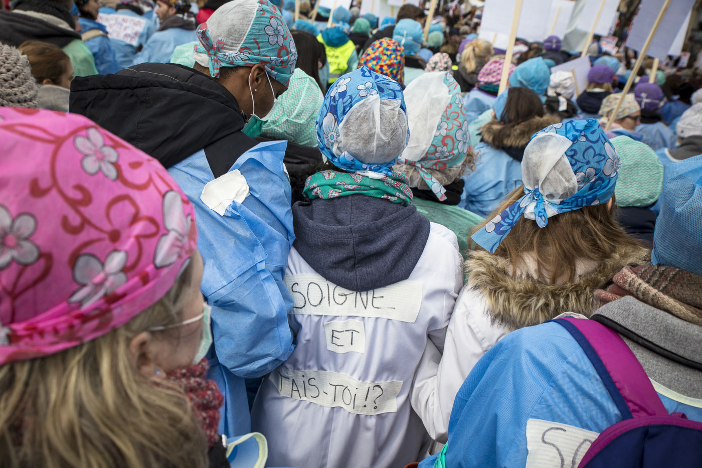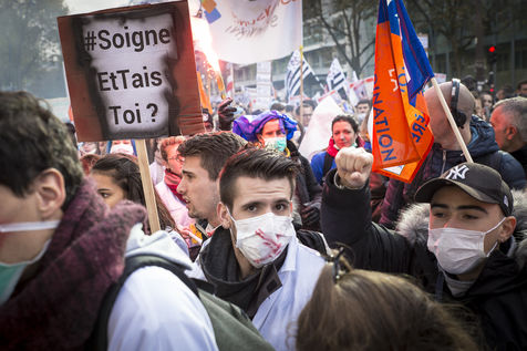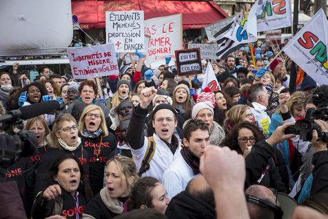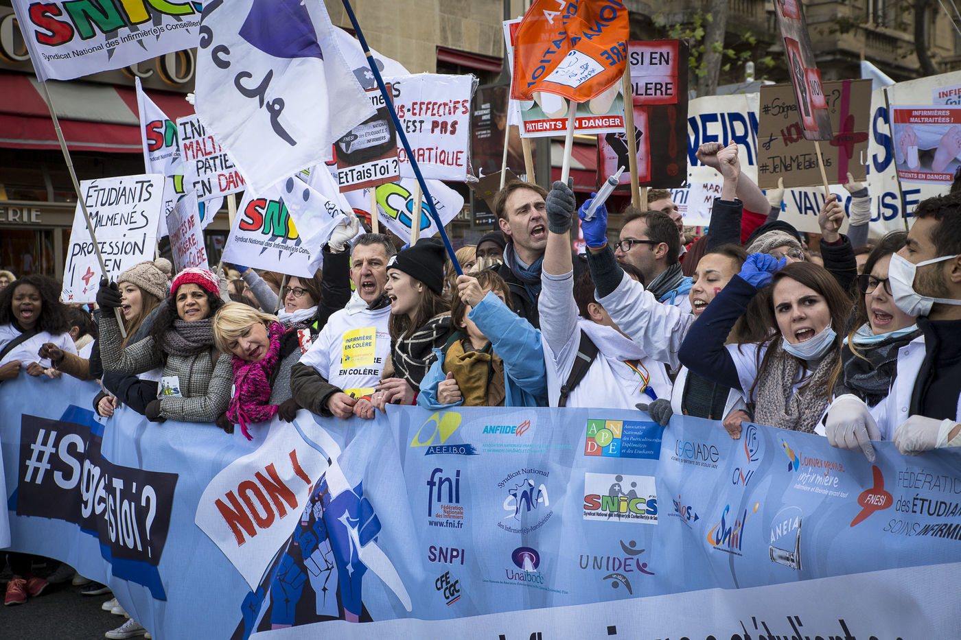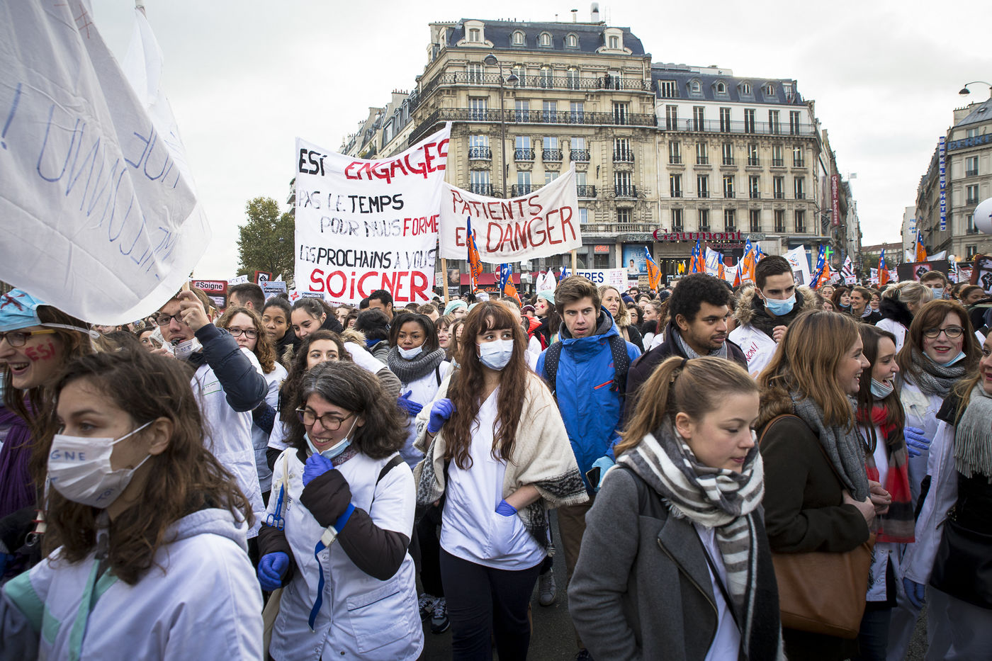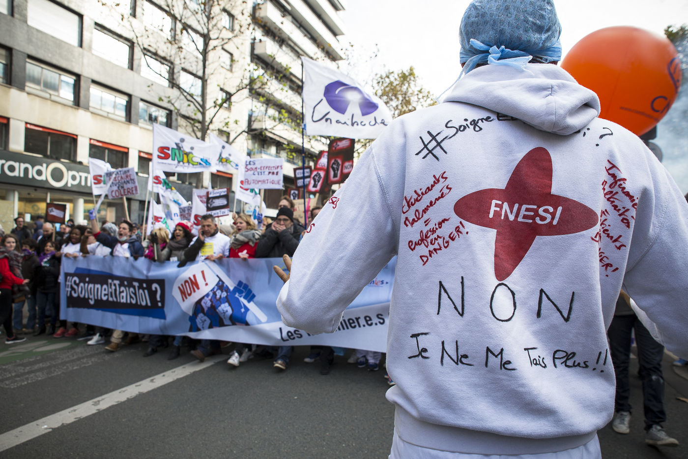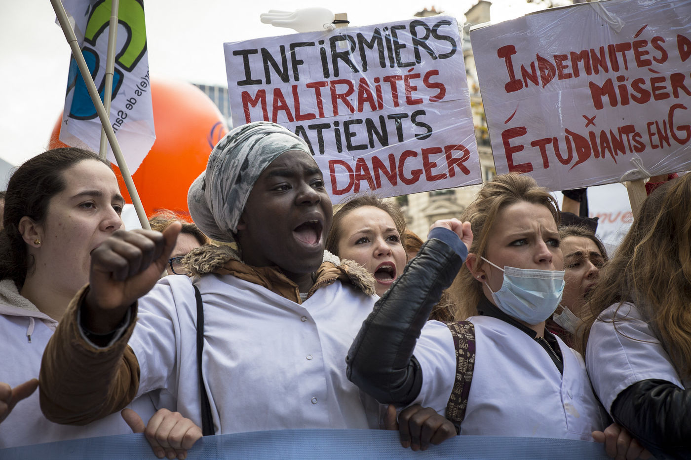 FRANCE, Paris. Nurses and Hospital staff demonstrate against the "deterioration of their working conditions" as part of a nation wide protest day on November 8, 2016.