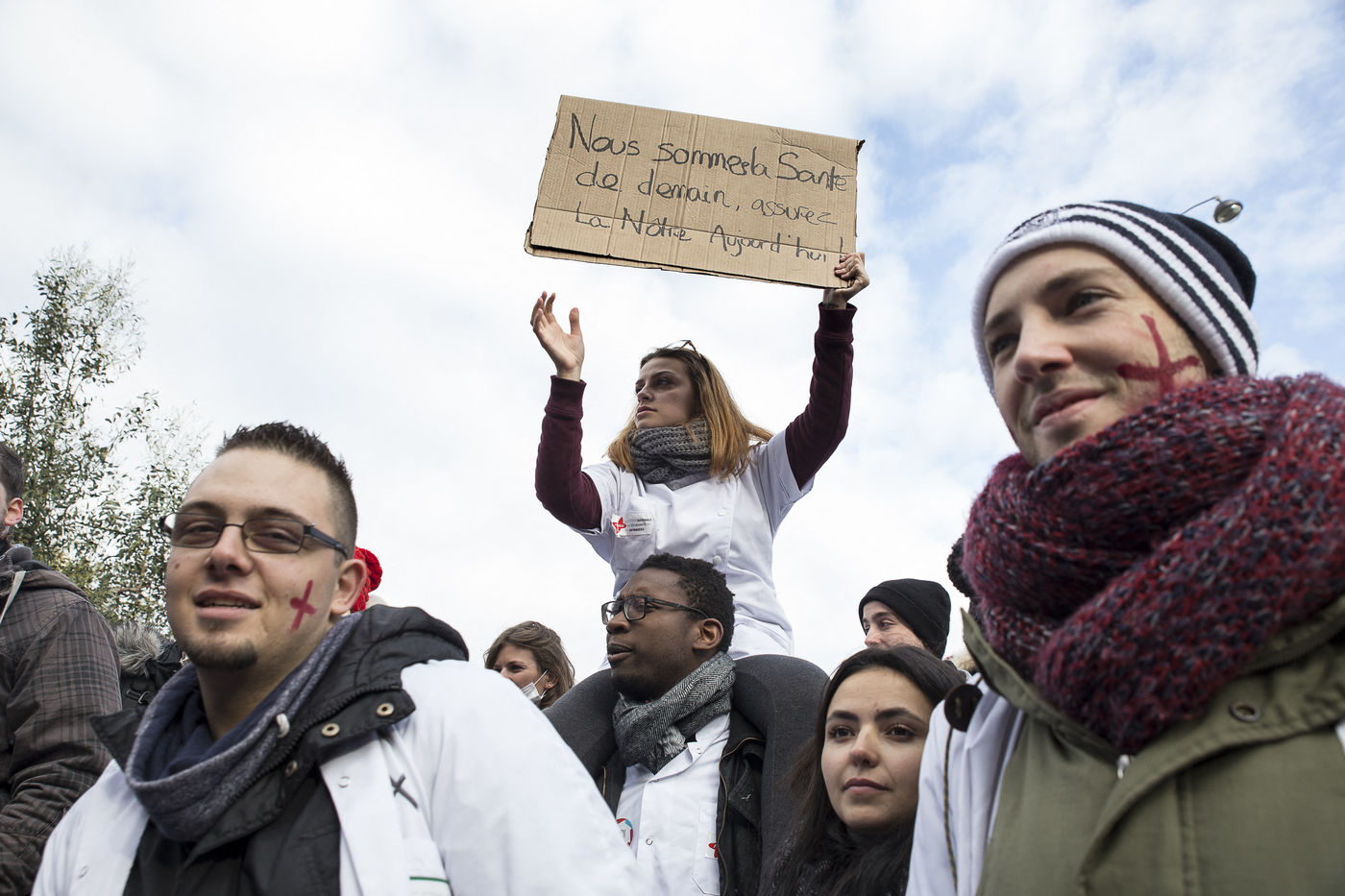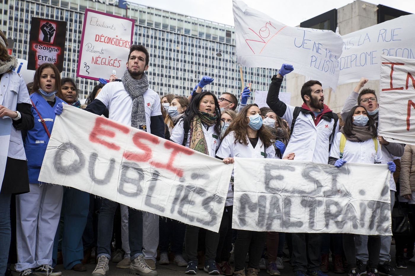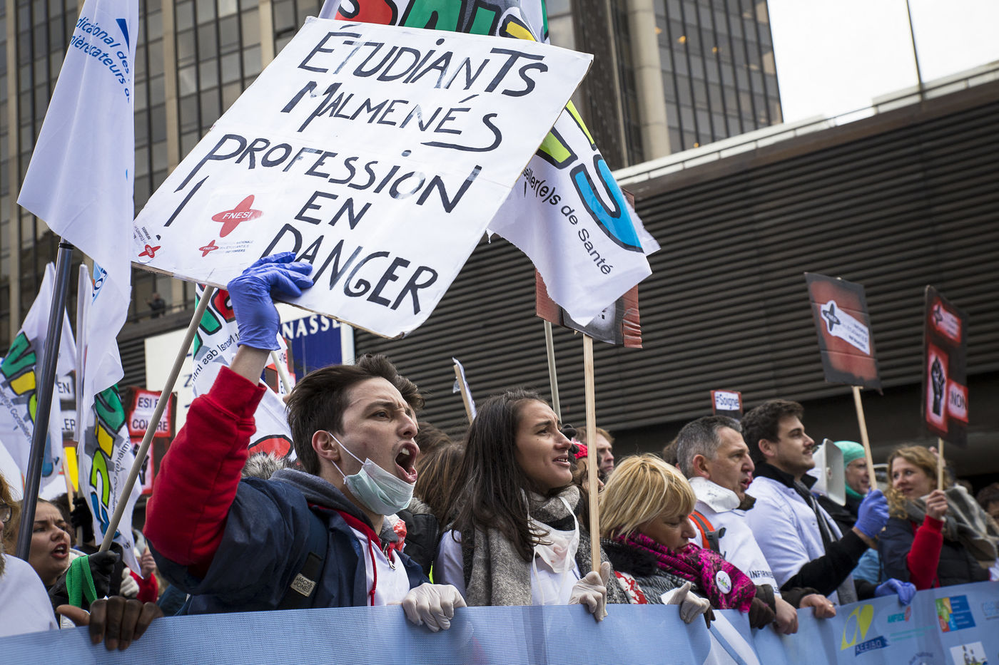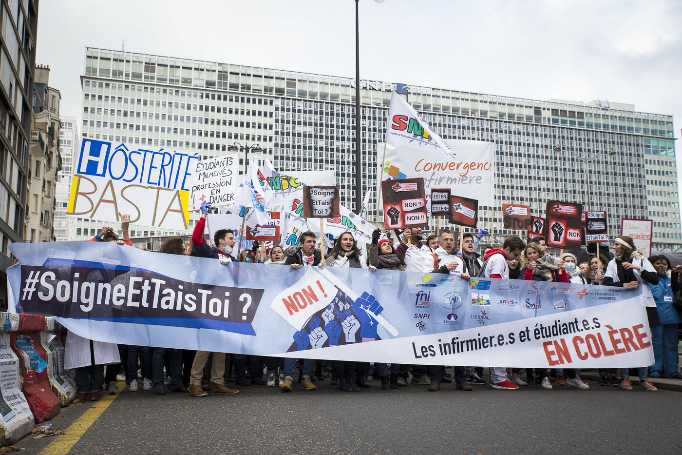 Paris, FRANCE. Le 08 Novembre 2016. Journée de mobilisation nationale du secteur santé. Les personnels hospitaliers et la filière infirmière (étudiants et professionnels) ont unis leurs revendications et manifesté de la gare Montparnasse jusqu'au Ministère de la Santé. Hostiles à la loi HPST (Hôpital, Patient, Santé, Territoire), et à loi Santé de Marisol Touraine, ils déplorent la déstructuration du système hospitalier français, le manque de moyens et la dégradation de leurs conditions de travail.