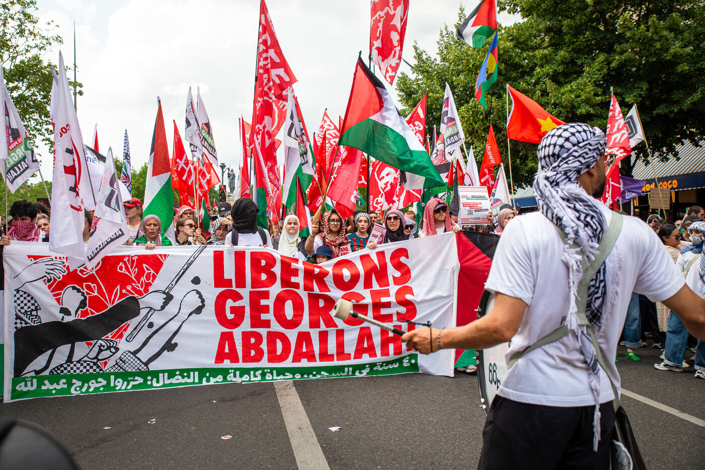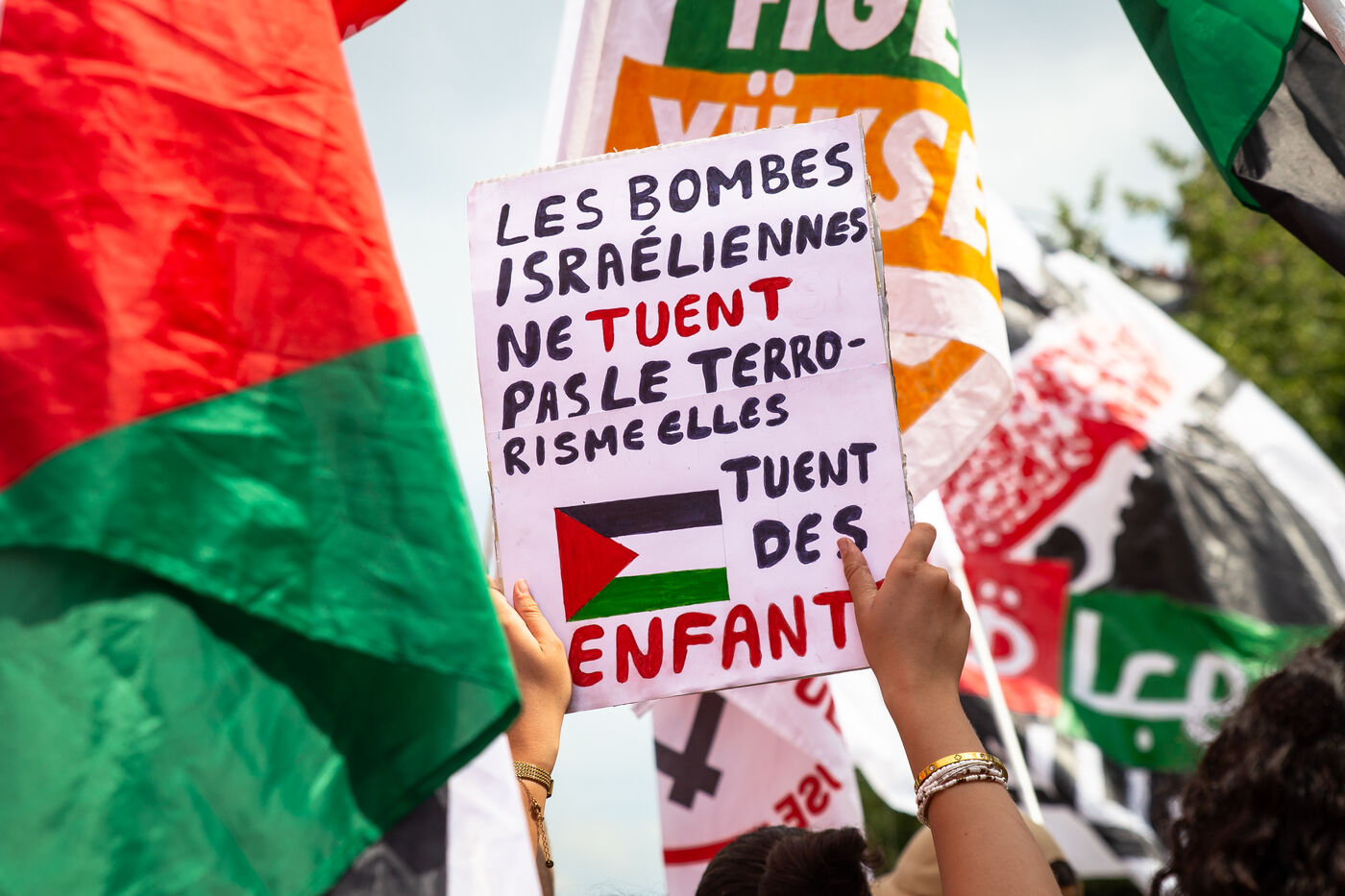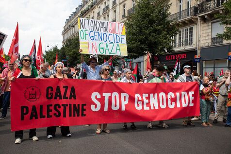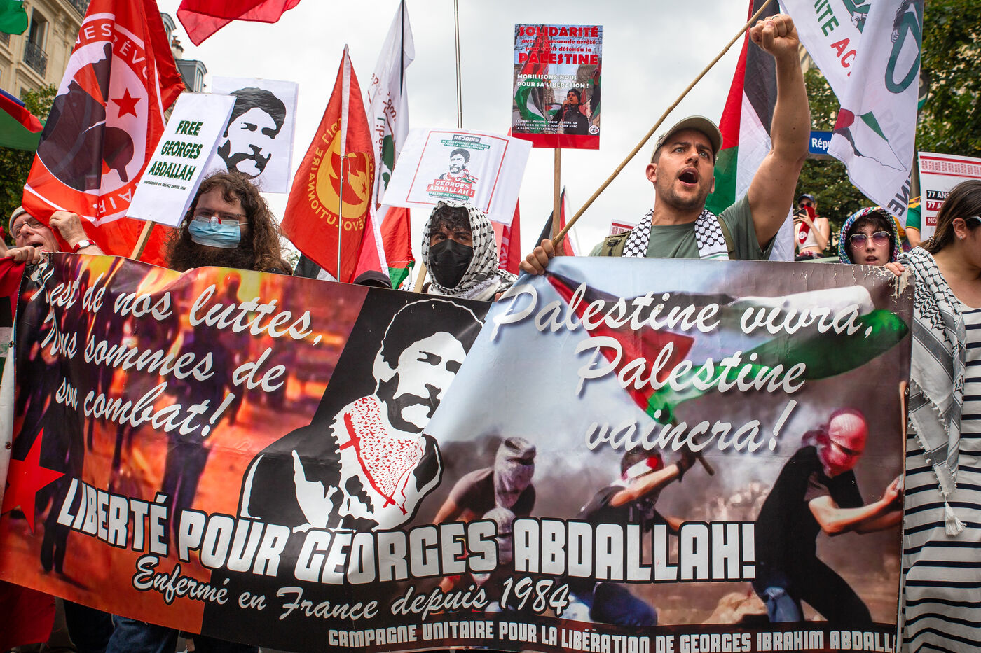 France, Paris, June 14, 2025. Mobilization for Palestine at the call of an inter-union coalition bringing together CFDT, CGT, Unsa, Solidaires, and FSU, the National Collective for a Just and Lasting Peace between Palestinians and Israelis (CNPJDPI), and left-wing parties (LFI, PS, PCF, EELV). Denouncing the abuses committed in Gaza (bombing of civilians, forced displacement, starvation as a weapon of war), and pointing to the genocidal intentions of the Israeli government, the organizers are calling for an immediate ceasefire and unhindered access for humanitarian aid.