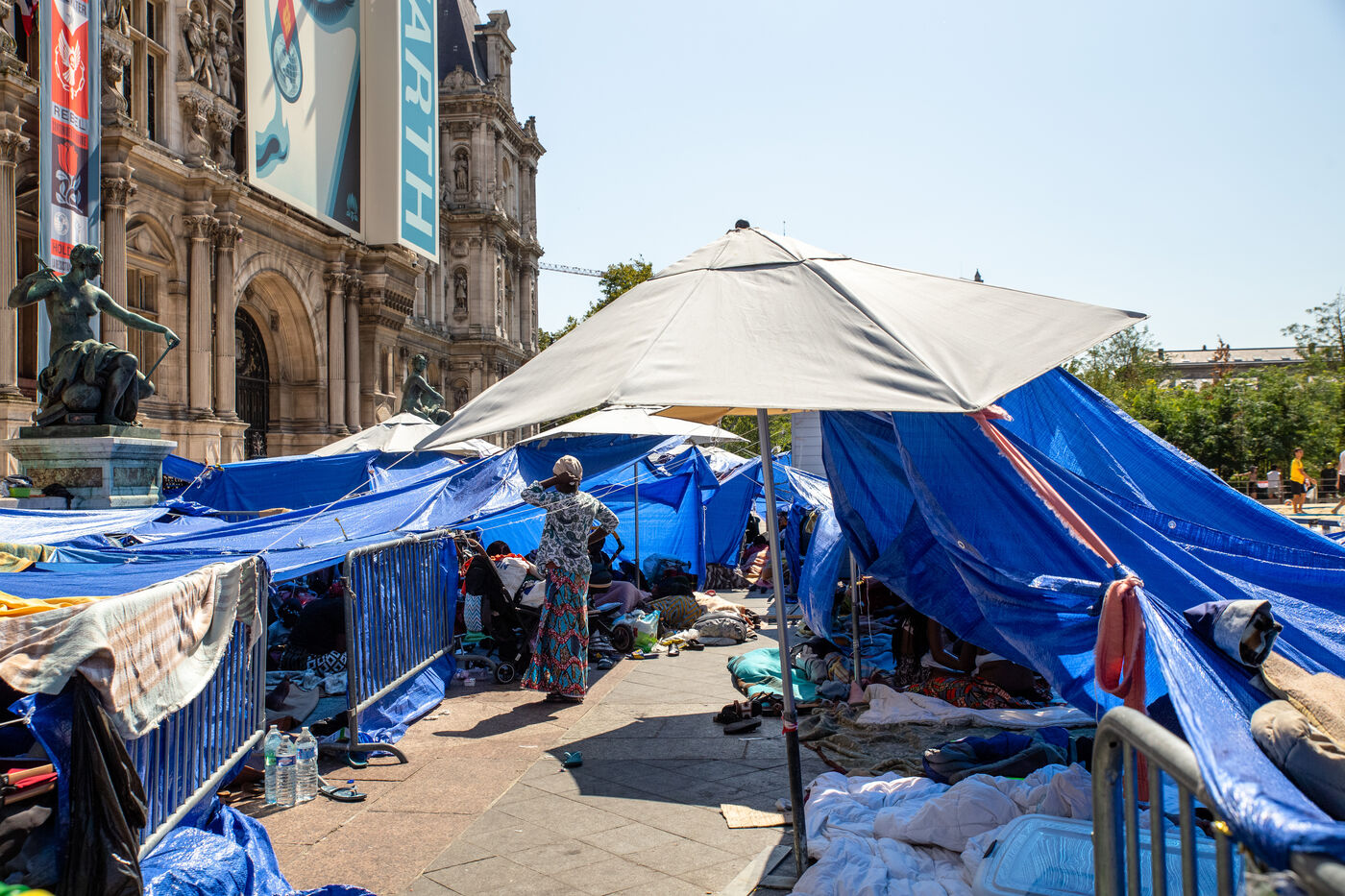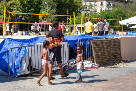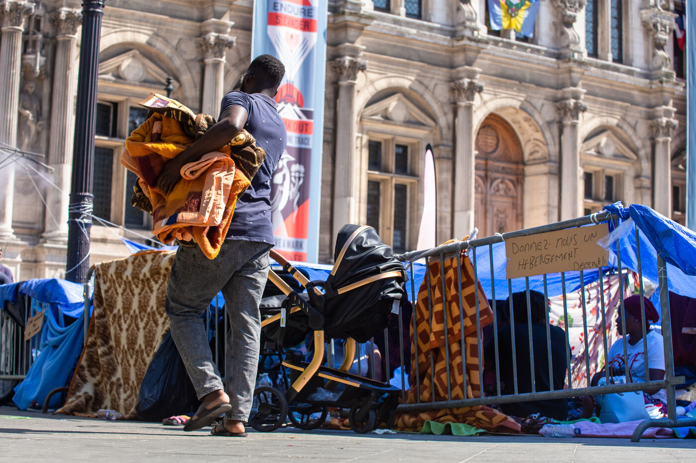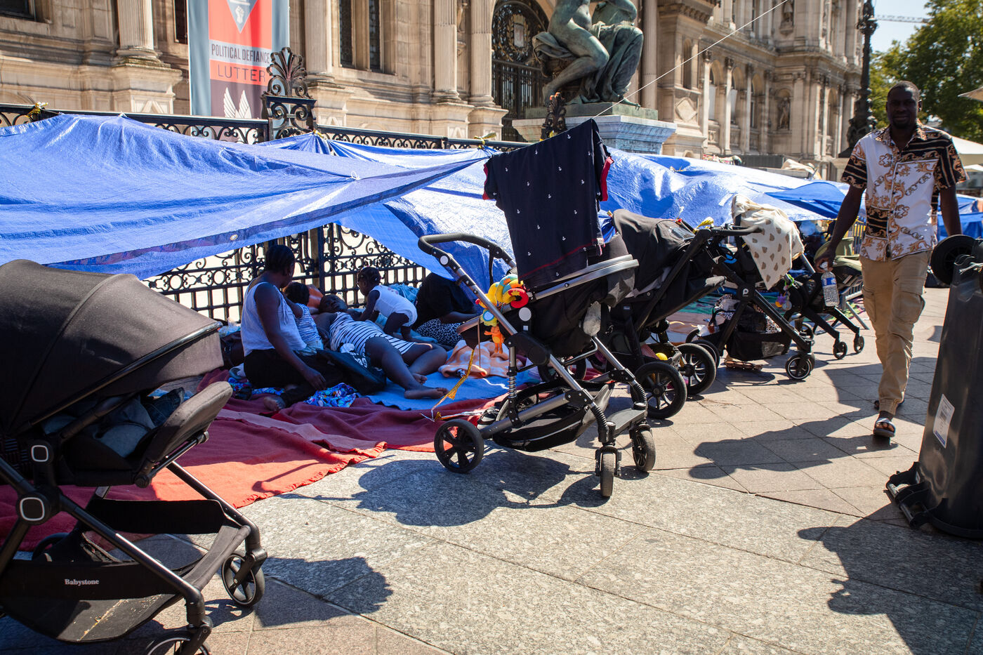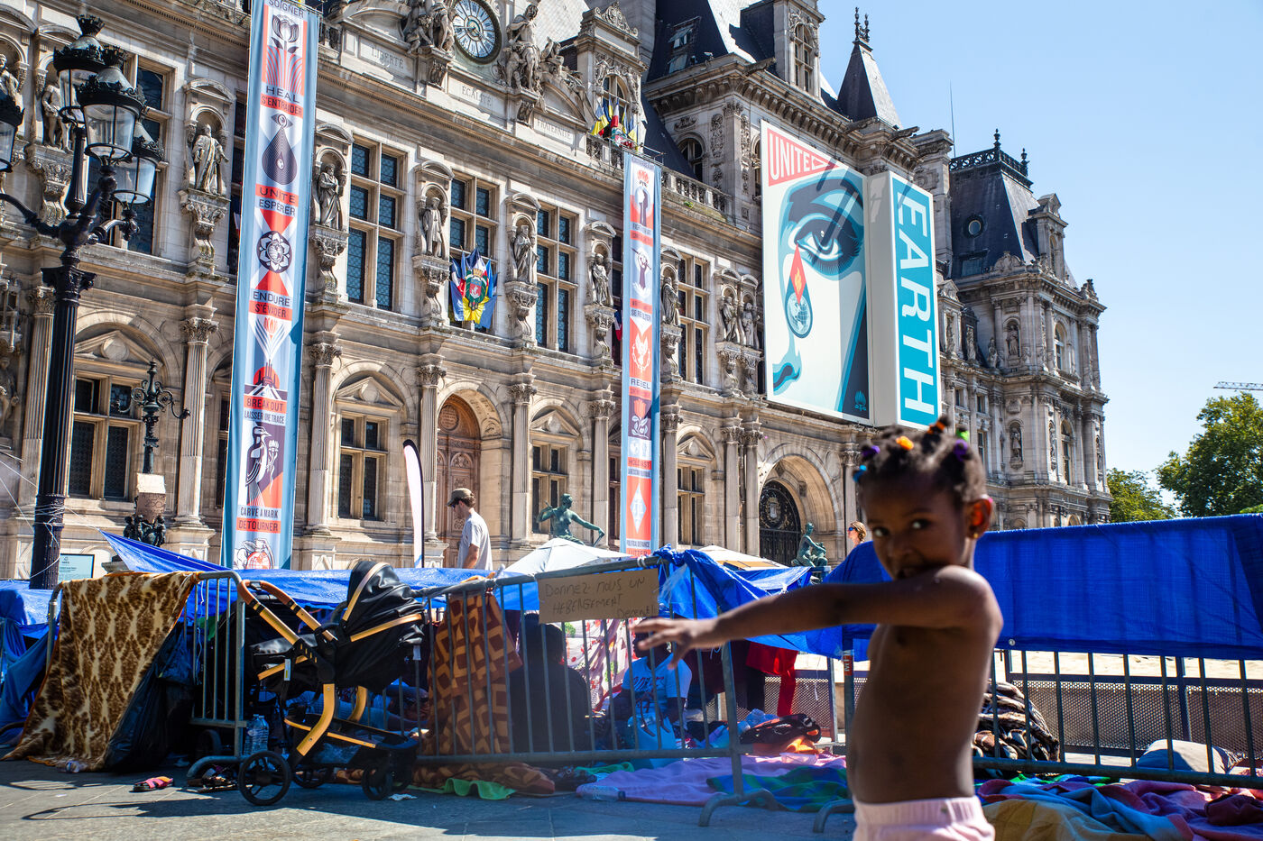 France, Paris, City Hall, August 11, 2025. More than 250 people, mostly families or single women with children, have been occupying the square in front of Paris City Hall for a week. With the help of the Utopia 56 association, they are camping in front of Paris City Hall to obtain decent emergency accommodation.