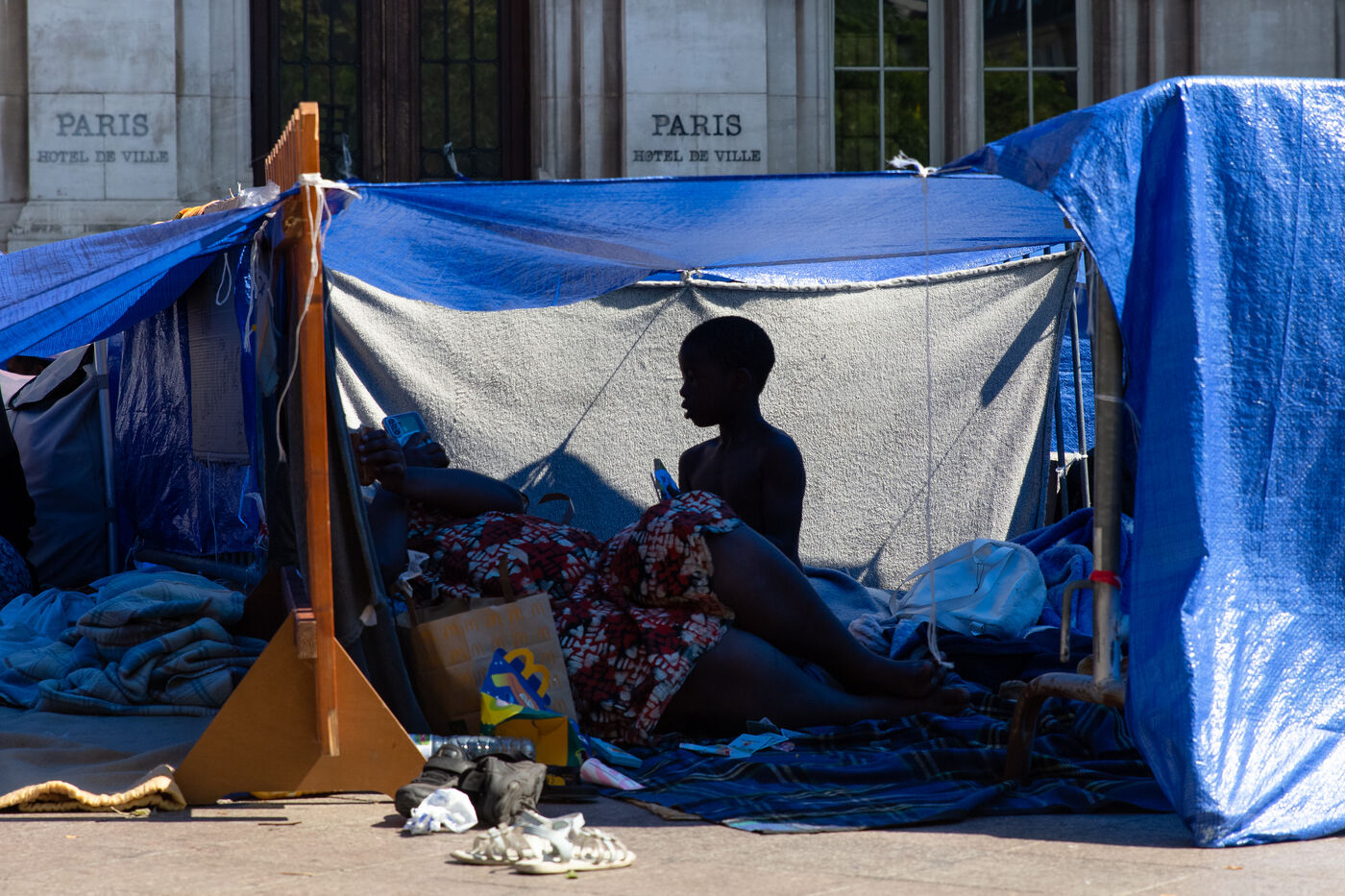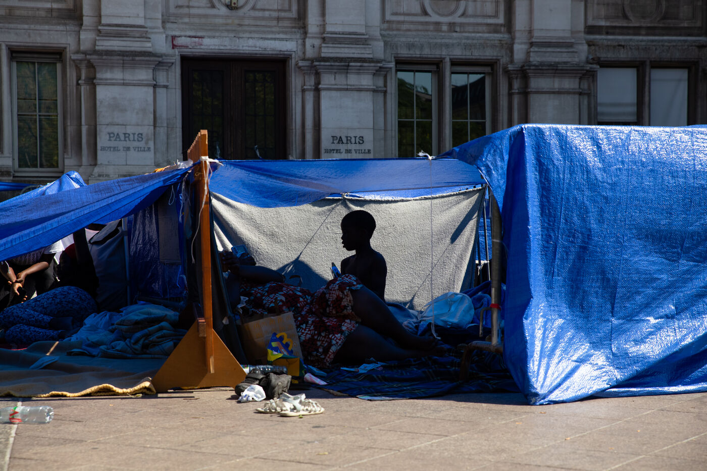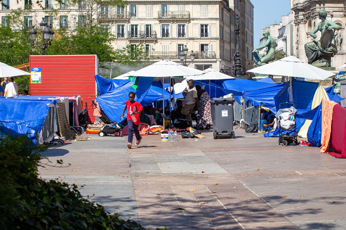 France, Paris, City Hall, August 11, 2025. More than 250 people, mostly families or single women with children, have been occupying the square in front of Paris City Hall for a week. With the help of the Utopia 56 association, they are camping in front of Paris City Hall to obtain decent emergency accommodation.