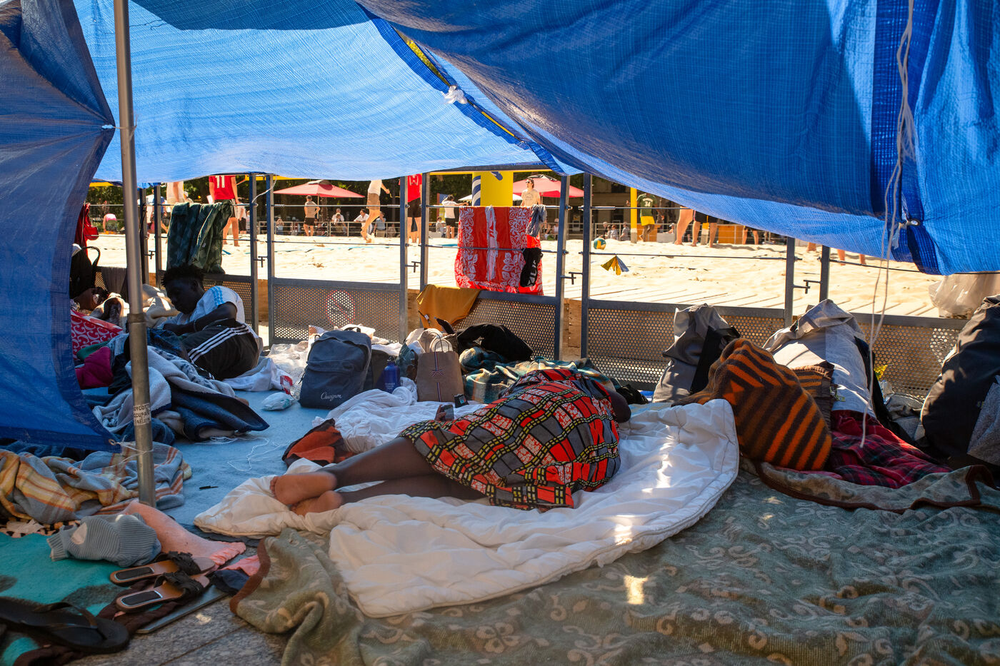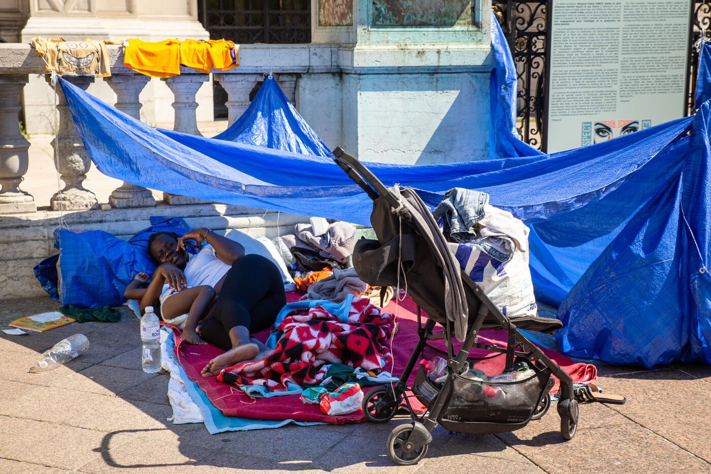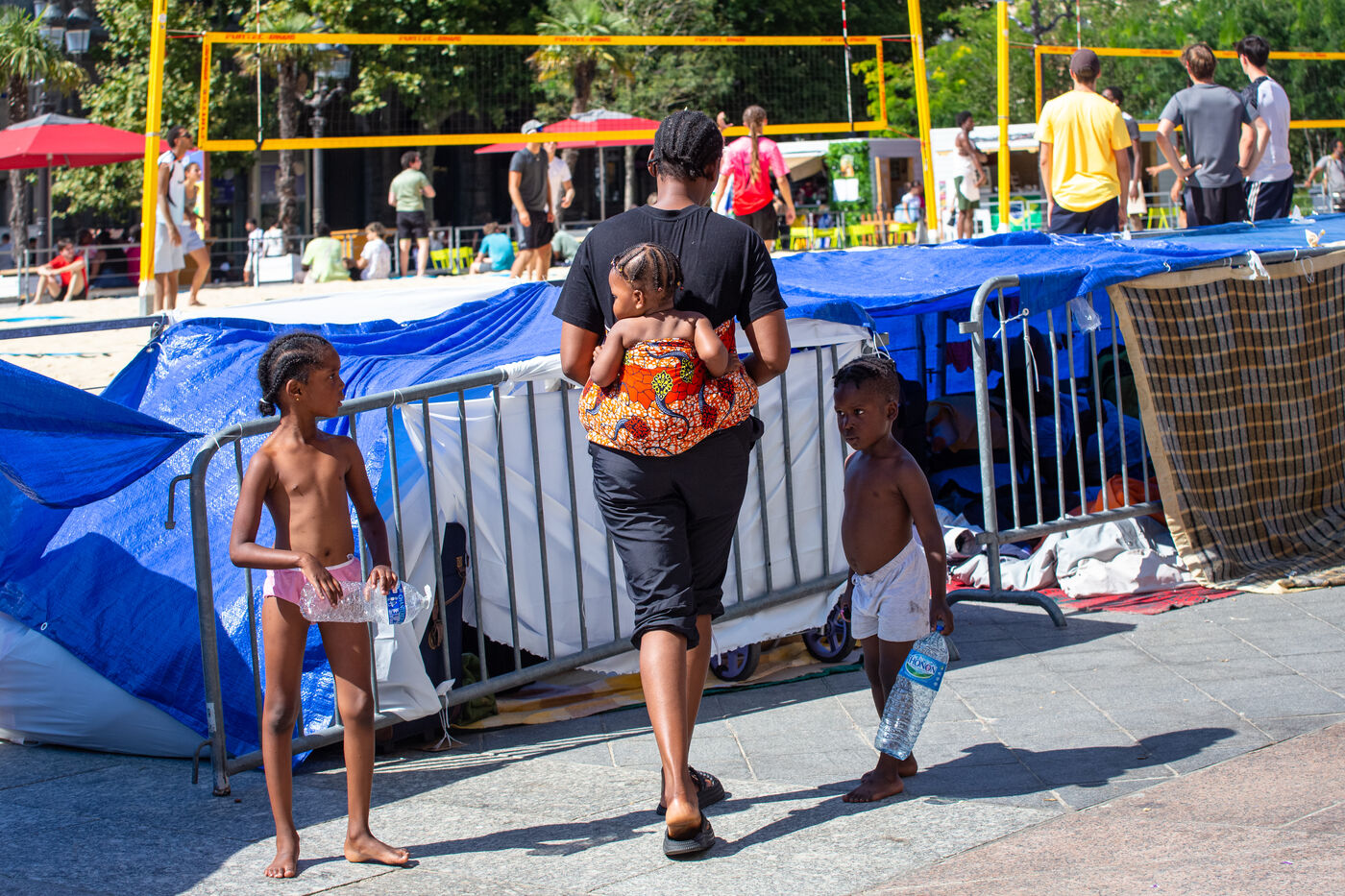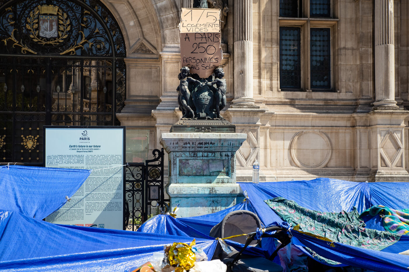 France, Paris, City Hall, August 11, 2025. More than 250 people, mostly families or single women with children, have been occupying the square in front of Paris City Hall for a week. With the help of the Utopia 56 association, they are camping in front of Paris City Hall to obtain decent emergency accommodation.