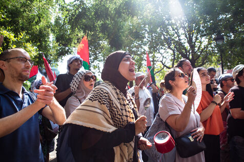 France, Paris, le 9 Aout 2025. Rassemblement pour la Palestine. Malgre la treve estivale, plusieurs centaines de citoyens continuent de se mobiliser en solidarite avec le peuple palestinien. Ils alertent sur le genocide et la famine en cours a Gaza, reclament un cessez-le-feu et des sanctions contre le regime israelien.