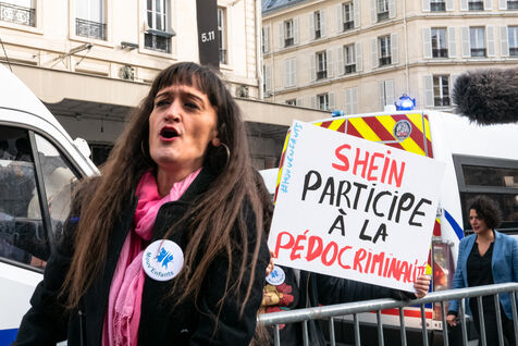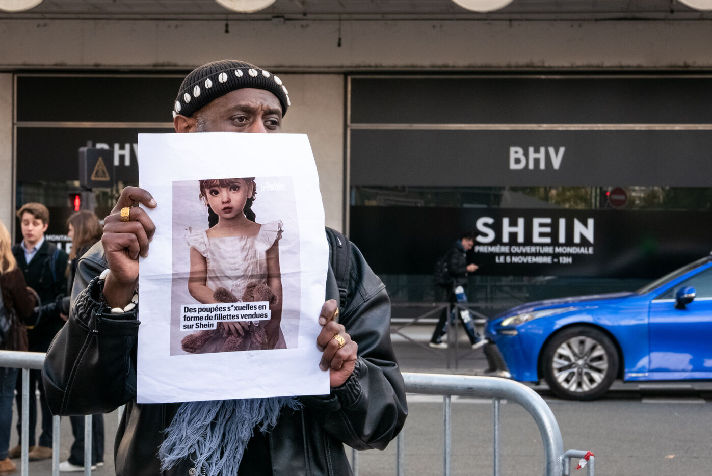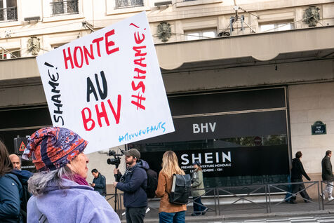 France, Paris, November 5, 2025. Shein opens its first physical store in the famous Parisian department store BHV. Protesters disrupted the highly controversial inauguration of the brand's corner, which is at the center of several controversies. The Chinese giant is implicated in several cases involving social and environmental rights: forced labor of Uyghurs, non-compliant and dangerous products, arms sales, and complicity in pedocriminality.