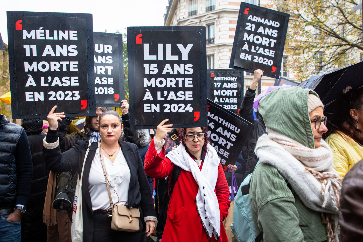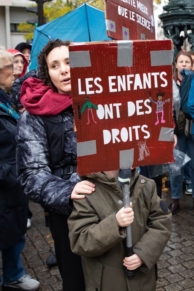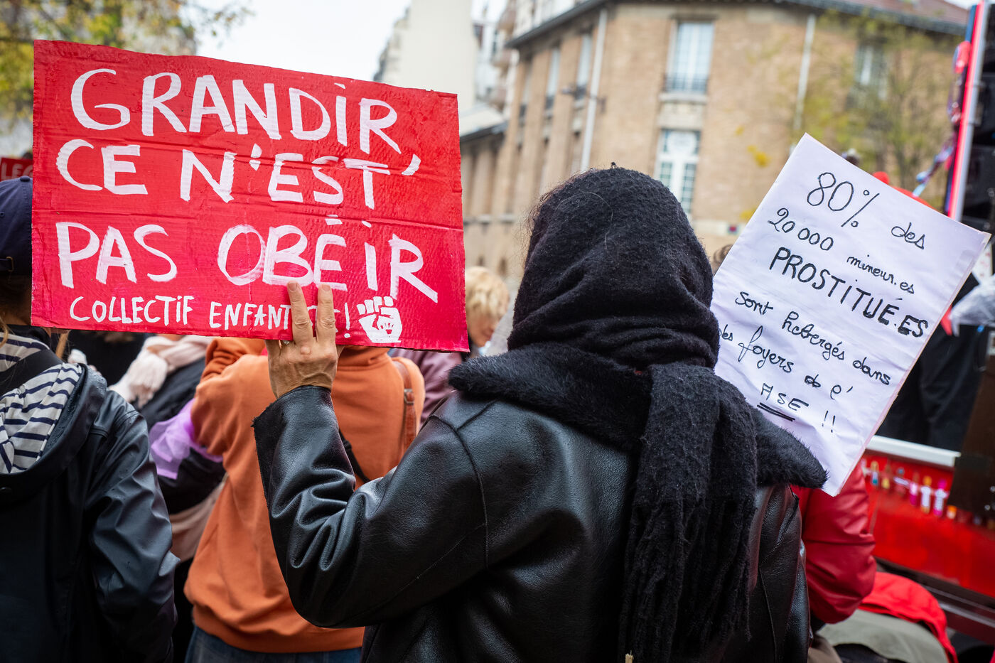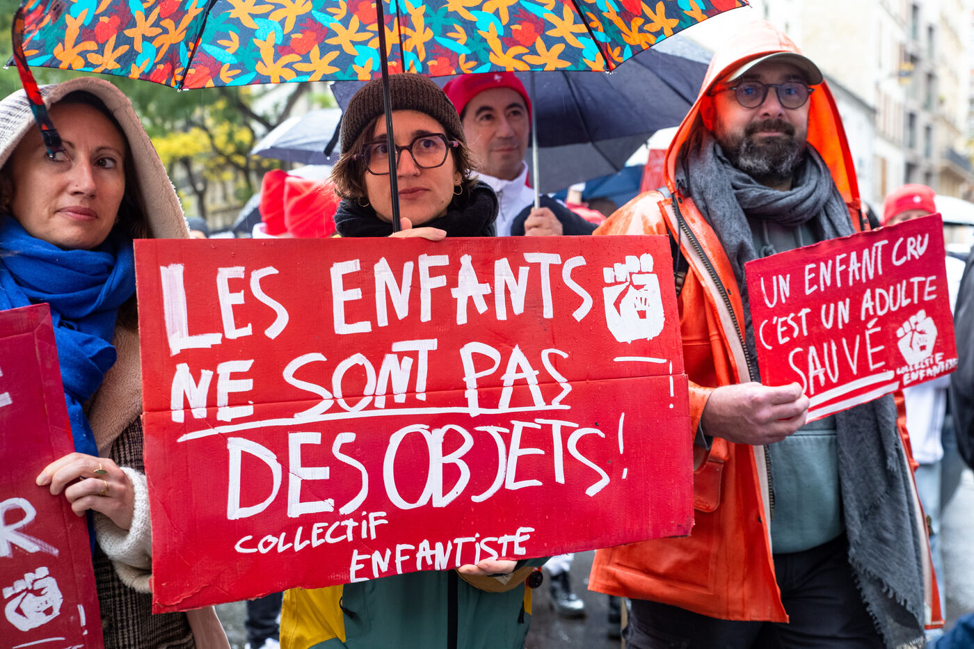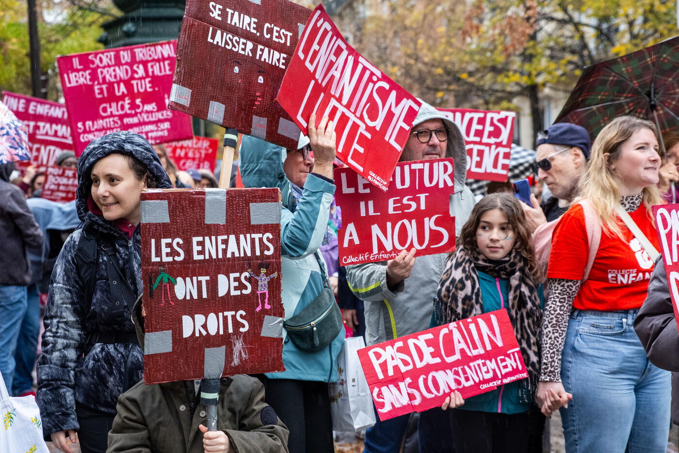 France, Paris, November 15, 2025. National demonstration called by the child protection collective against violence against children and adolescents. Associations, child protection professionals, activists, and victims came together to denounce adultism and multiple violations of children's rights. They are demanding justice for victims of sexual violence (rape, incest, pedophilia) and effective public policies for the protection of minors.