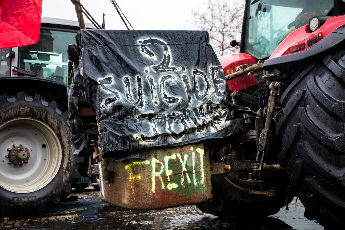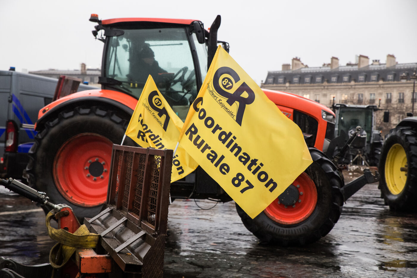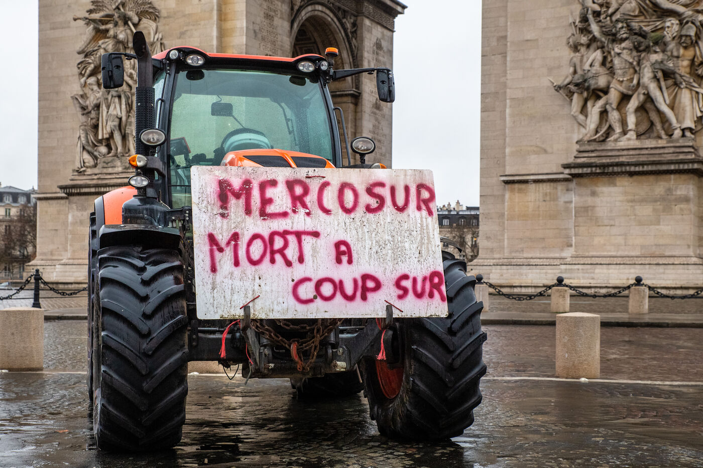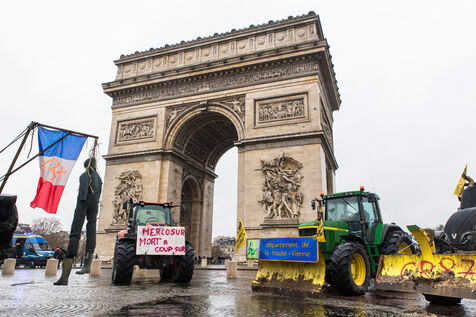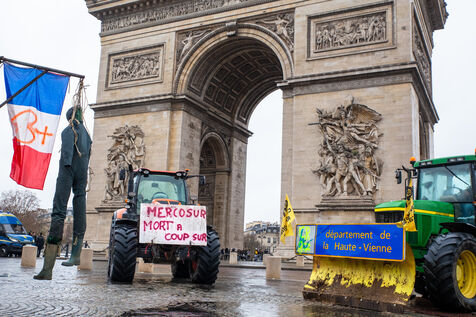 France, Paris, January 8, 2026. Demonstration by farmers organized by the French agricultural union Coordination Rurale CR. Tractors gather at the foot of the Arc de Triomphe to protest against the Mercosur trade agreement and the government's handling of the contagious nodular dermatitis (CND) epidemic.