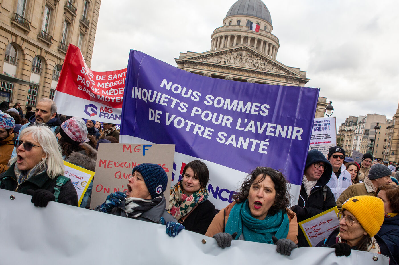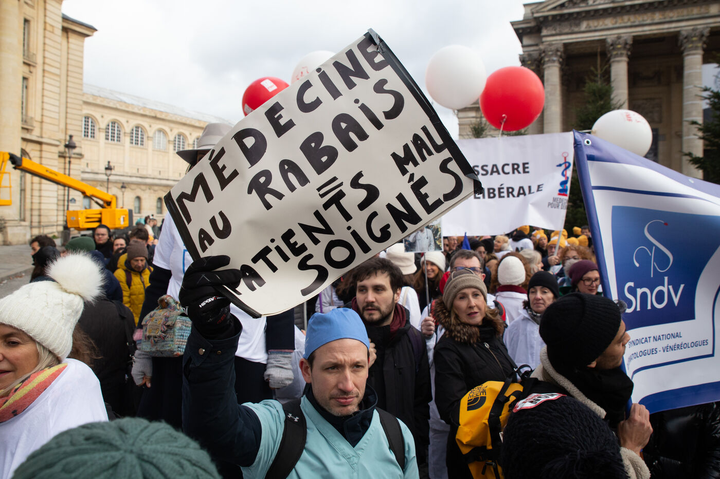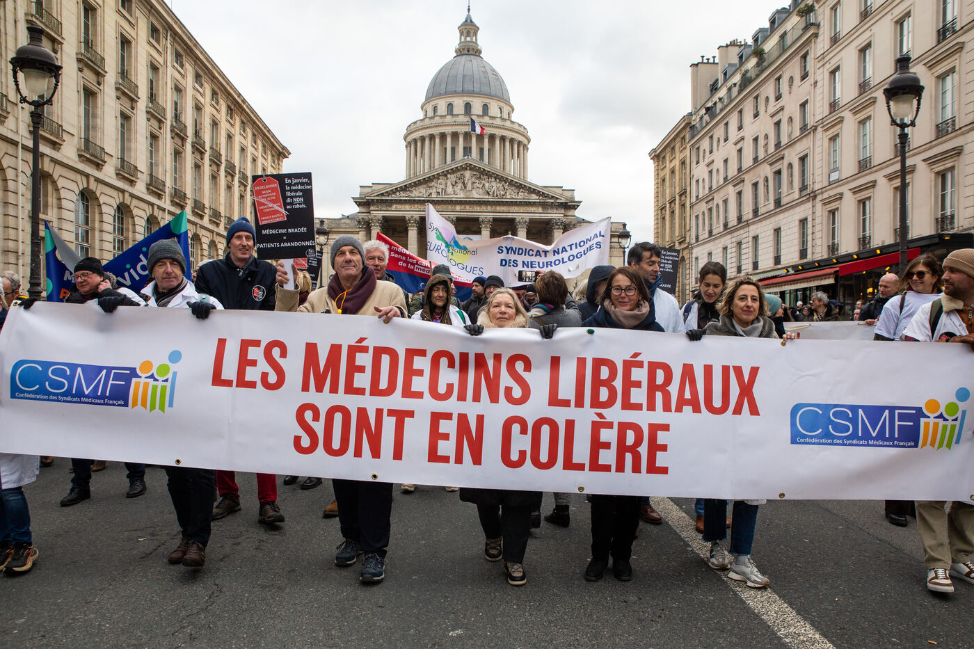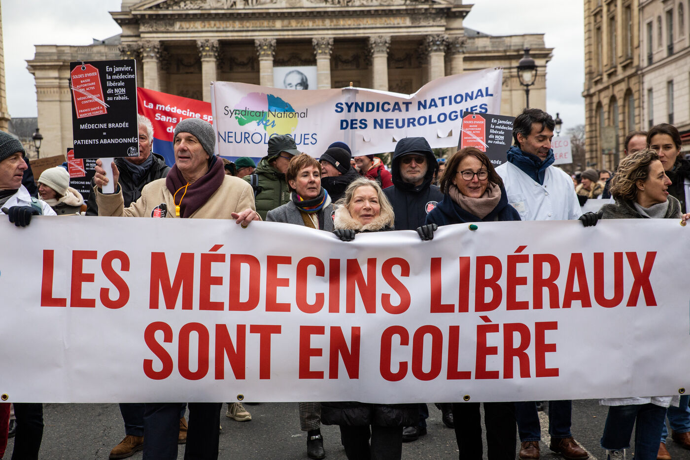 France, Paris, January 10, 2026. Strike and demonstration by private doctors against the 2026 Social Security Financing Bill (PLFSS) and the anti-fraud bill.
