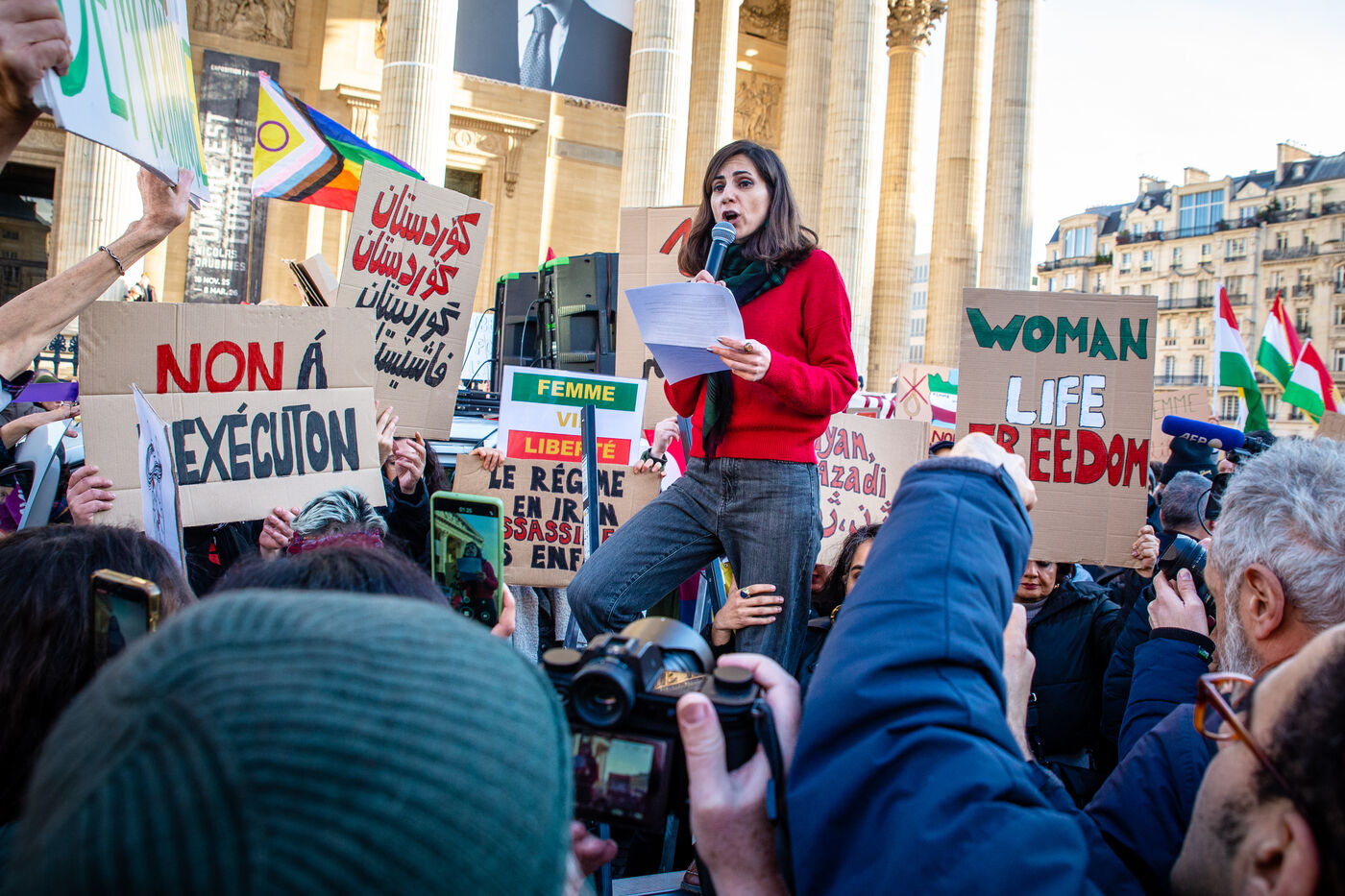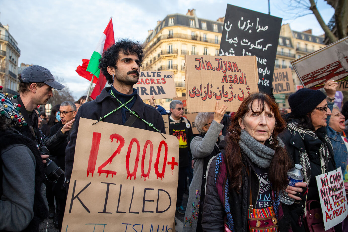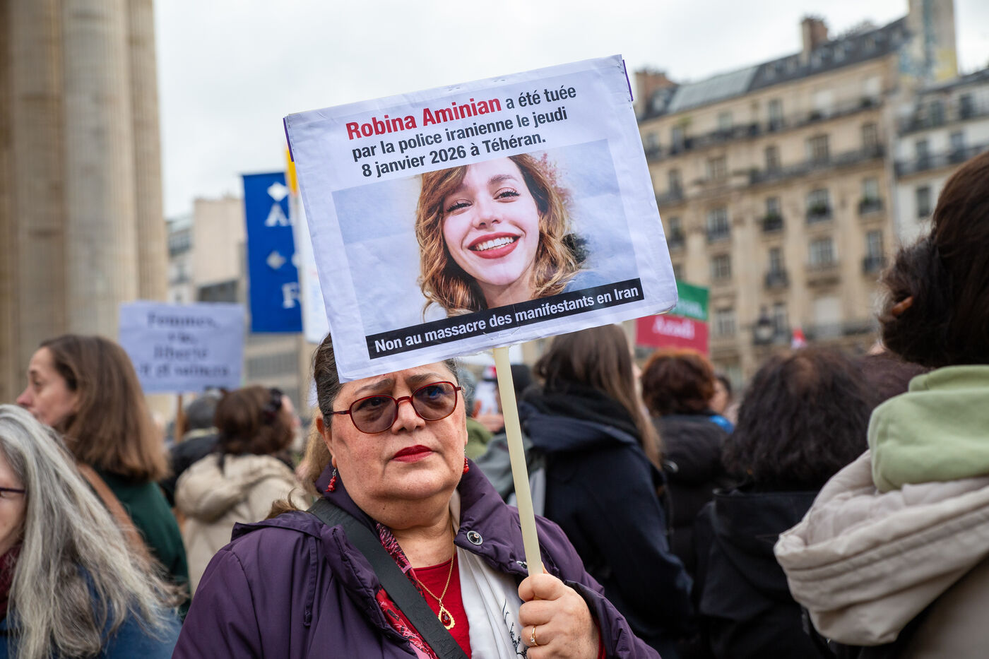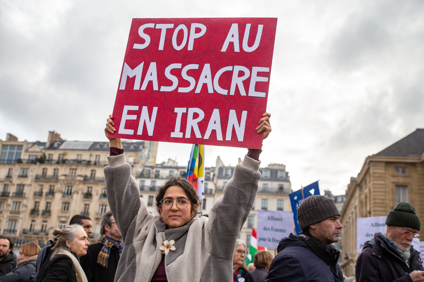 France, Paris, place du Pantheon, le 17 Janvier 2026. Manifestation solidaire en soutien au peuple iranien, tres fortement reprime par le regime autoritaire theocratique des mollahs lors de recentes manifestations de contestation.